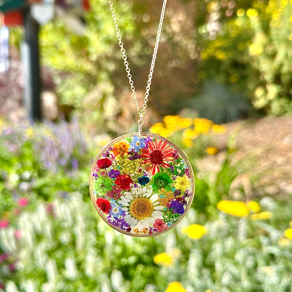 Each pendant holds real wildflowers, carefully hand-pressed and preserved in crystal-clear resin, like a sunlit memory from a meadow walk. ๐ผ๐ธ
