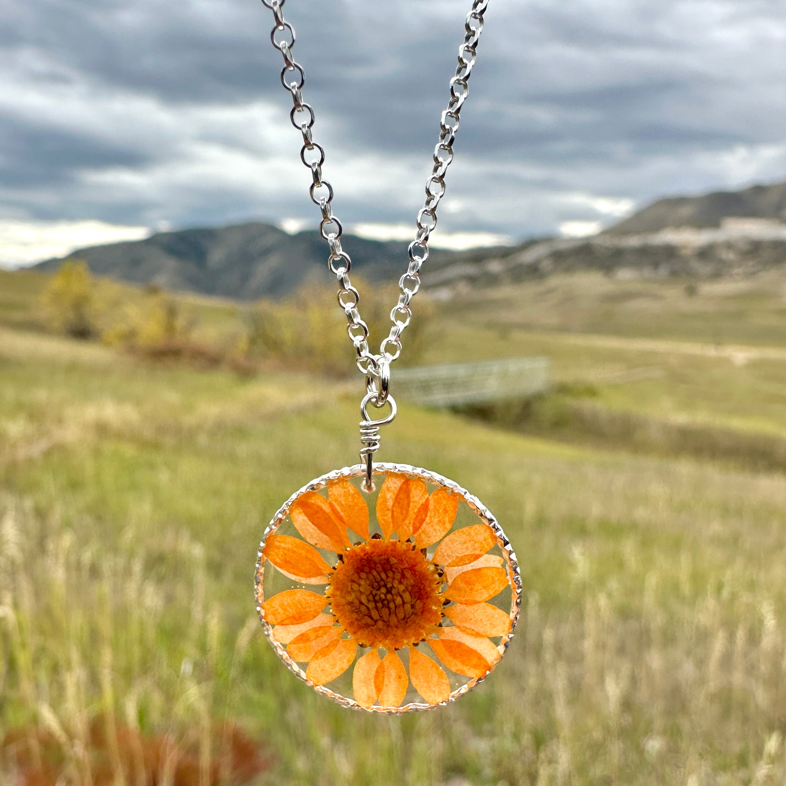 Bring a little piece of autumn with you wherever you go with our Orange Pressed Daisy Necklace, now crafted with genuine sterling silver for timeless quality and lasting beauty.