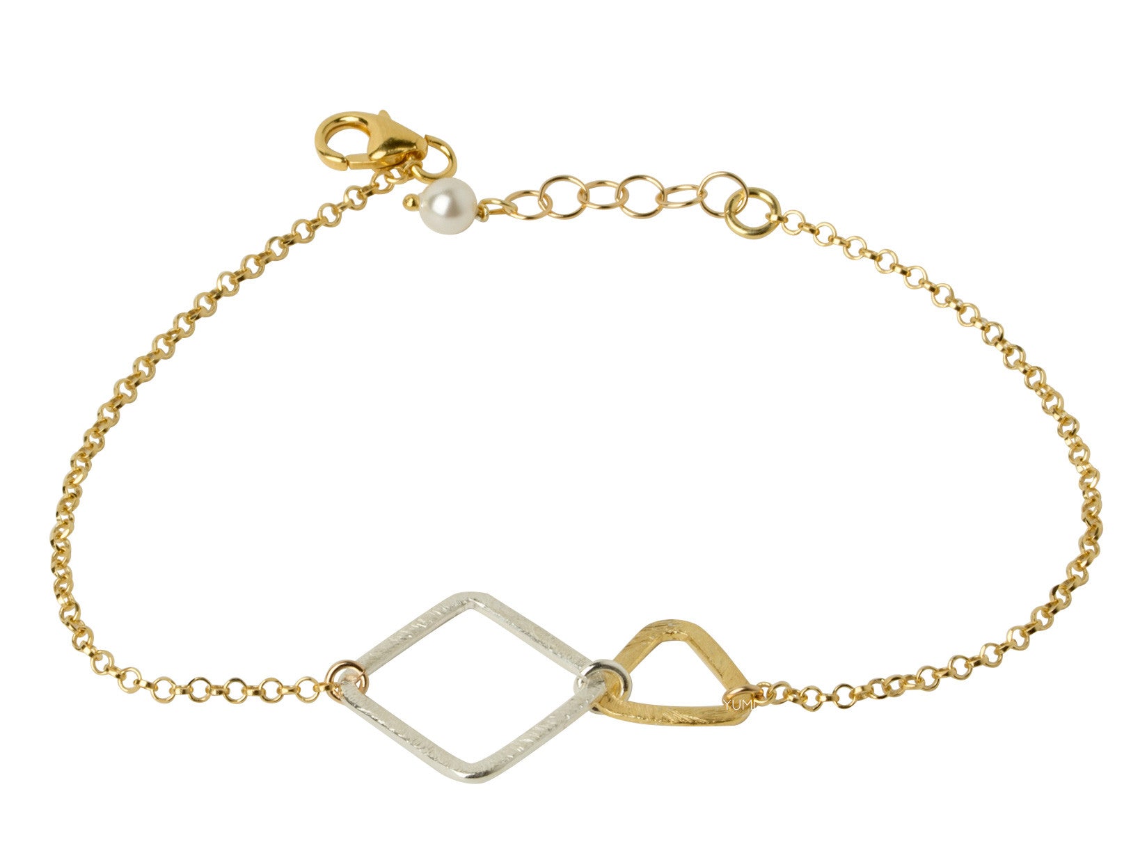 Sterling silver brushed metal diamond and 14kt gold-filled brushed metal triangle bracelet adorned on an adjustable 14kt gold-filled 6.5" - 7.5" chain (as shown). Also available with a sterling silver chain bracelet.