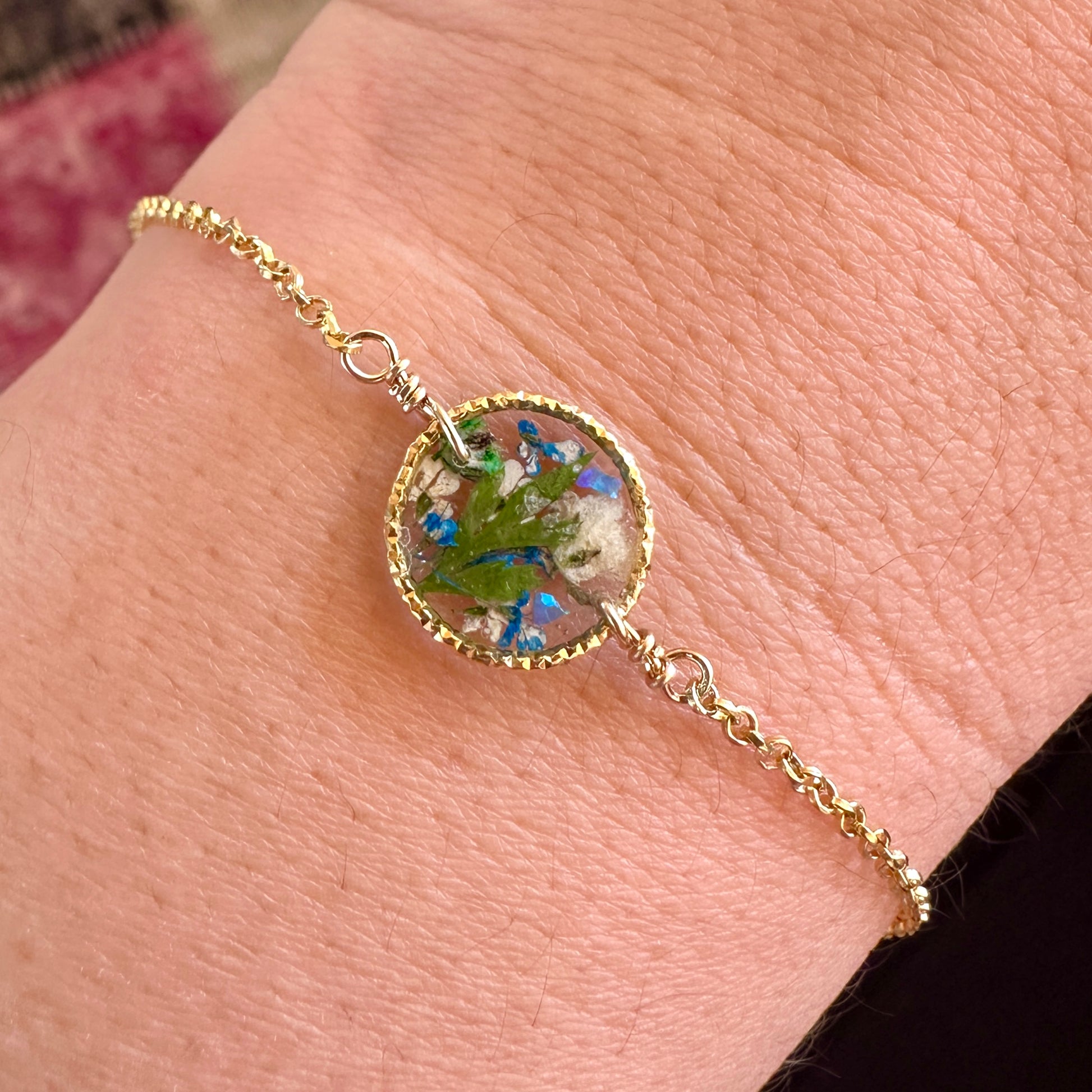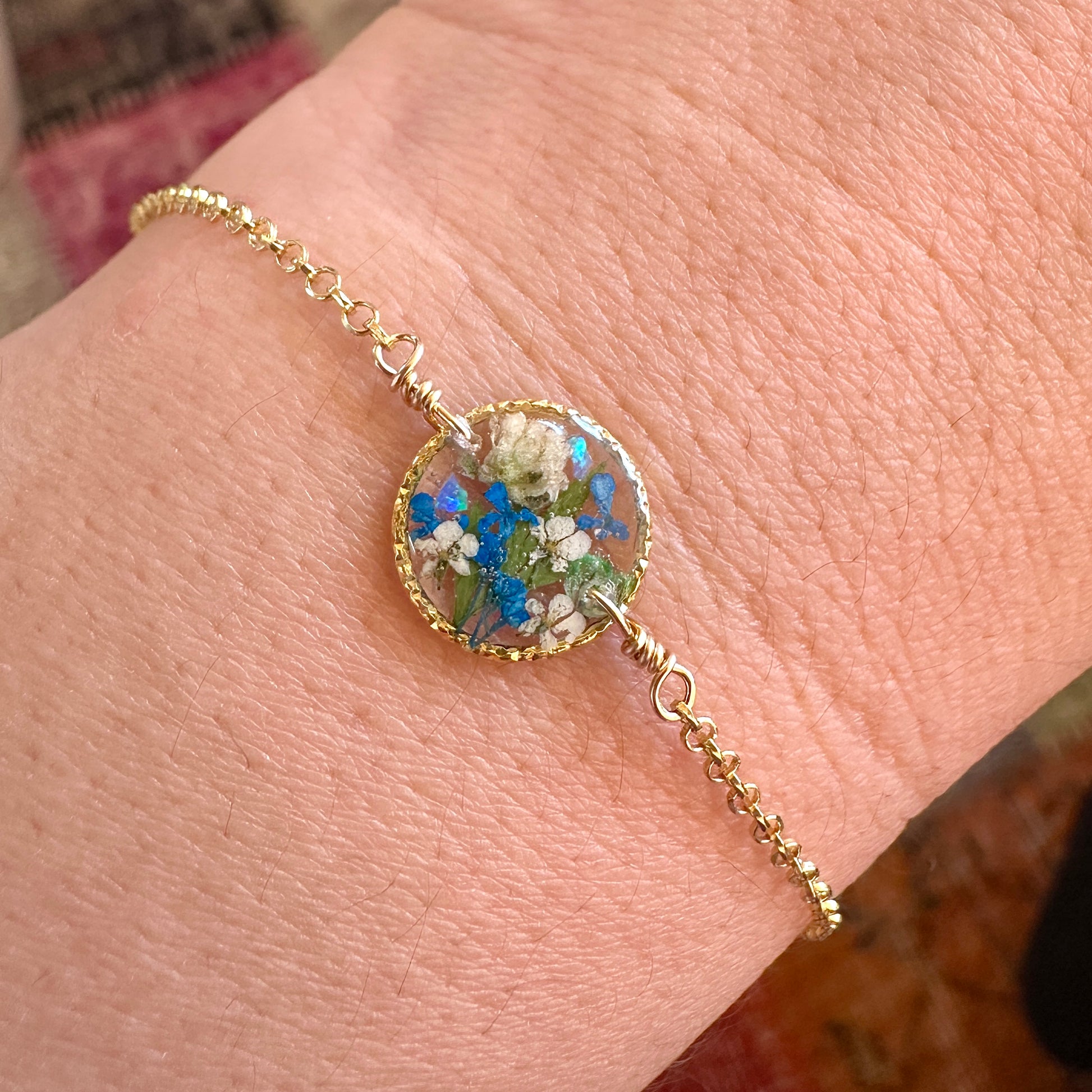 Blue and white botanical garden bracelet designed with blue and white queen anne’s lace flowers, green ferns and a sprinkle of iridescent natural opal gemstones preserved in resin.
