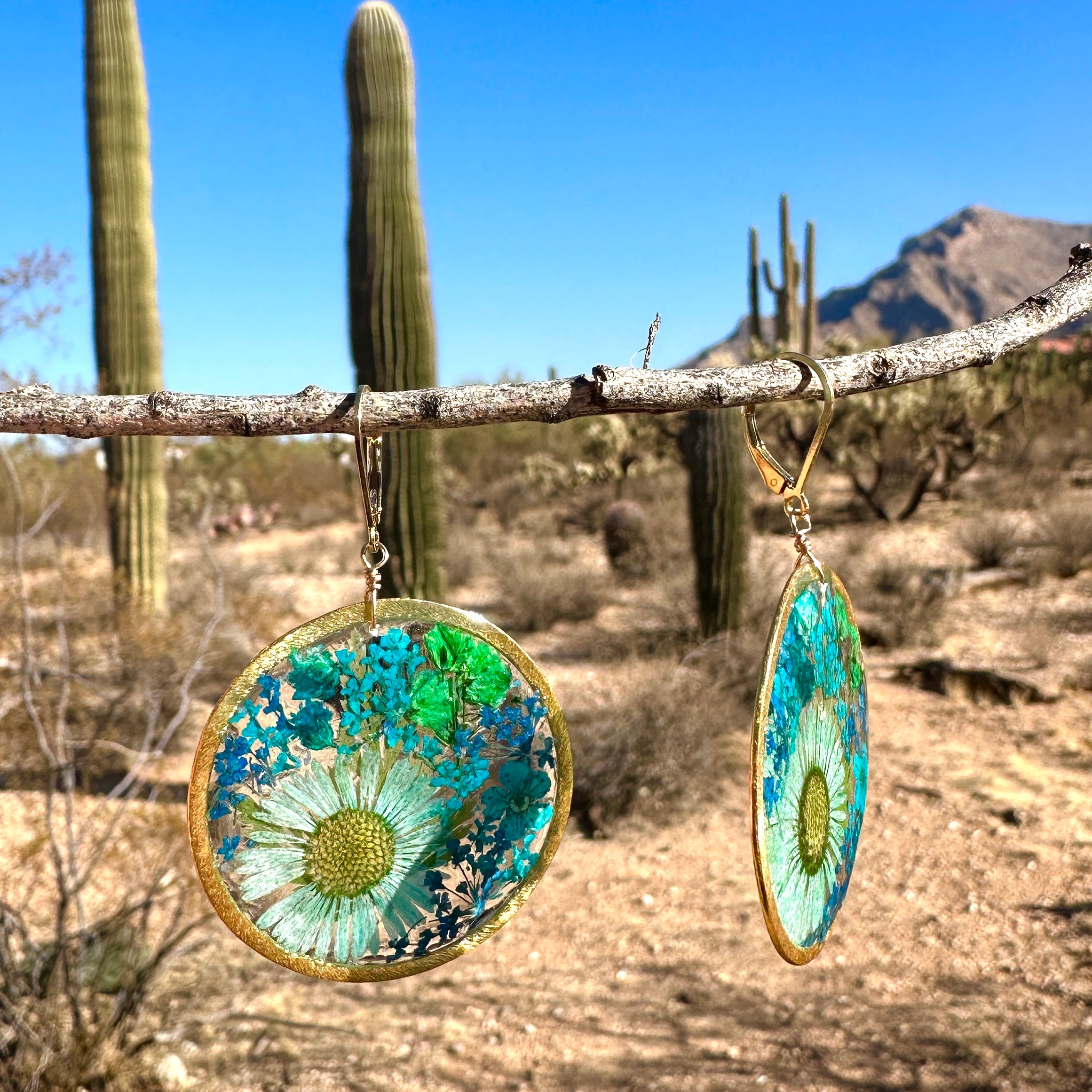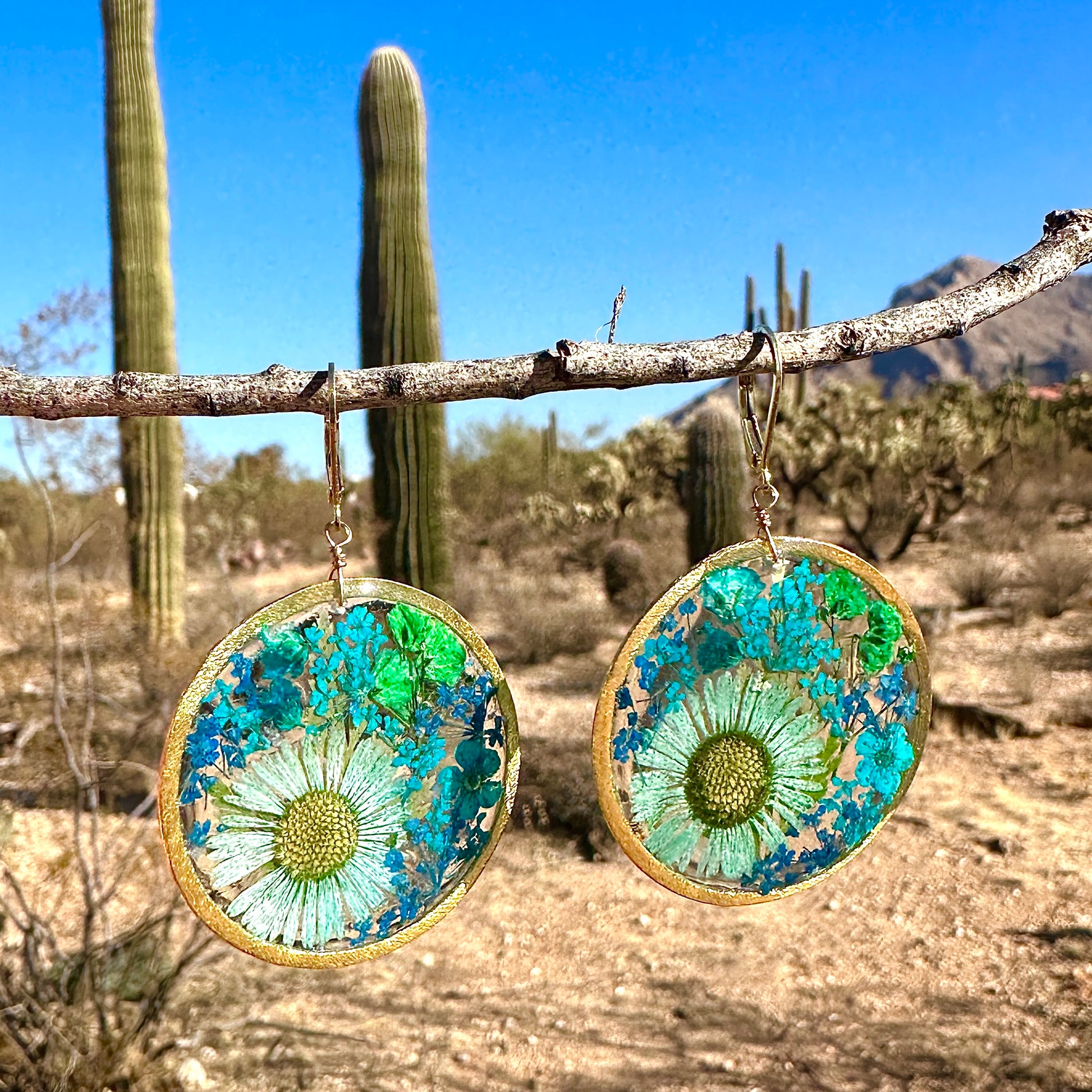 🌿 Stunning blue and green botanical garden flower earrings with natural baby’s breath, queen anne’s lace, forget me not flowers, daisies and ferns. The flowers are pressed, dried and preserved in resin.