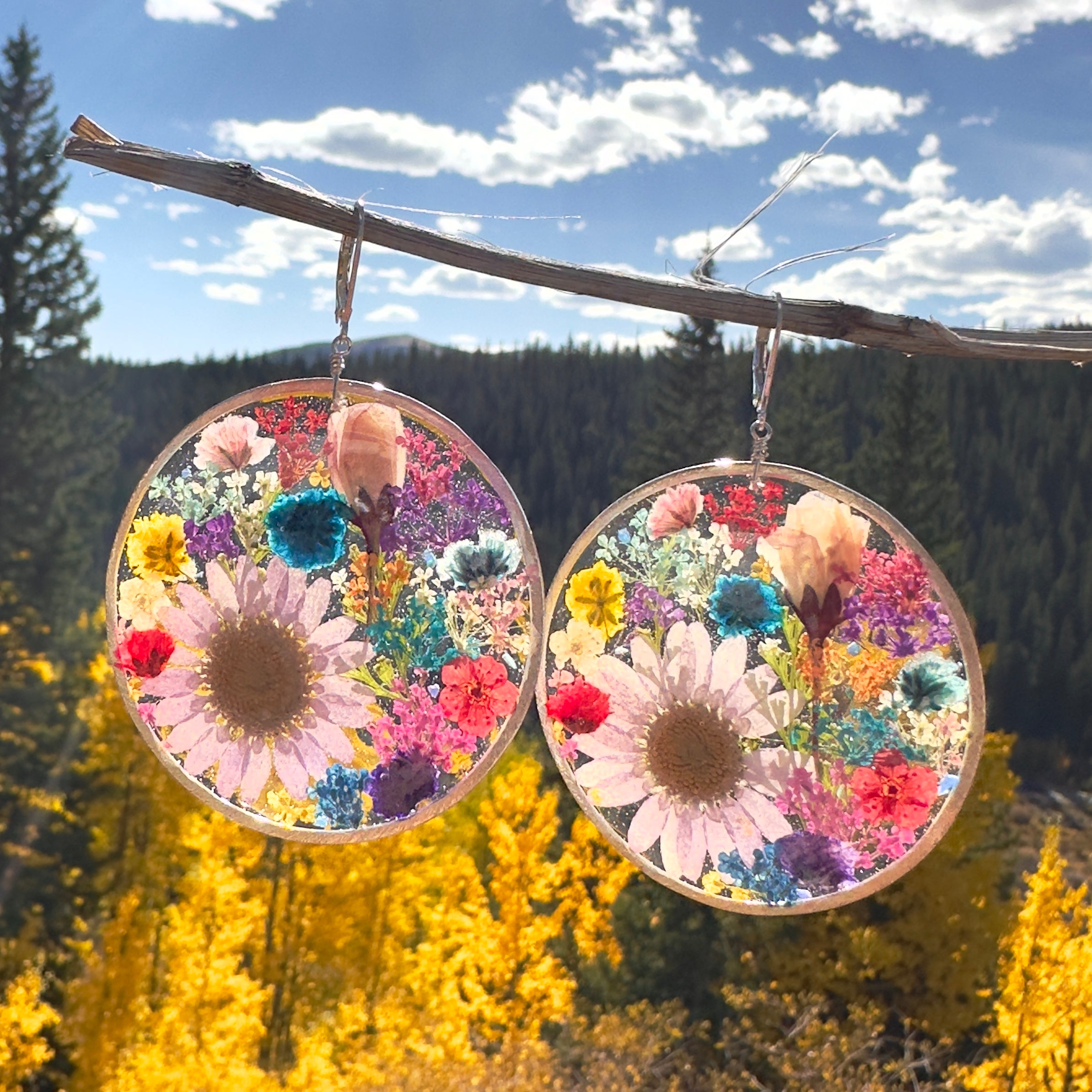🌿 One of a kind, vibrant botanical flower garden earrings designed with a whimsical assortment of wildflowers and natural ferns preserved in resin.