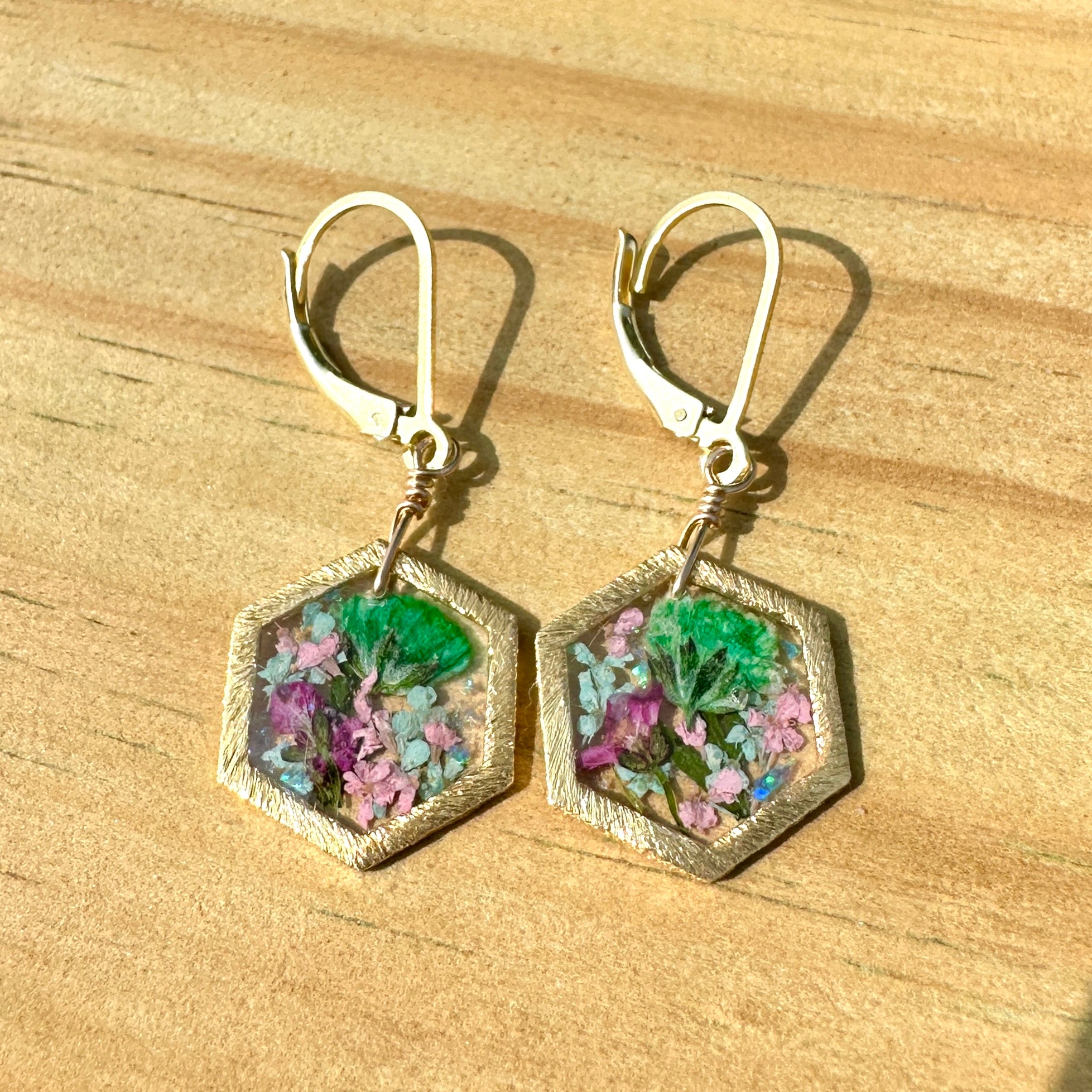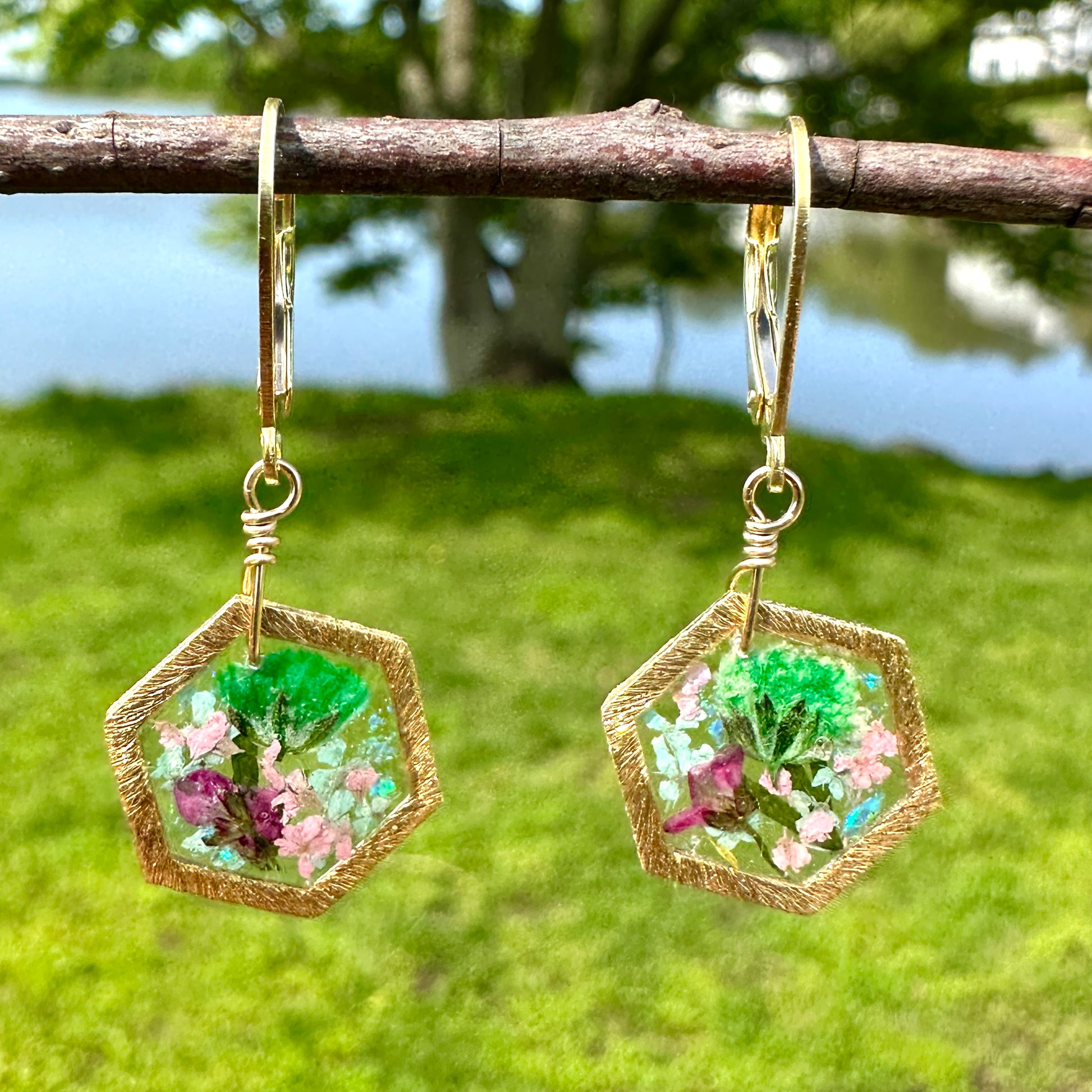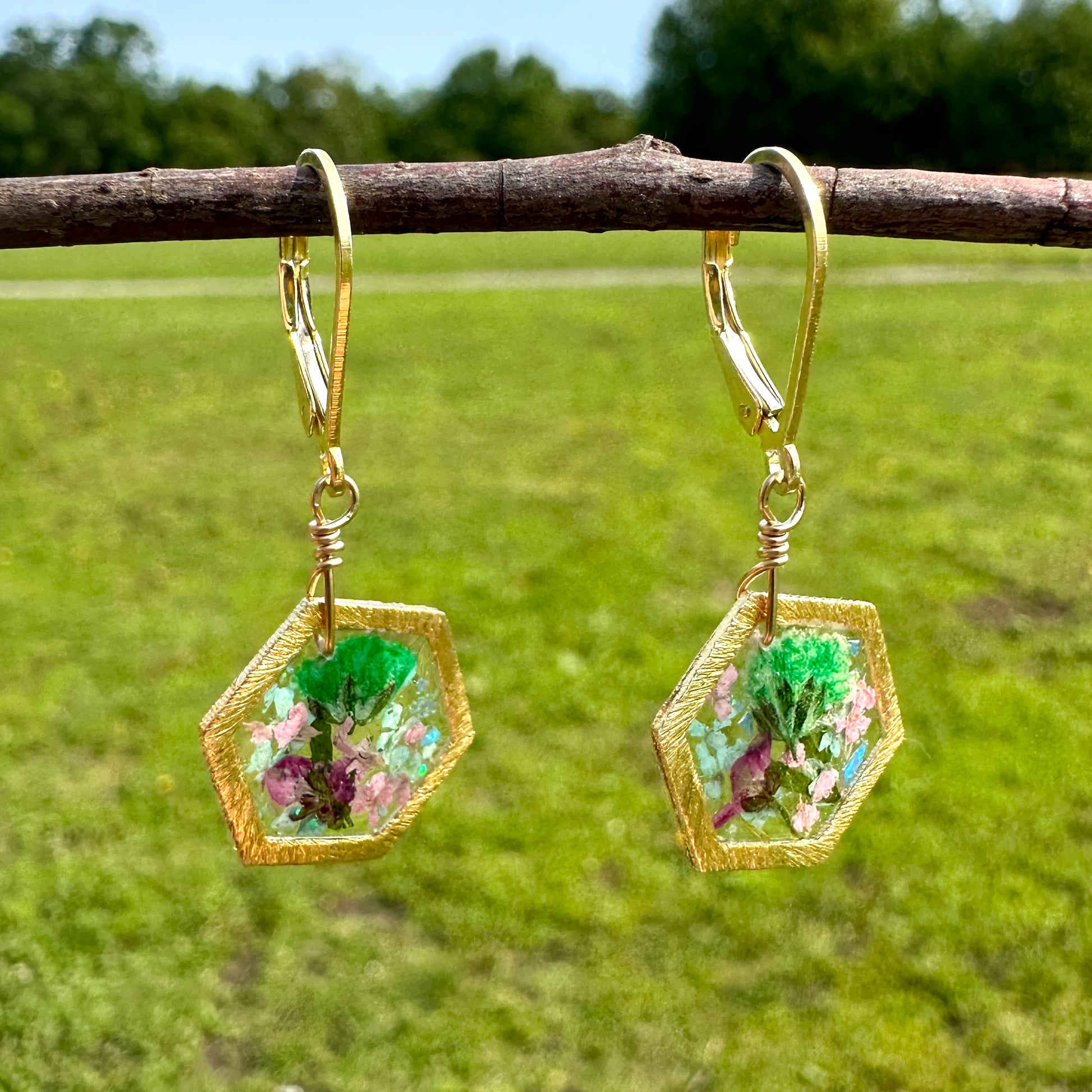 🌿 Elegant hexagon earrings with natural wildflowers and ferns preserved in resin.