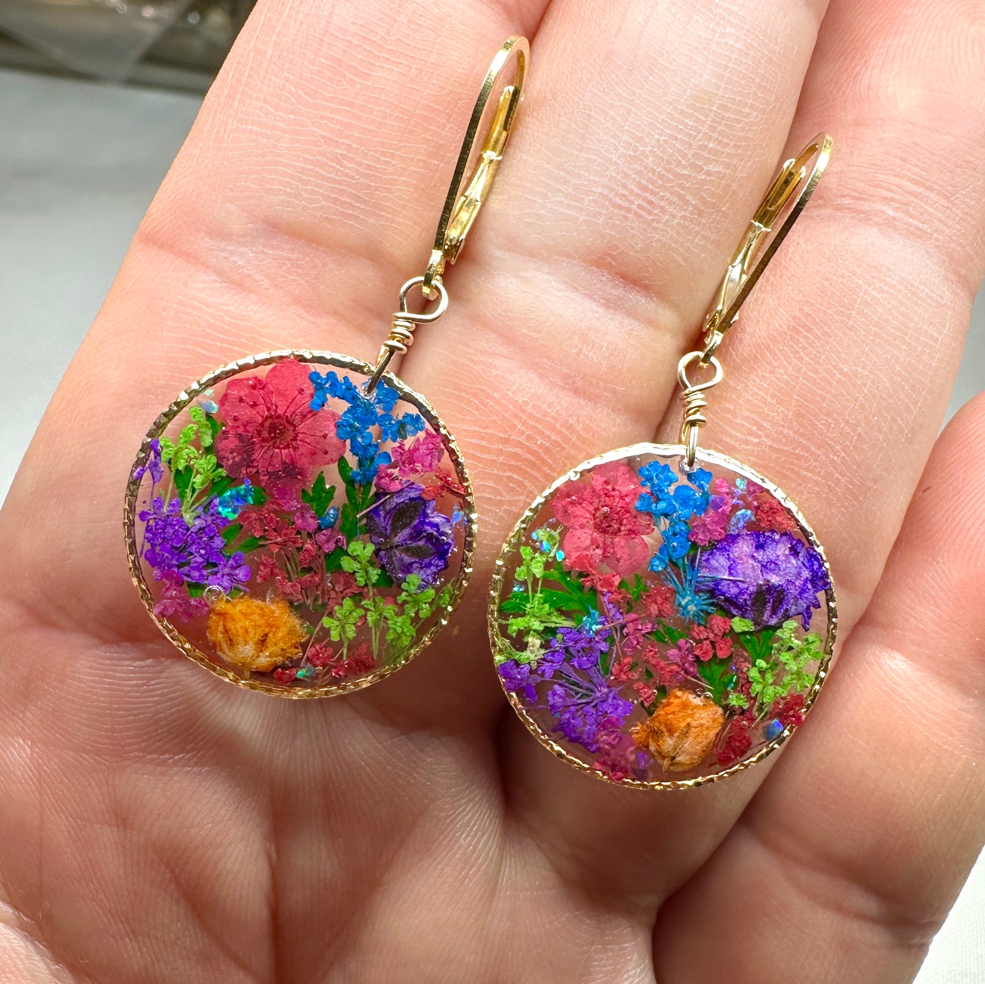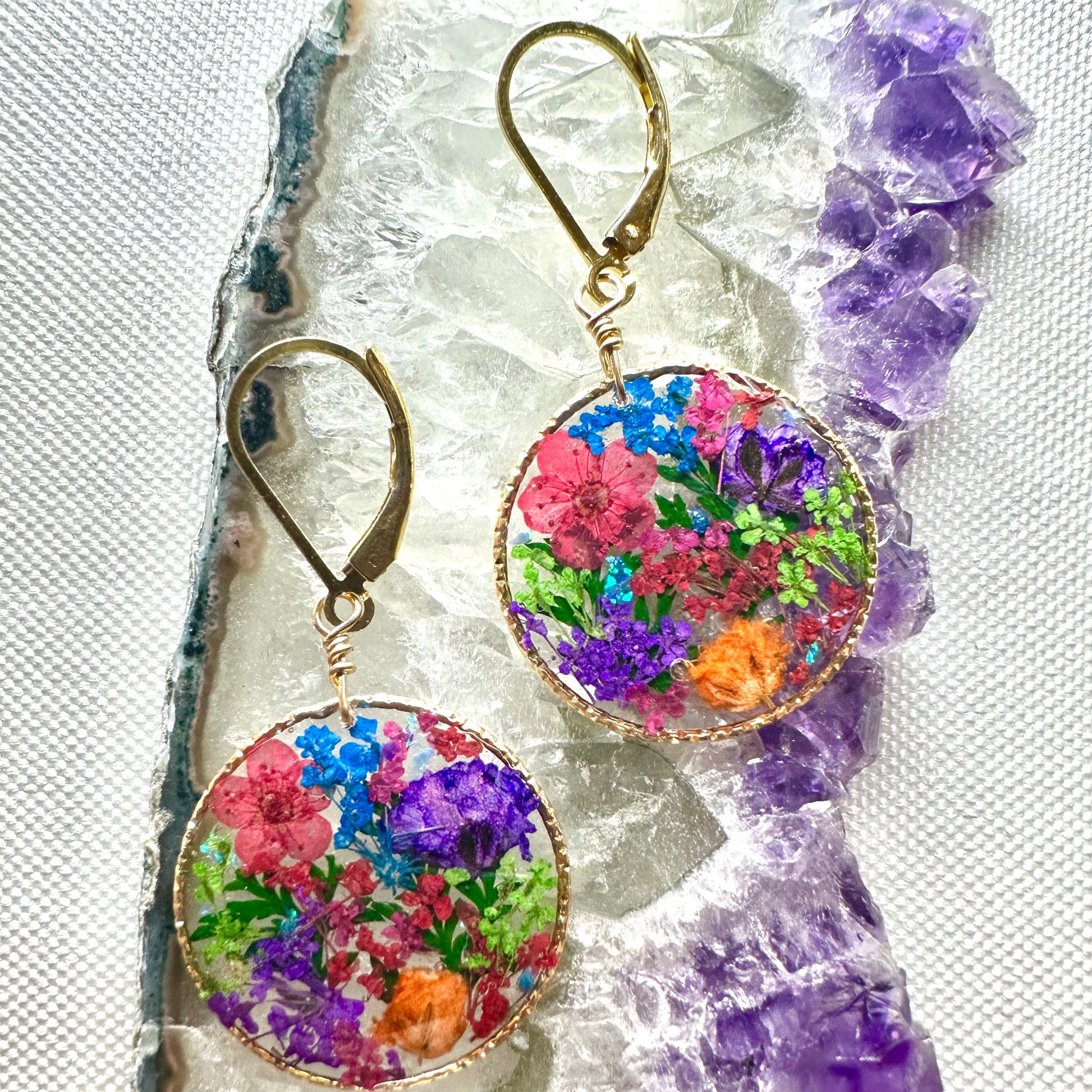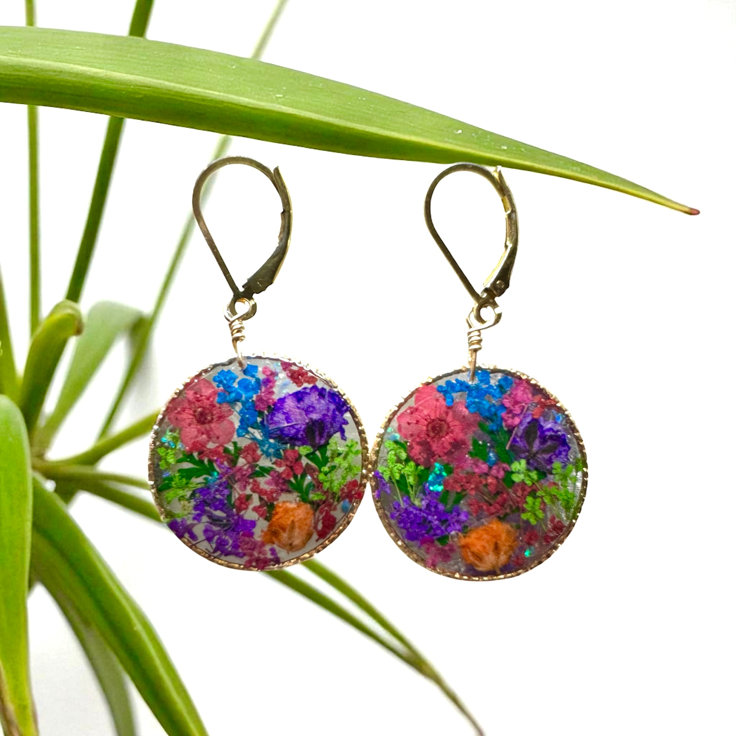 🌿Colorful botanical flower earrings created with pressed flowers and natural ferns preserved in resin.