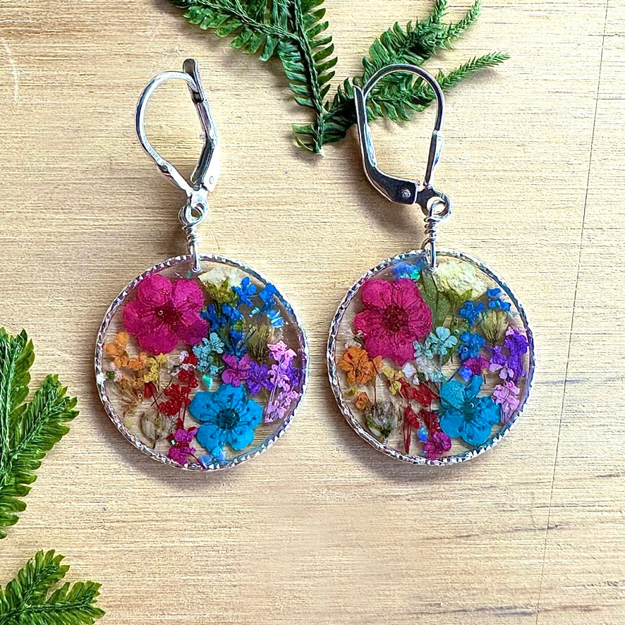 🌿 Handmade colorful, botanical flower garden earrings filled with real forget me not, queen anne’s lace, baby’s breath flowers and natural ferns preserved in resin.