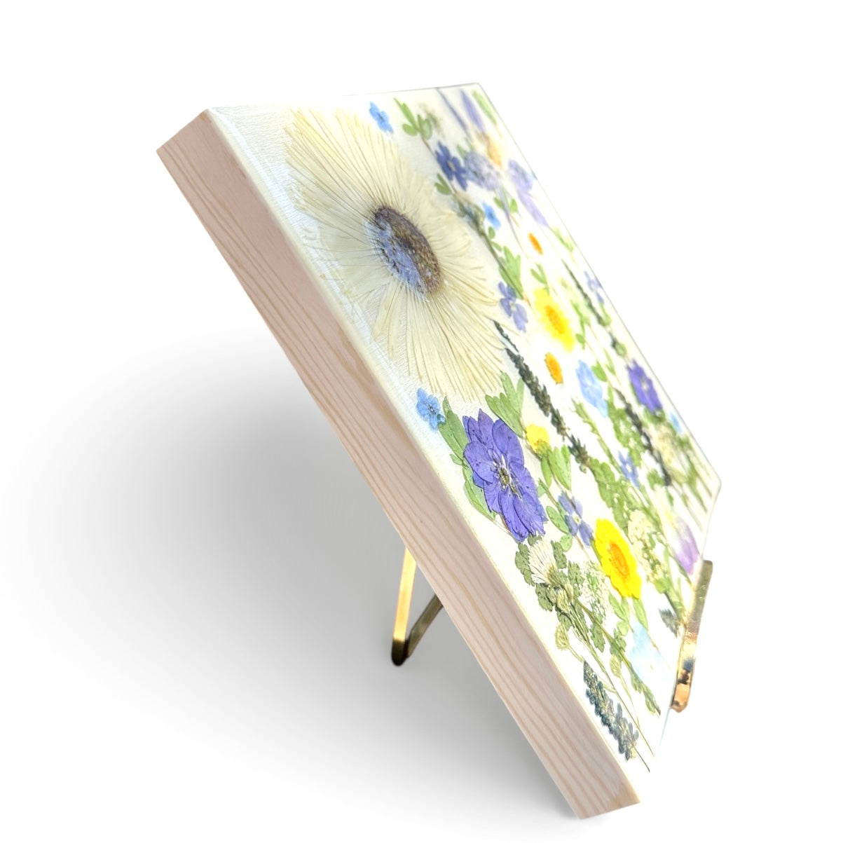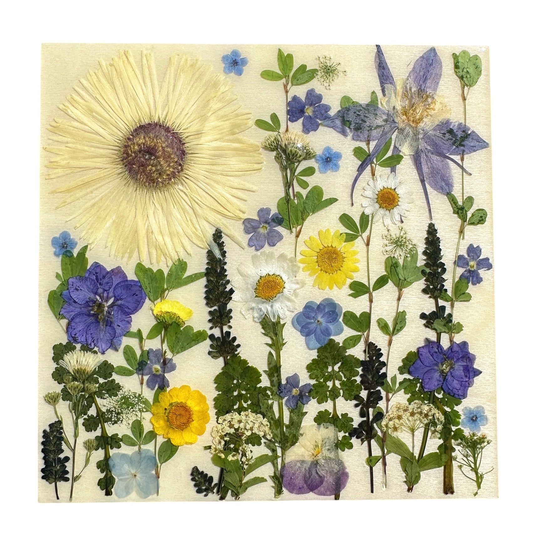 This piece features a vibrant collection of wildflowers in soft yellows, purples, blues, and greens, centered around a radiant sun-like bloom that adds warmth and balance to the design. Every petal and leaf is unique, preserving a fleeting moment of nature in a lasting piece of art.