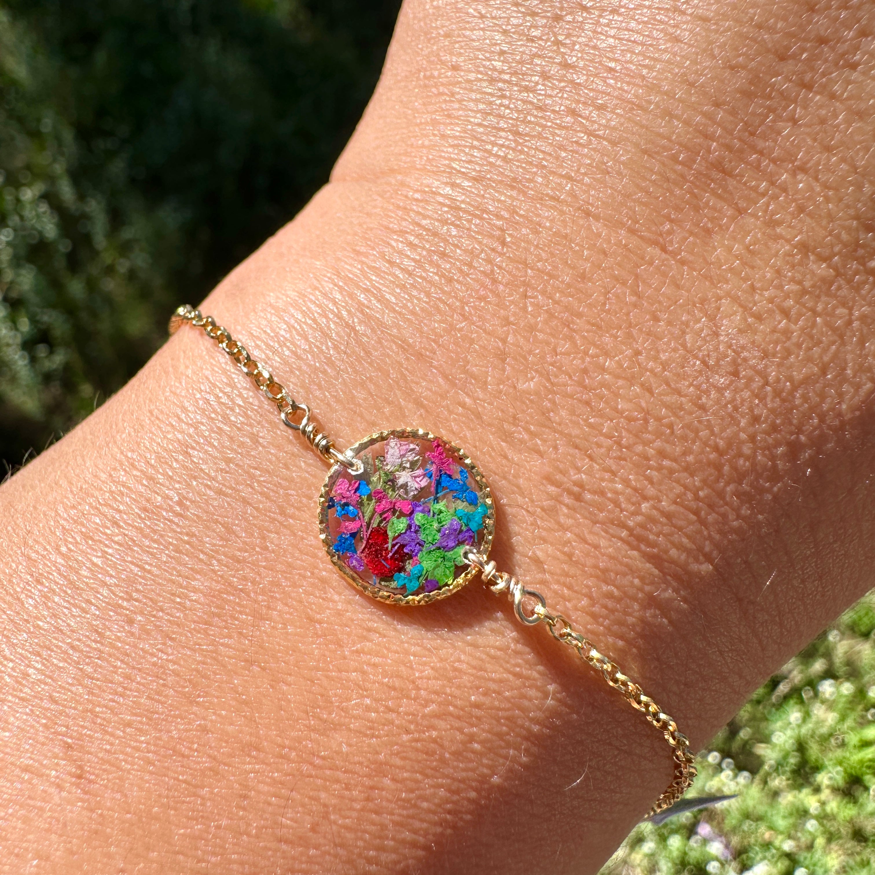 🌻 Botanical garden bracelet designed with natural pressed flowers, green ferns and a sprinkle of iridescent natural opal gemstones preserved in resin.