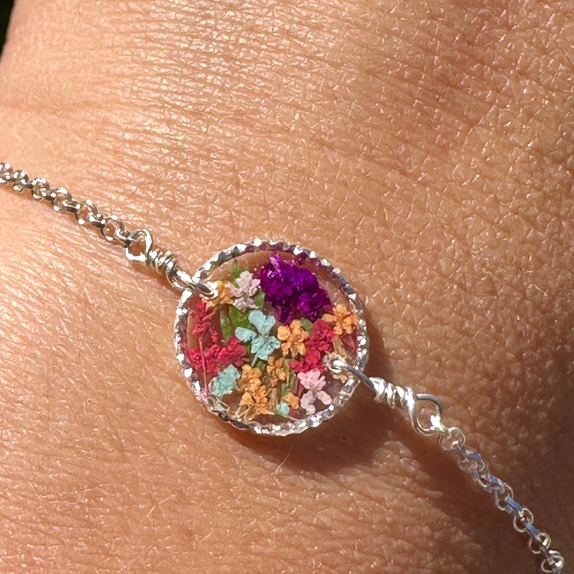 🌻 Botanical garden bracelet designed with natural pressed flowers, green ferns and a sprinkle of iridescent natural opal gemstones preserved in resin.