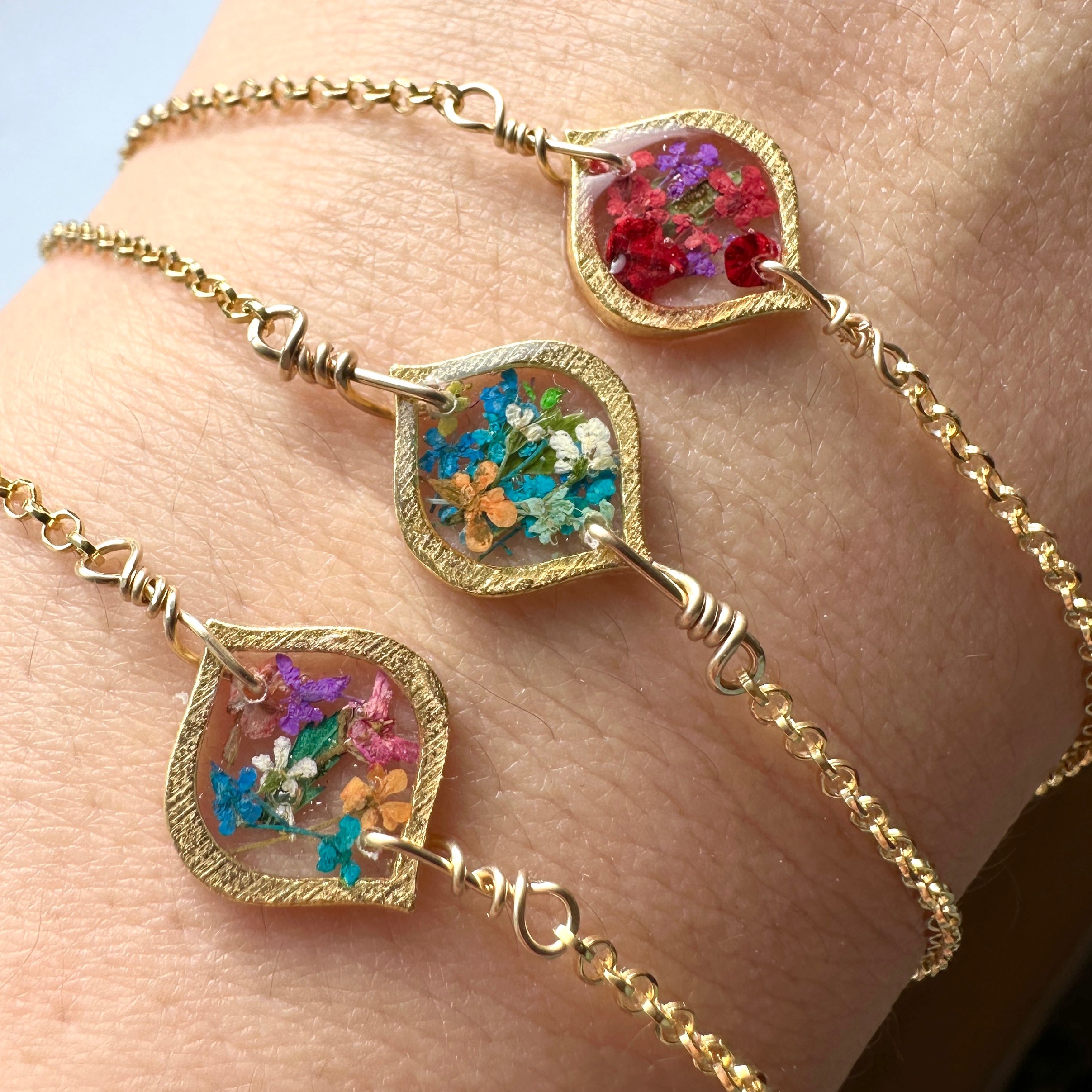Botanical garden bracelets designed with natural queen anne’s lace flowers and green ferns preserved in resin. Each bracelet is sold separately. Please select your design style at checkout.