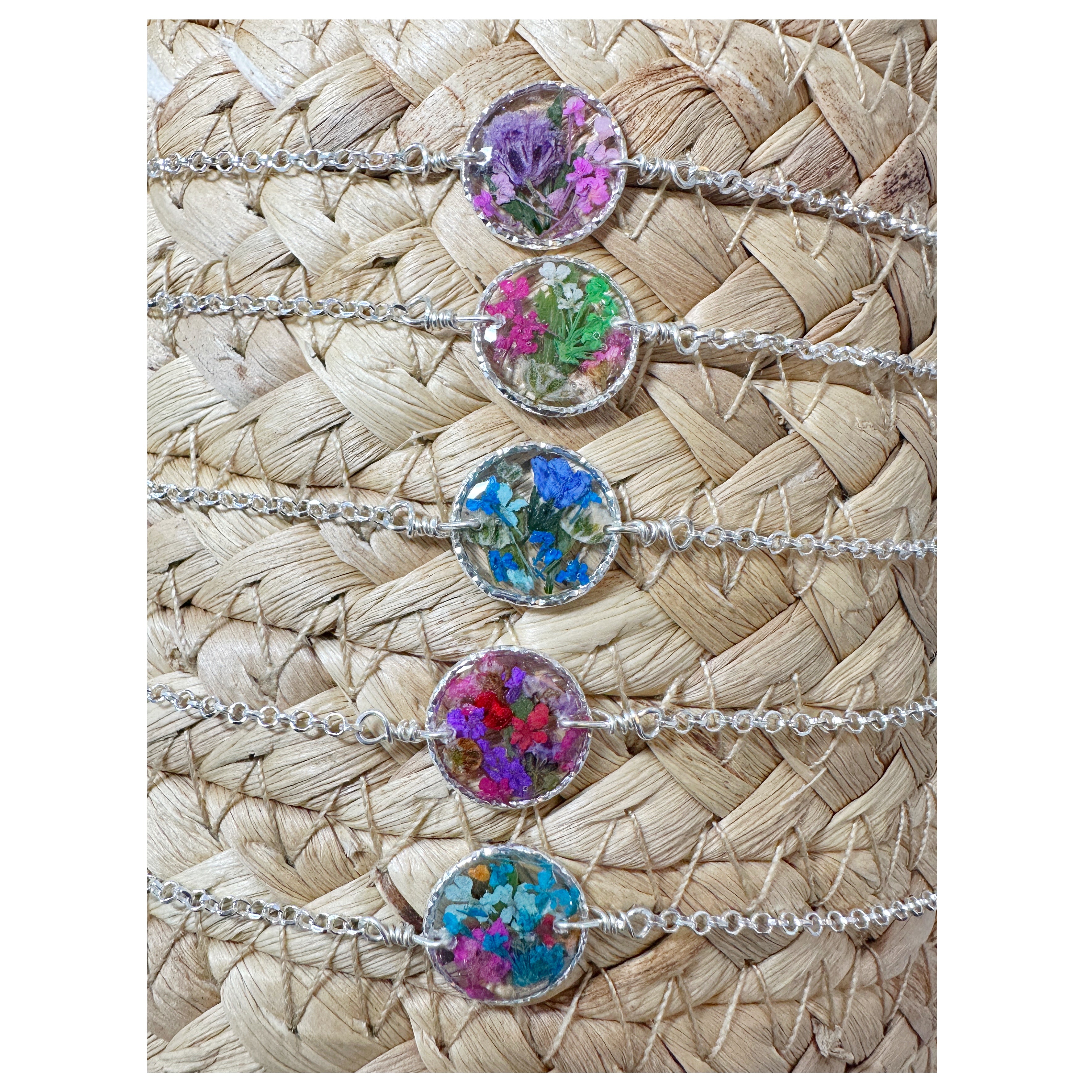 Botanical garden bracelets designed with natural pressed flowers, green ferns and a sprinkle of iridescent natural opal gemstones preserved in resin. Each bracelet is sold separately. Please select your design style at checkout.