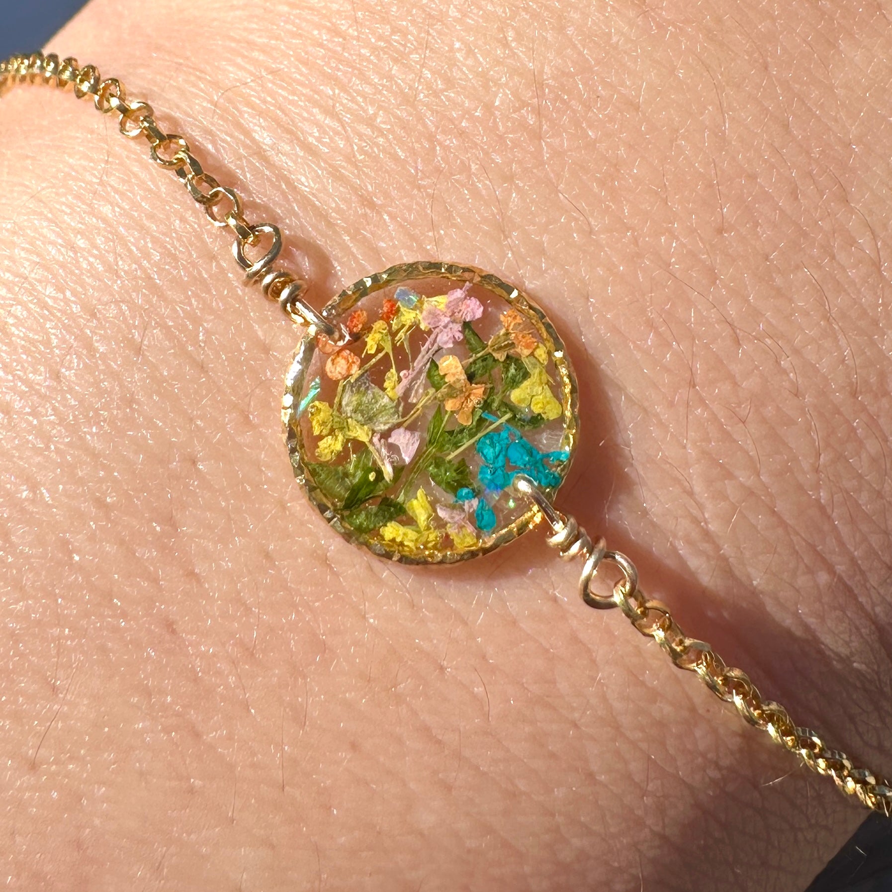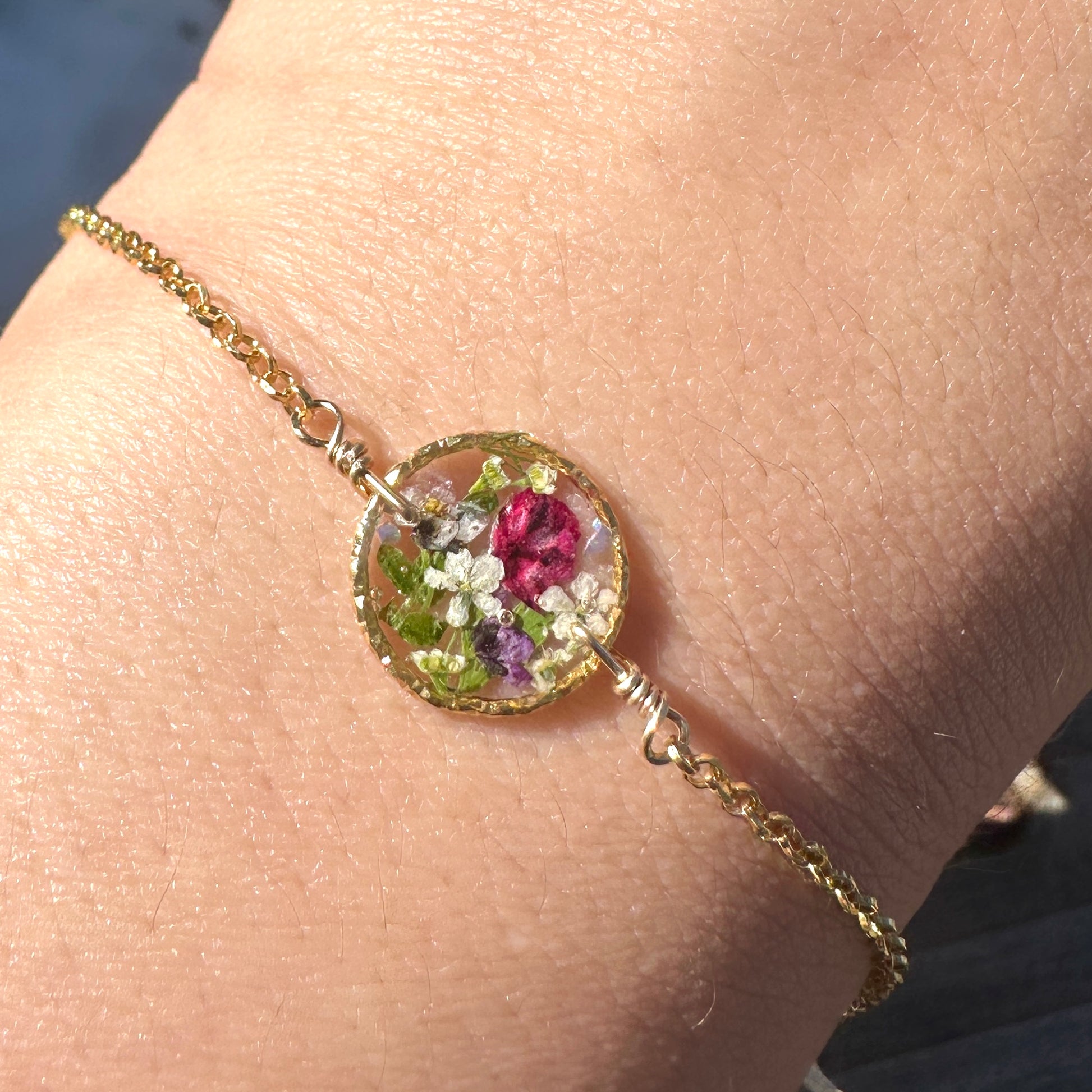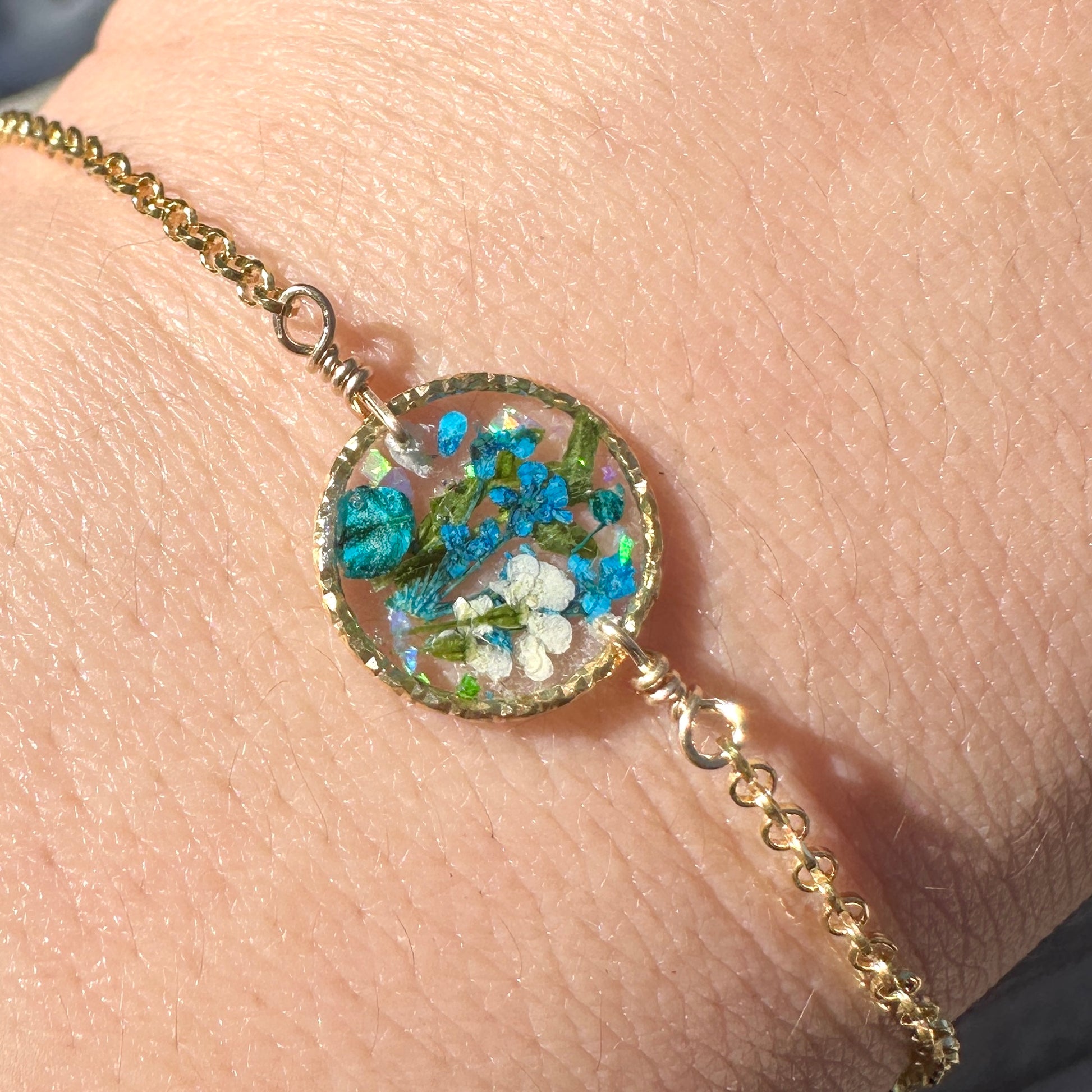 🌻 Botanical garden bracelets designed with natural pressed flowers, green ferns and a sprinkle of iridescent natural opal gemstones preserved in resin. Each bracelet is sold separately. Please select your design style at checkout.