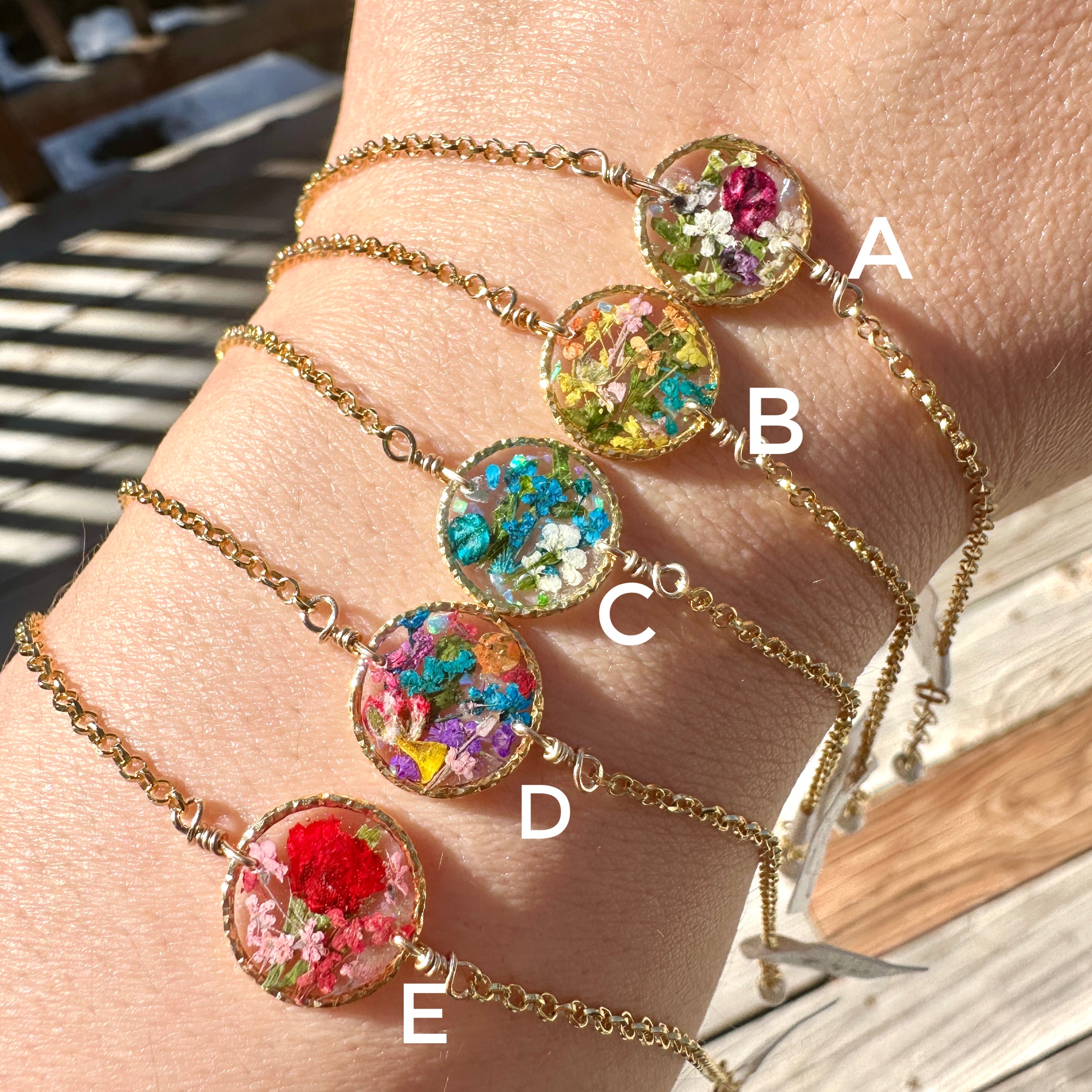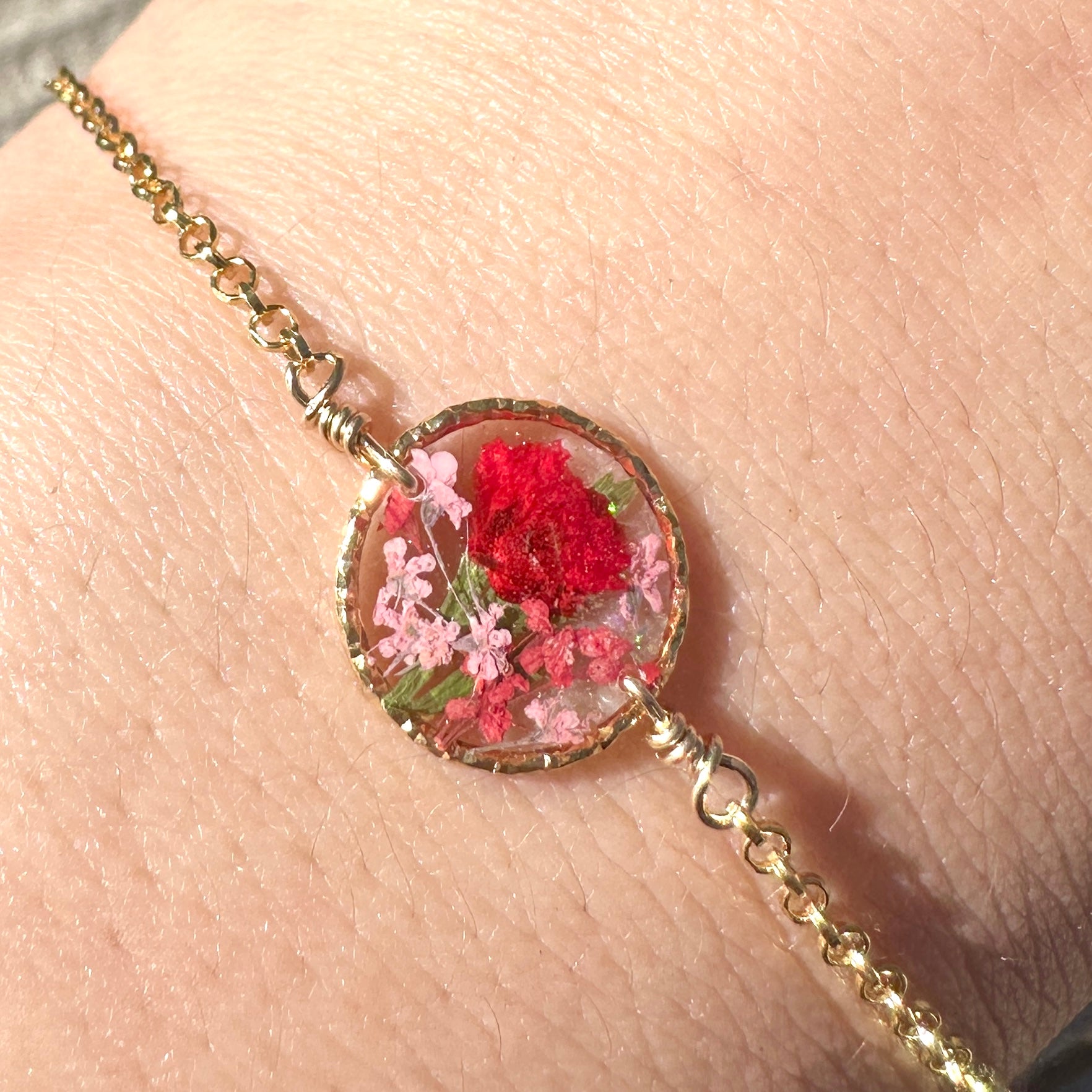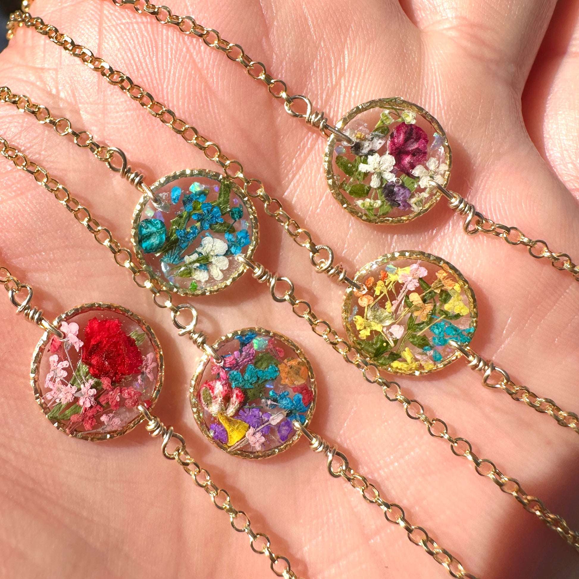 🌻 Botanical garden bracelets designed with natural pressed flowers, green ferns and a sprinkle of iridescent natural opal gemstones preserved in resin. Each bracelet is sold separately. Please select your design style at checkout.