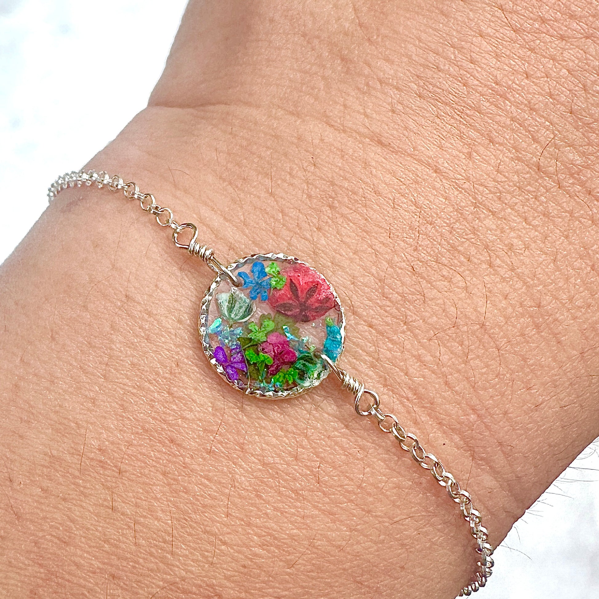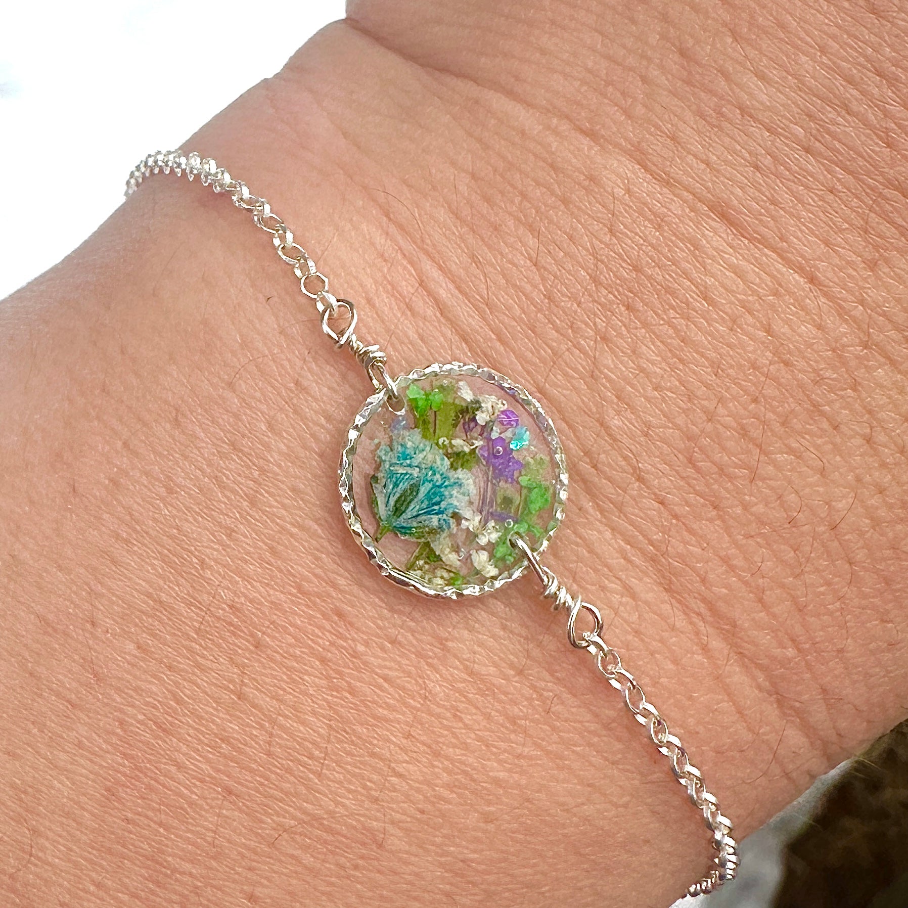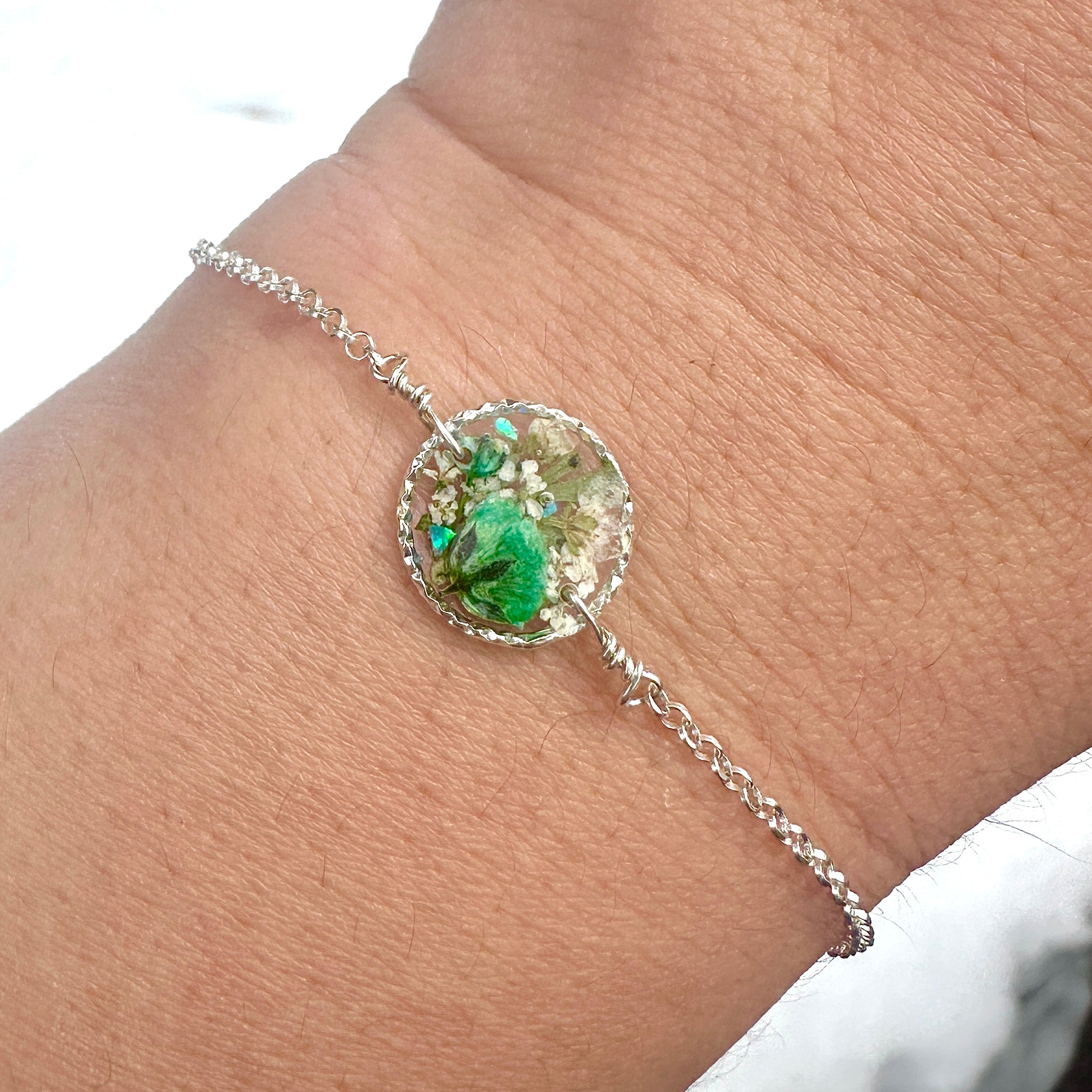 🌸 Botanical garden bracelets designed with natural pressed flowers, green ferns and a sprinkle of iridescent natural opal gemstones preserved in resin. Each bracelet is sold separately. Please select your design style at checkout.