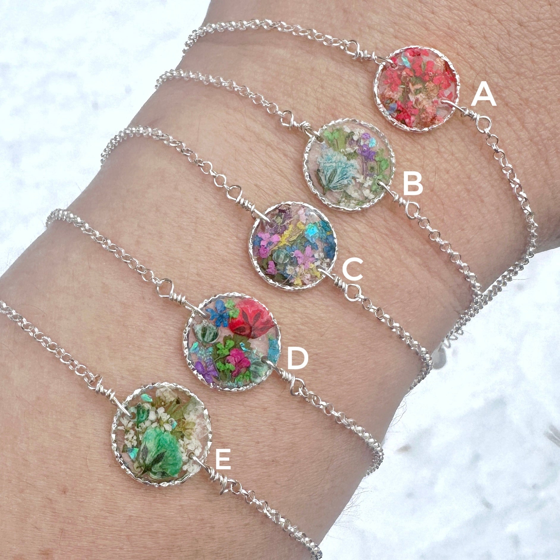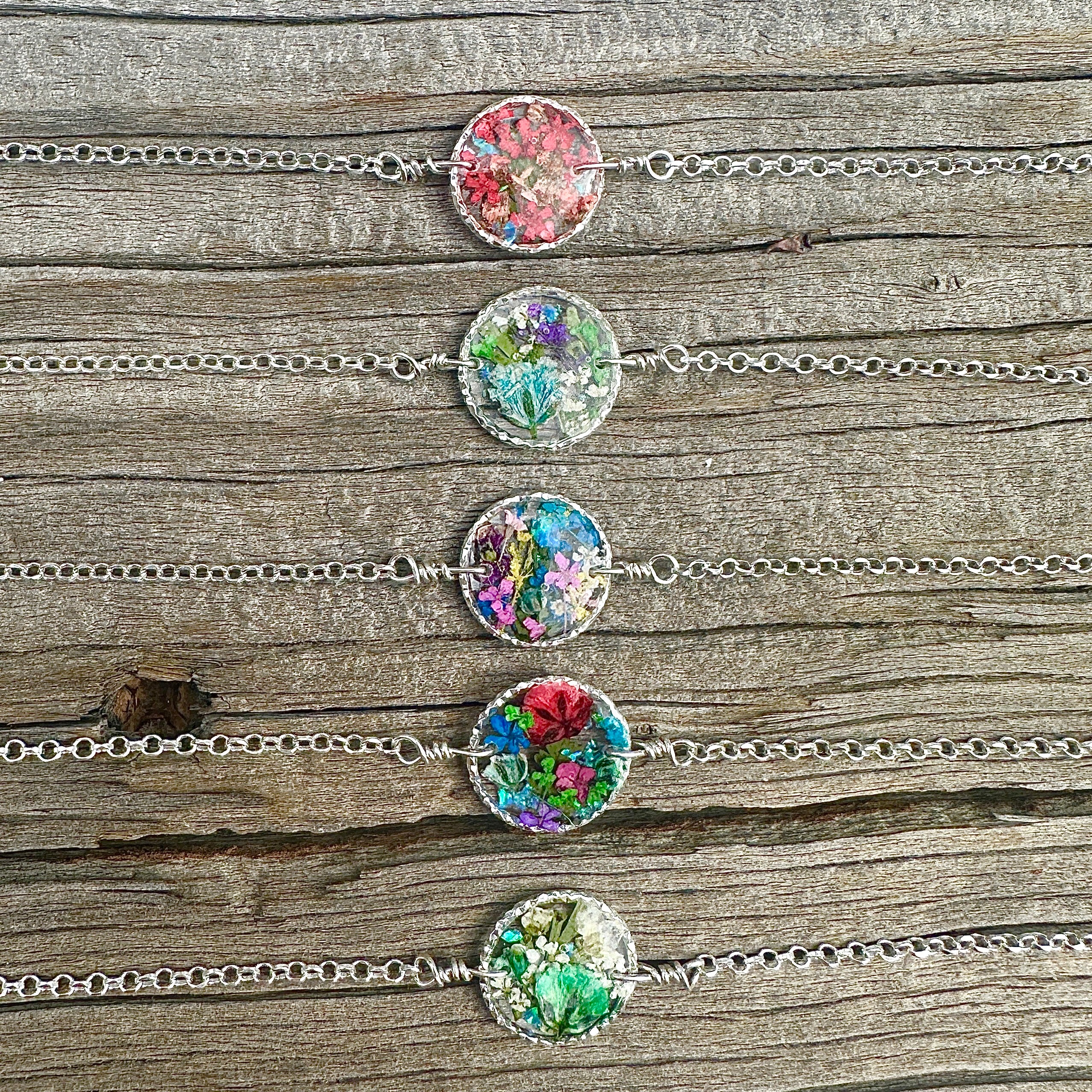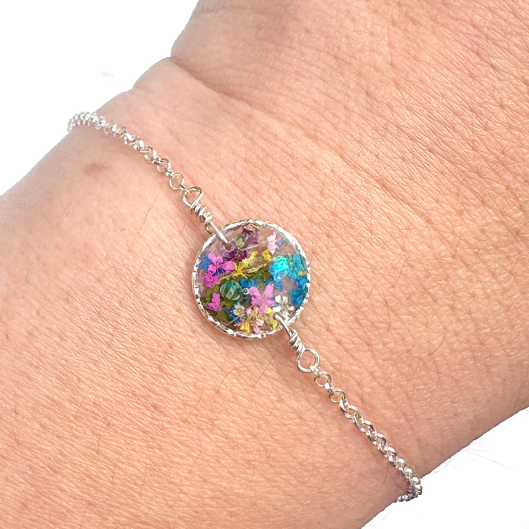 🌸 Botanical garden bracelets designed with natural pressed flowers, green ferns and a sprinkle of iridescent natural opal gemstones preserved in resin. Each bracelet is sold separately. Please select your design style at checkout.