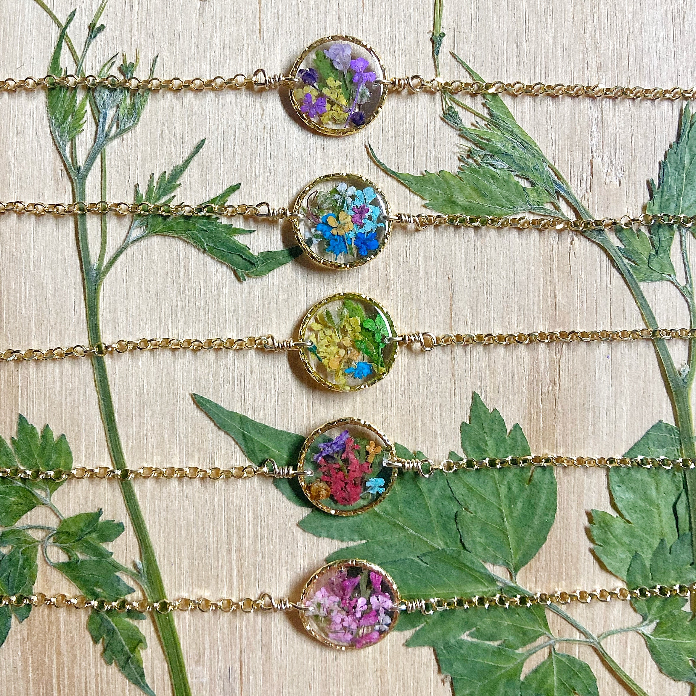 Dainty and pretty floral garden bracelets designed with natural flowers and green ferns encased in resin. Each bracelet is sold separately. Please select your design style at checkout.