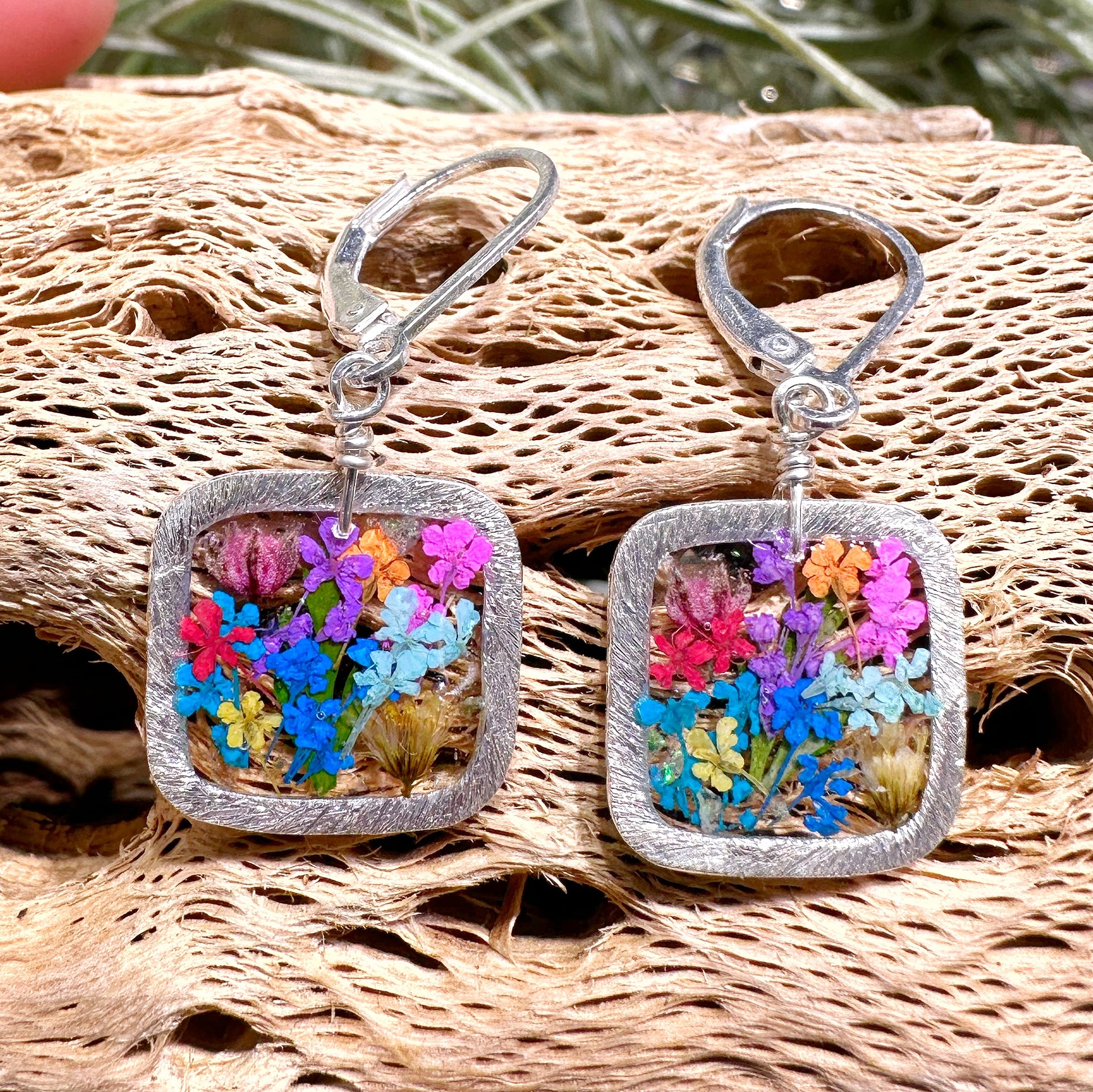 🌸 Dreamy garden of multi-colored queen anne’s lace flowers, baby’s breath flowers and natural fern earrings.