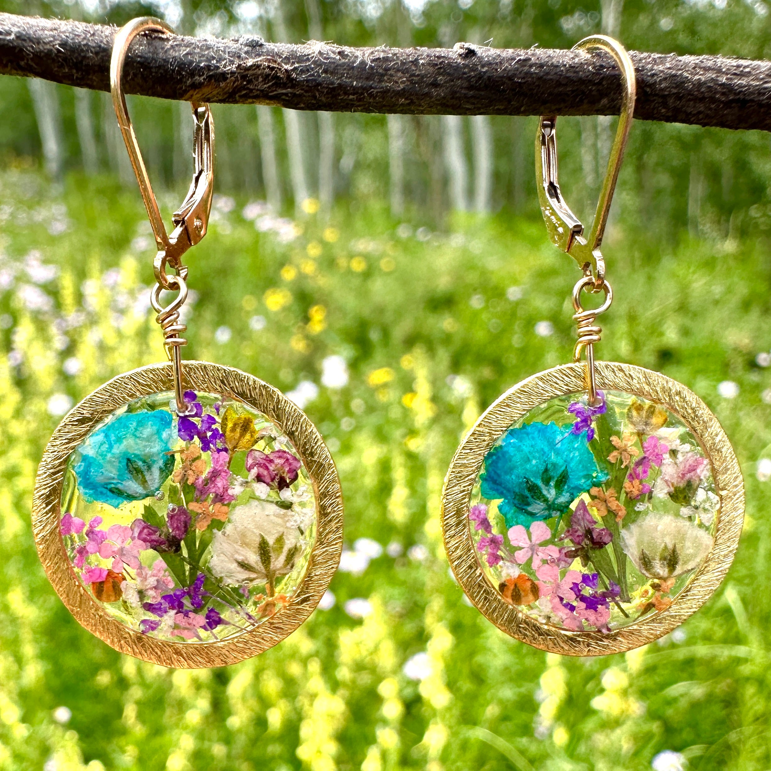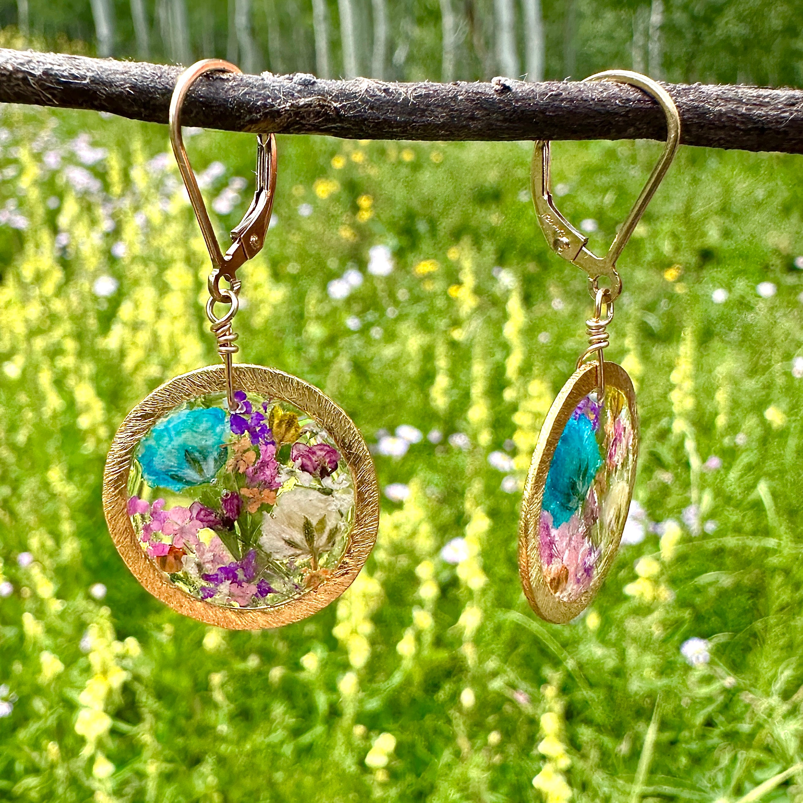 Cheerful pastel colored botanical garden earrings created with pressed flowers and ferns preserved in resin.