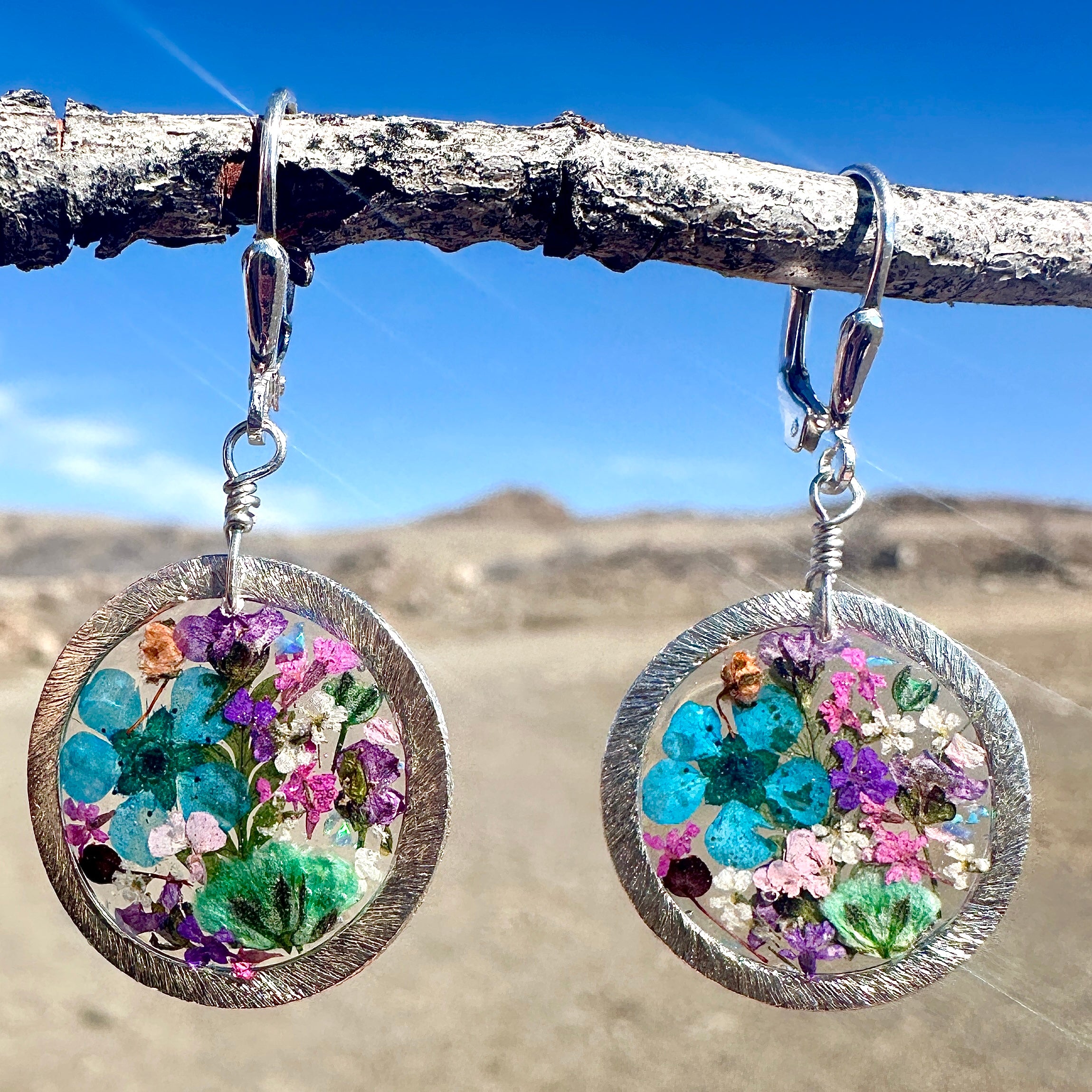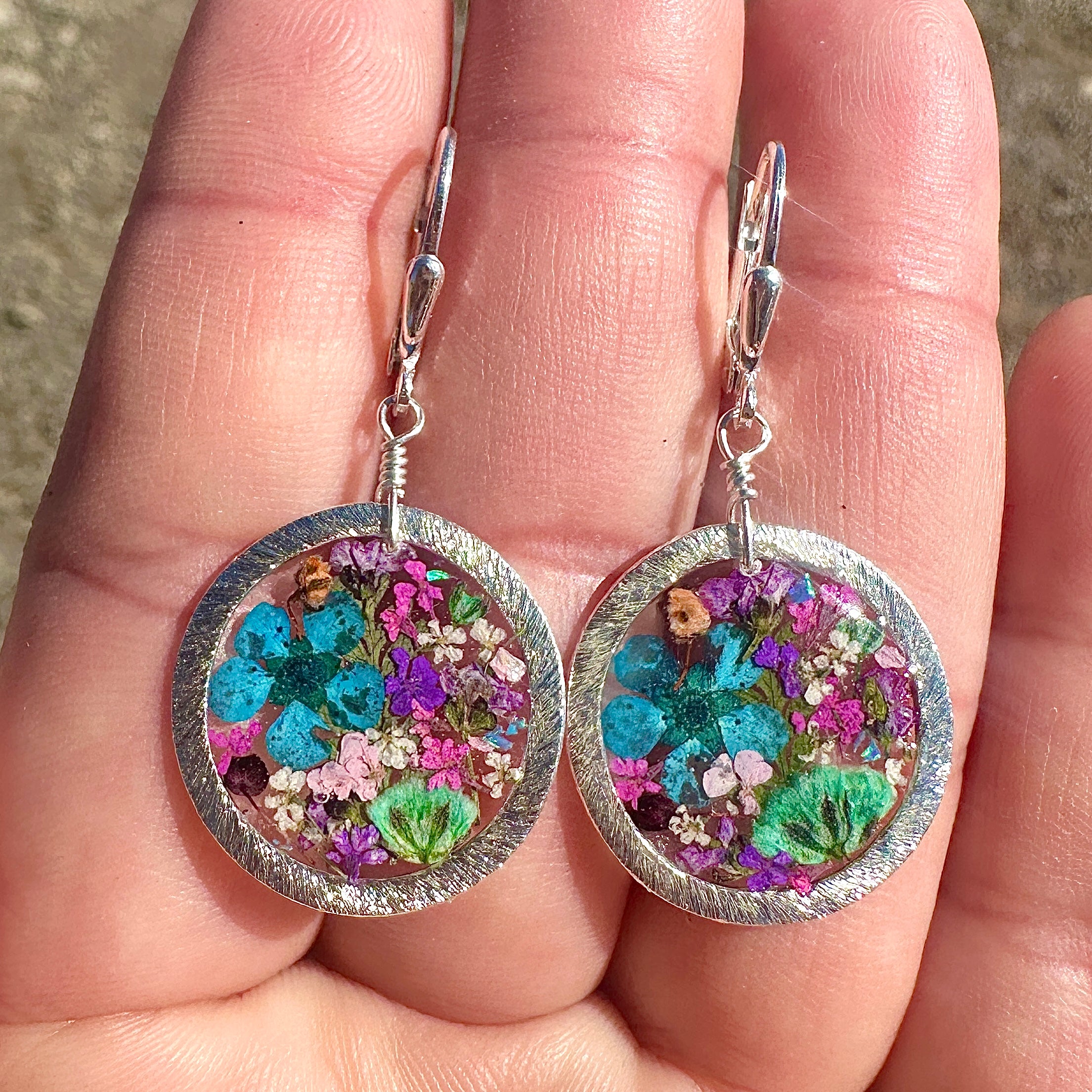 🌿Beautiful, multi-colored botanical flower earrings created with pressed flowers and natural ferns preserved in resin.