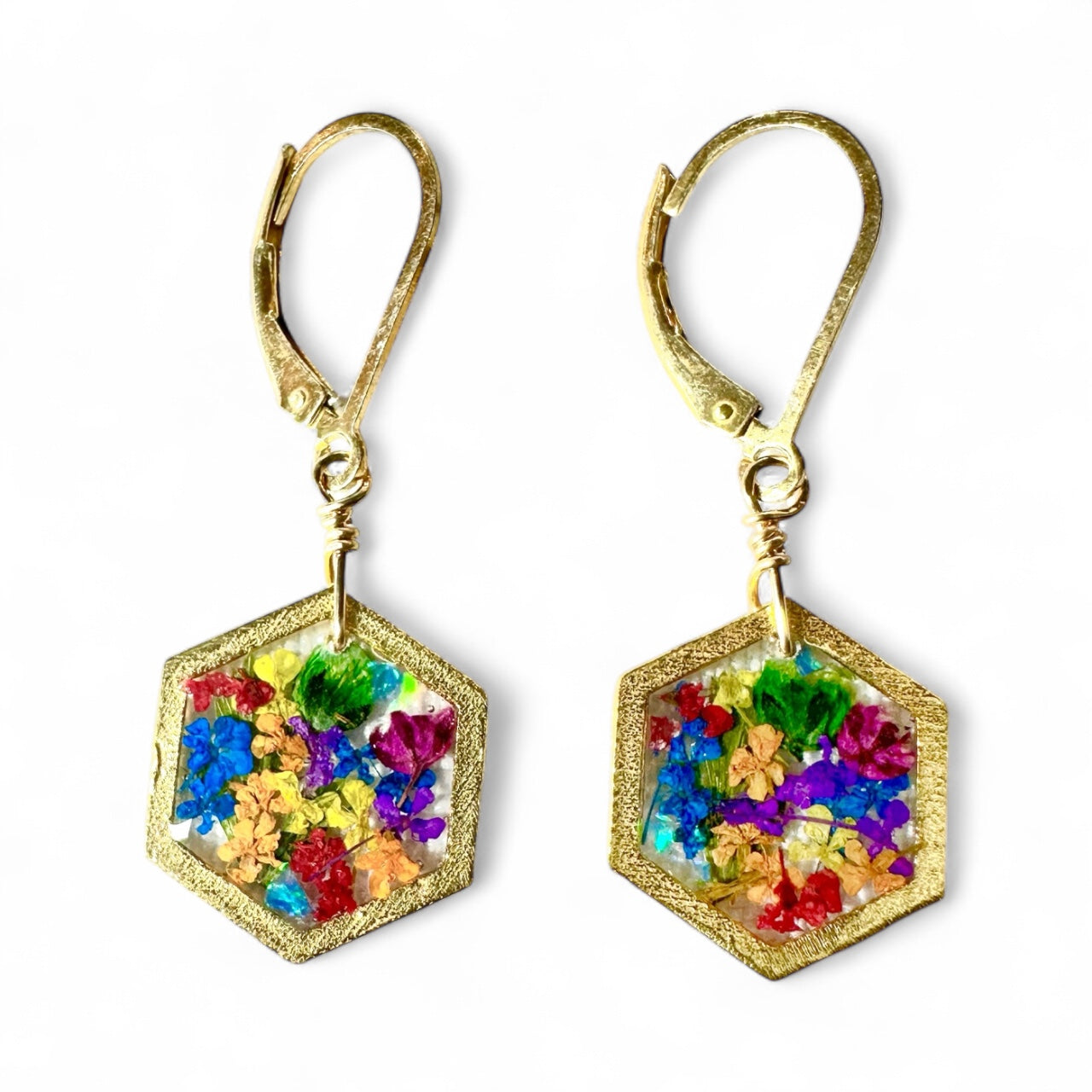 🌿 Elegant hexagon earrings with natural wildflowers and ferns preserved in resin.  📏 Earring size: 1/2” diameter ✨ 14...