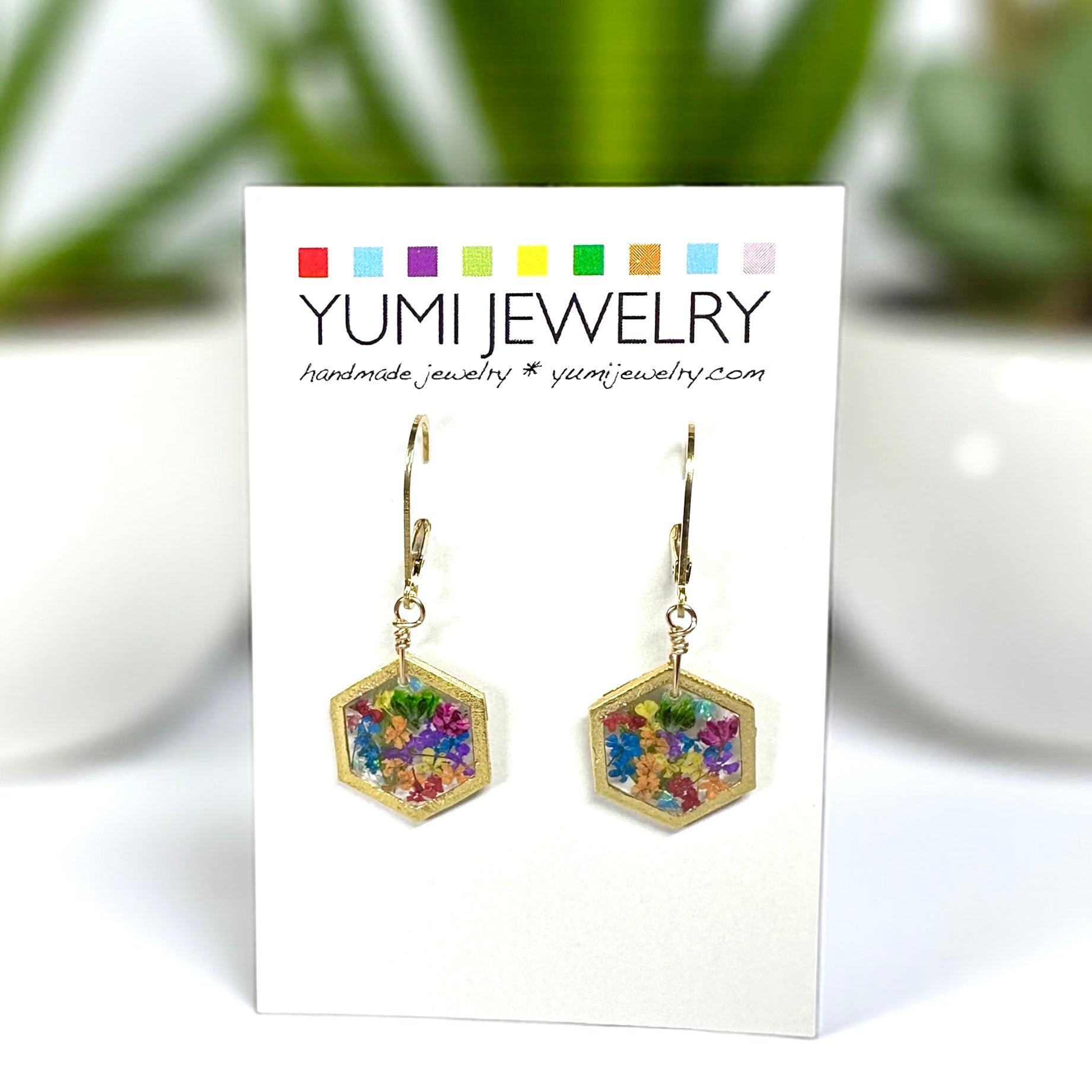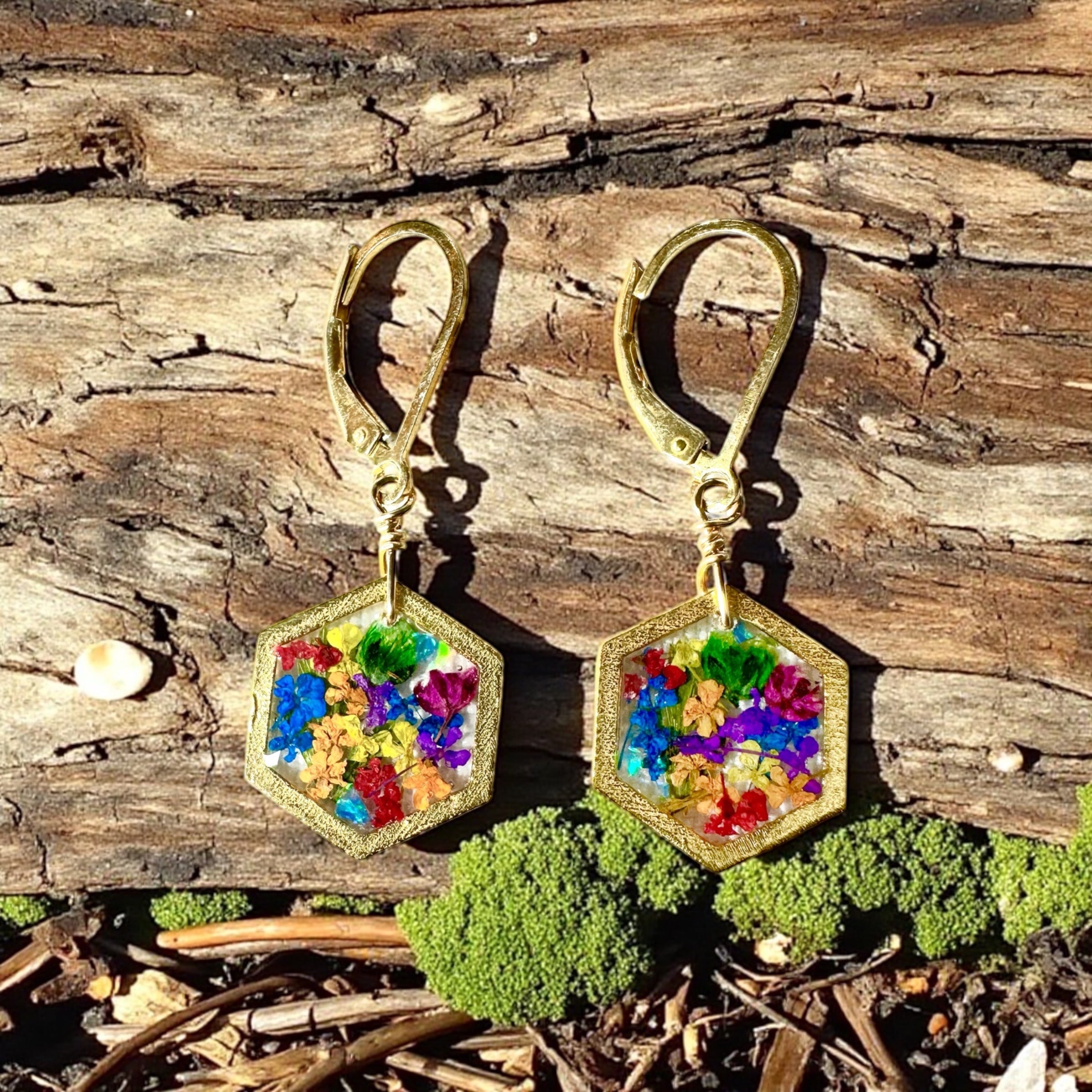 🌿 Elegant hexagon earrings with natural wildflowers and ferns preserved in resin.