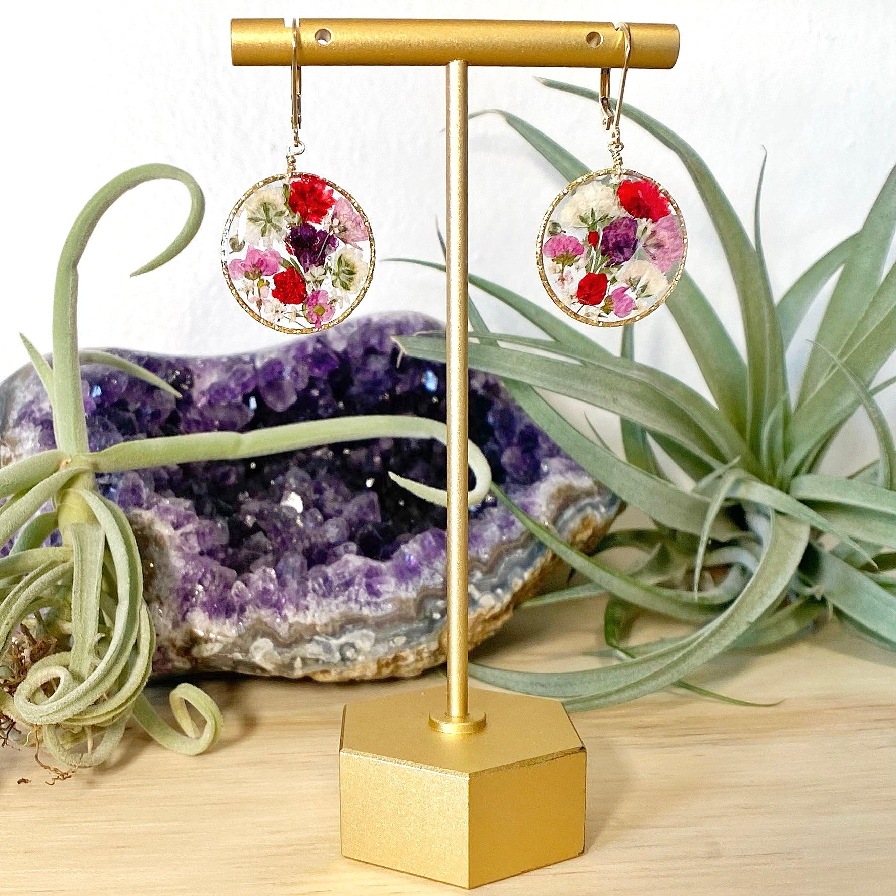 🌿One of a kind botanical garden earrings featuring natural wildflowers in shades of reds, pinks, purples and white flowers encased in resin and finished in 14kt gold-filled 🌿
