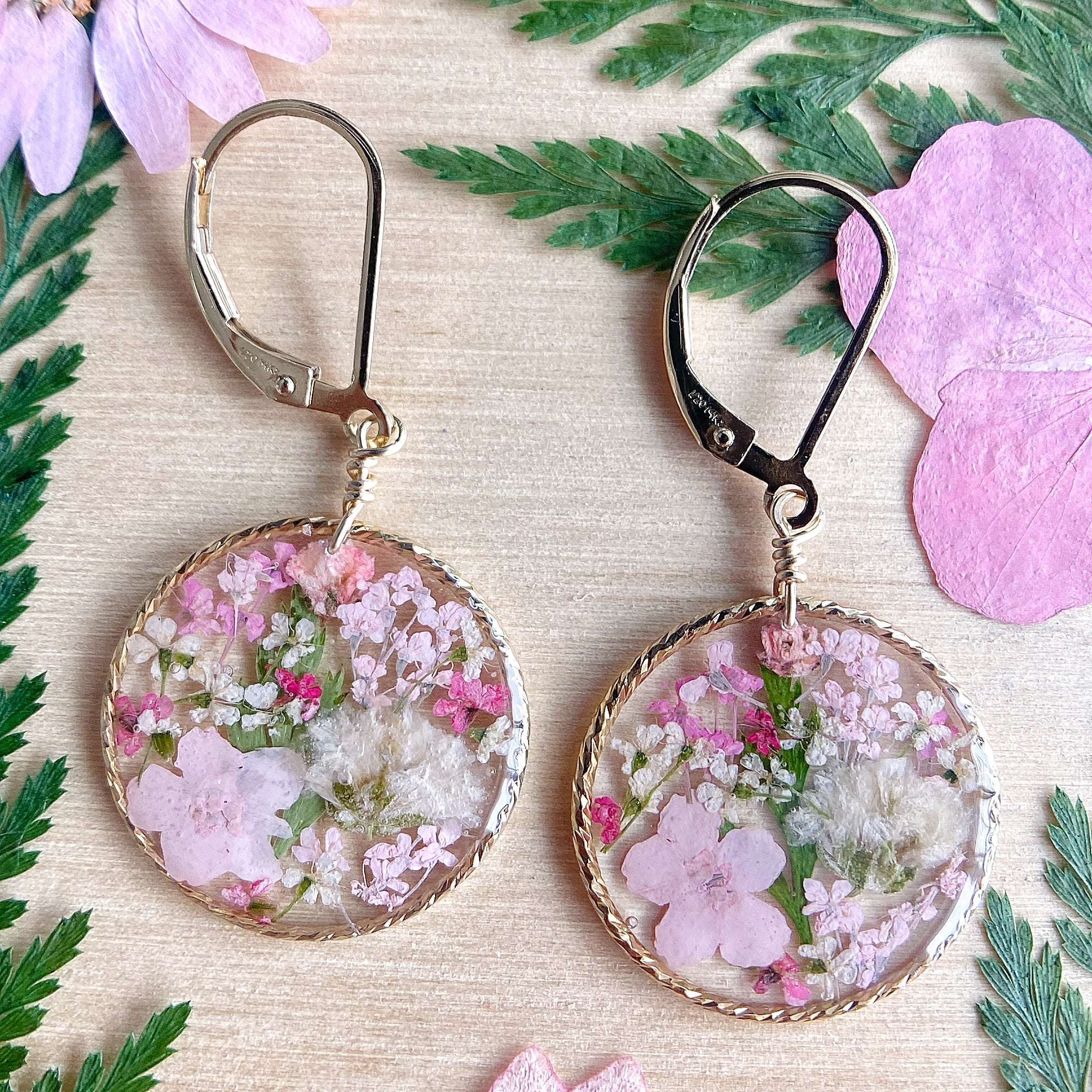 🌿Rosy pink botanical garden design created with natural flowers preserved in resin and finished in 14kt gold filled metal.🌿