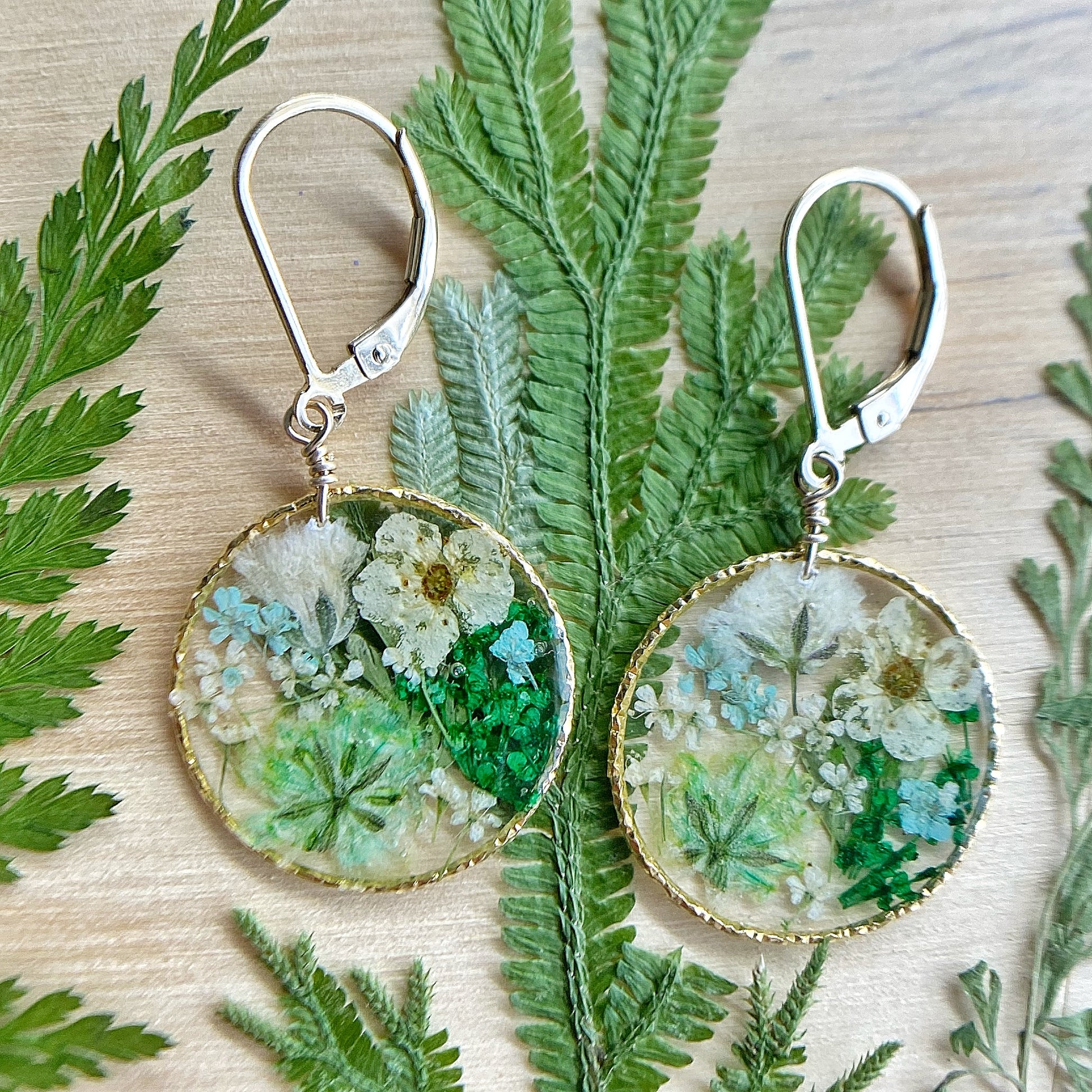 Dreamy pastel botanical garden earrings featuring forget me not flowers, baby’s breath flowers, queen anne’s lace flowers and natural ferns.