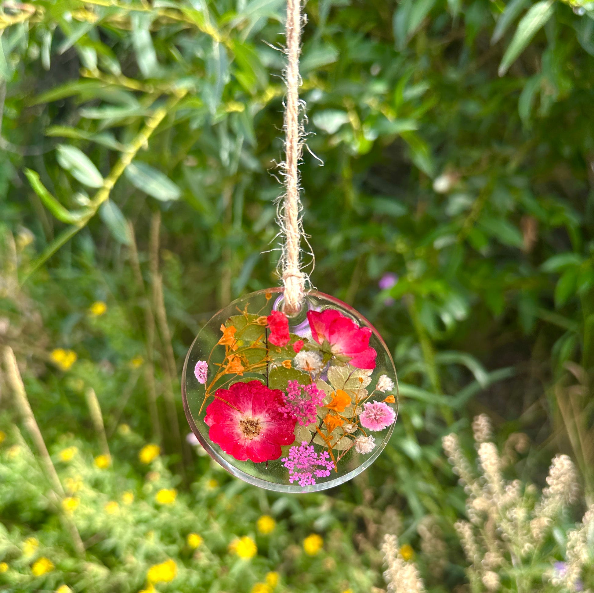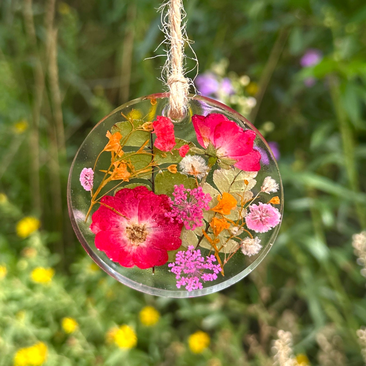🌺 Colorful botanical garden ornament designed with natural pressed flowers and ferns preserved in resin.