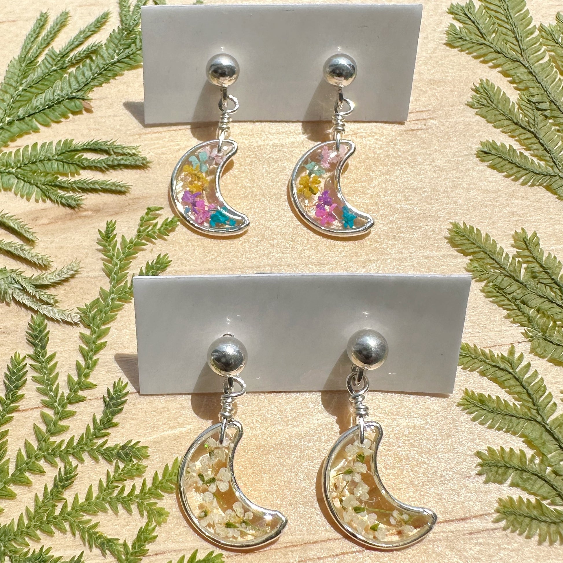 🌙Dainty moon shaped botanical garden stud earrings with natural queen anne’s lace flowers. Each pair of earrings are sold separately. Please select your design choice at checkout.