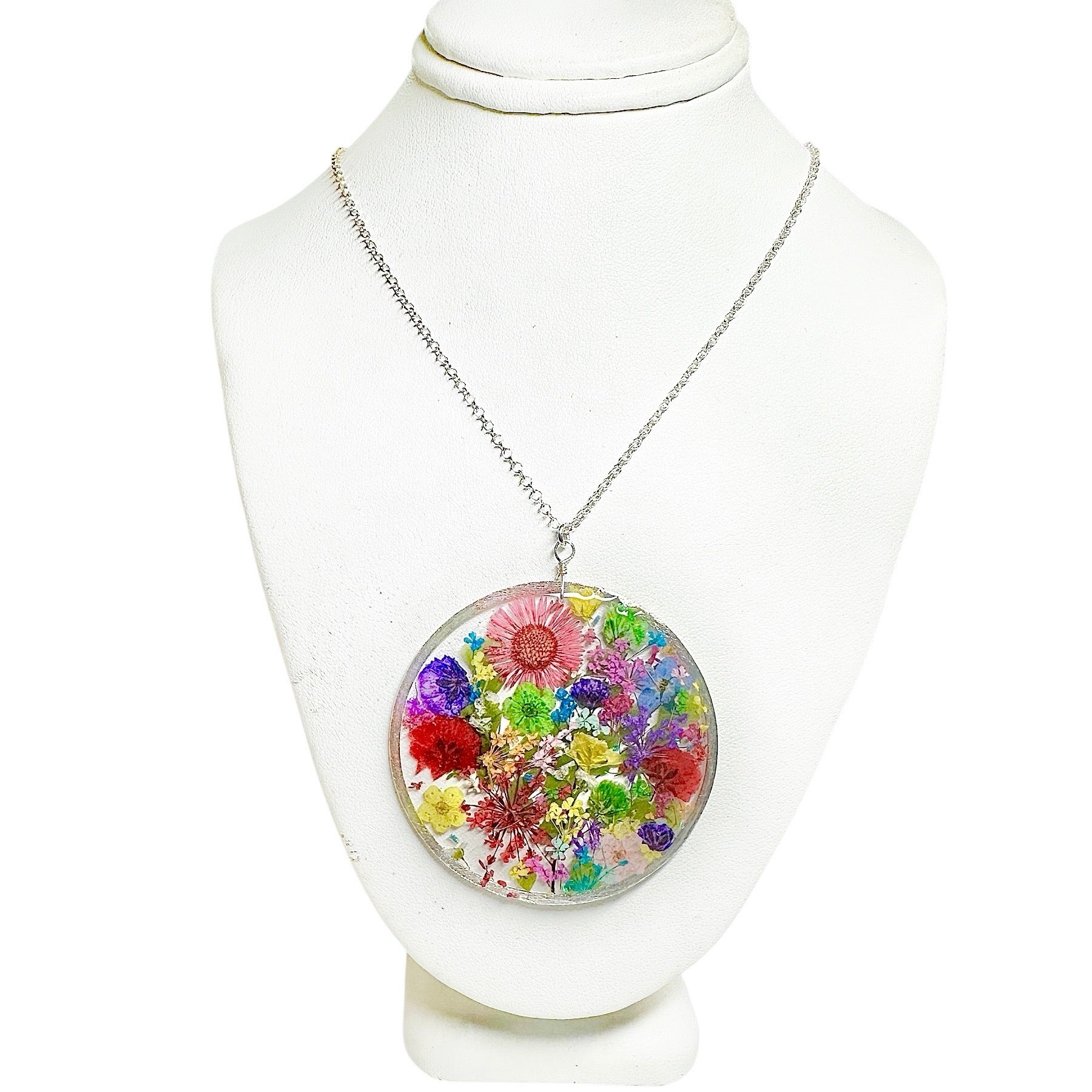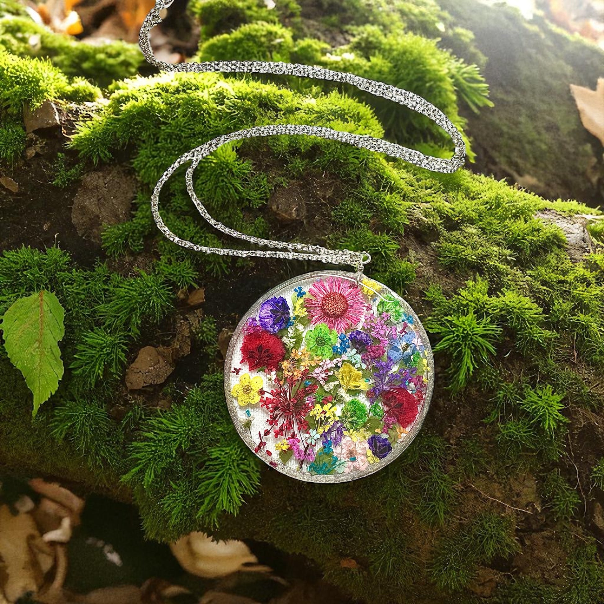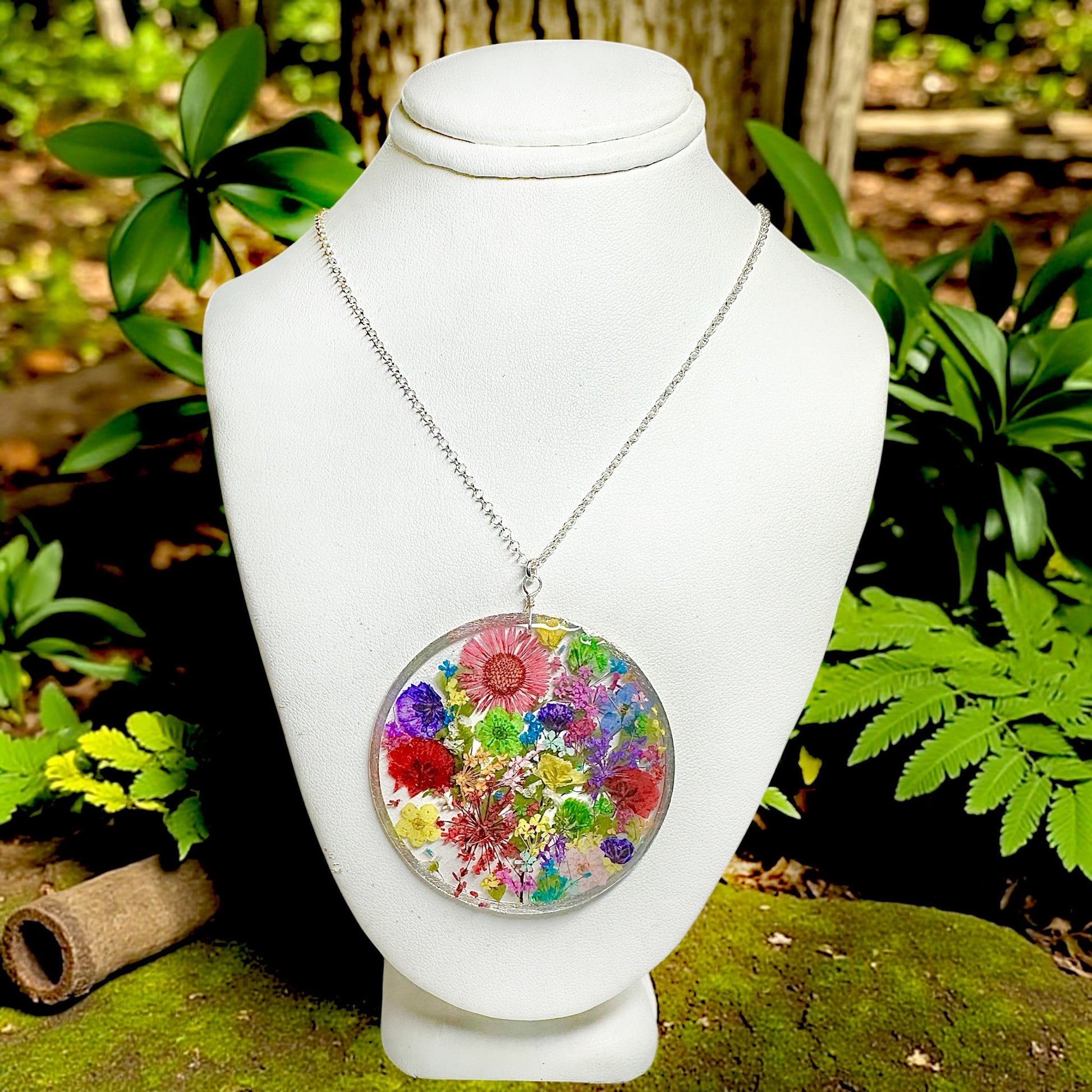 Beautiful botanical garden necklace designed with a cheerful bouquet of wildflowers and natural ferns. The flowers are pressed, dried and preserved in resin.
