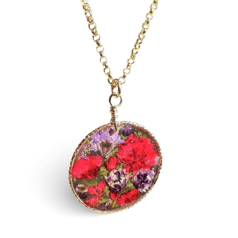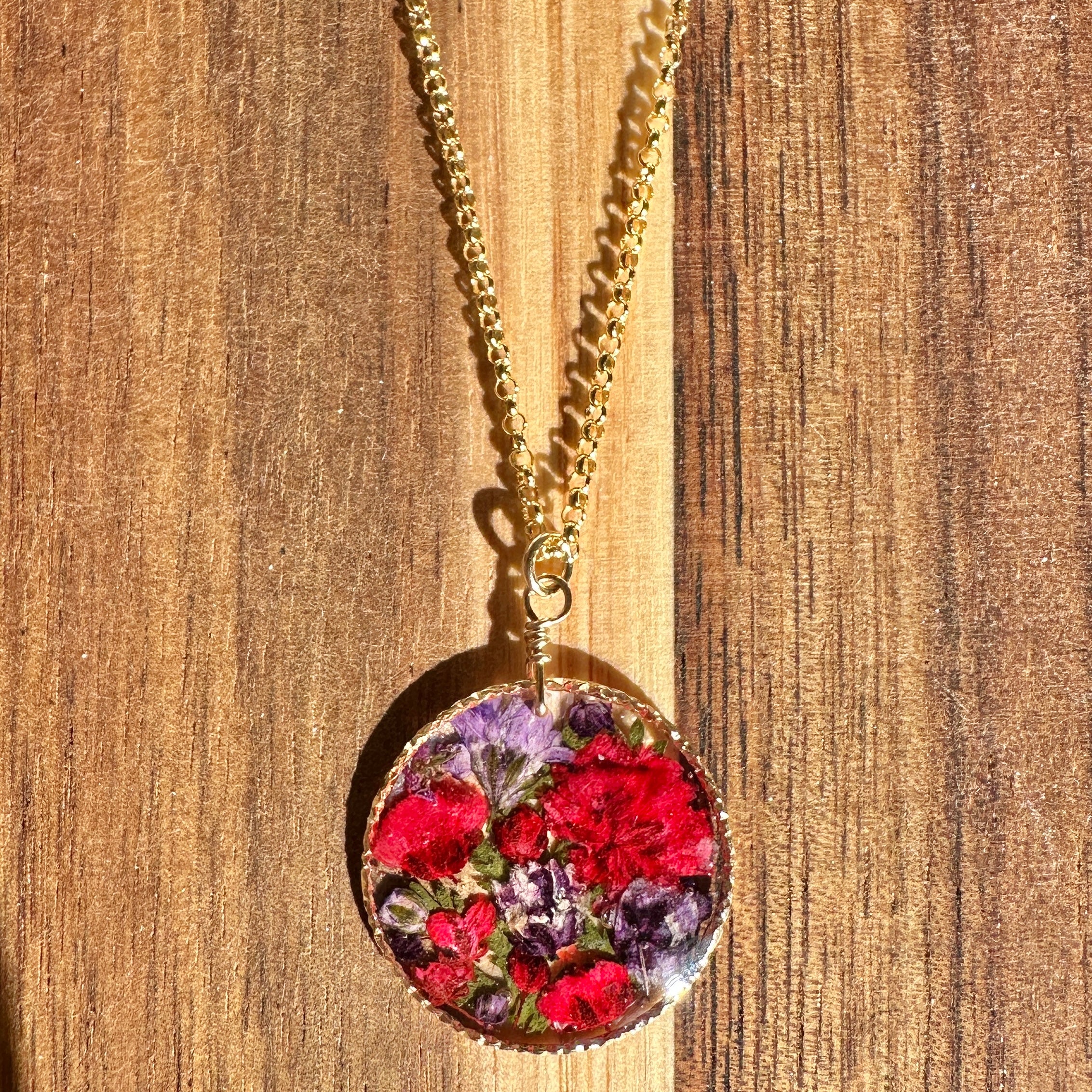 🌿Purple and red flower necklace designed with baby’s breath, queen anne’s lace flowers and green ferns. The flowers and ferns are pressed, dried and preserved in resin with 14kt gold-filled metal details.