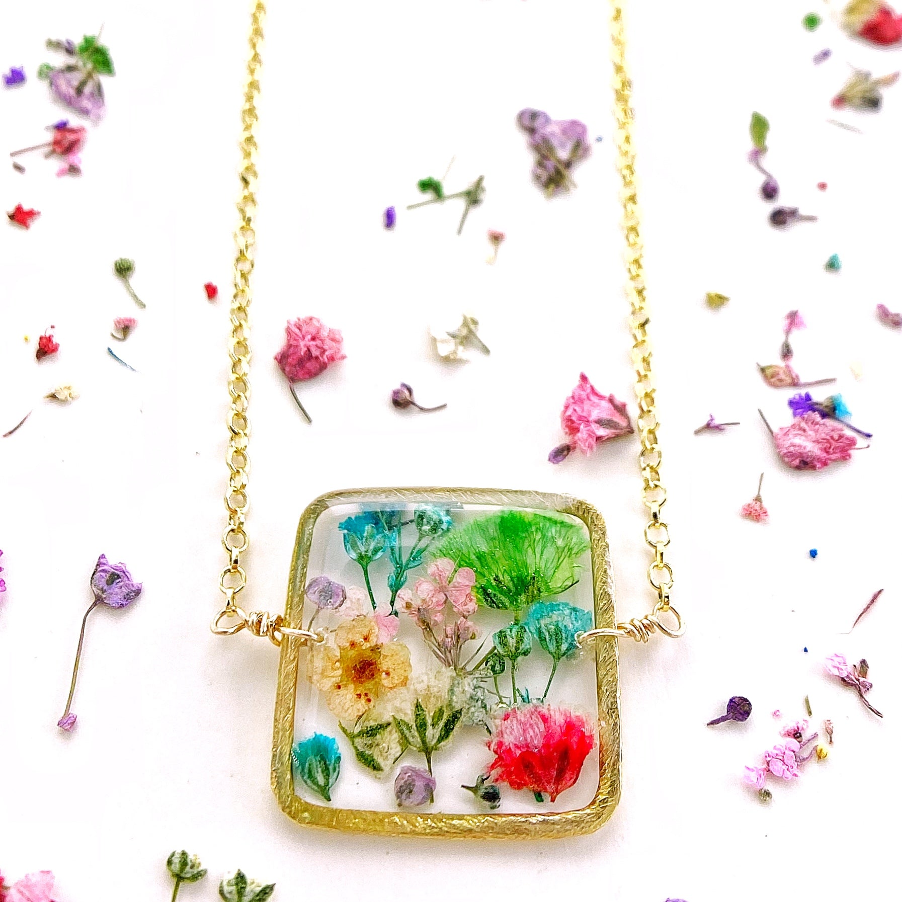🌻One of a kind handmade necklace designed with a beautiful collage of natural real wildflowers encased in clear resin and finished with 14kt gold-filled details. 🌸