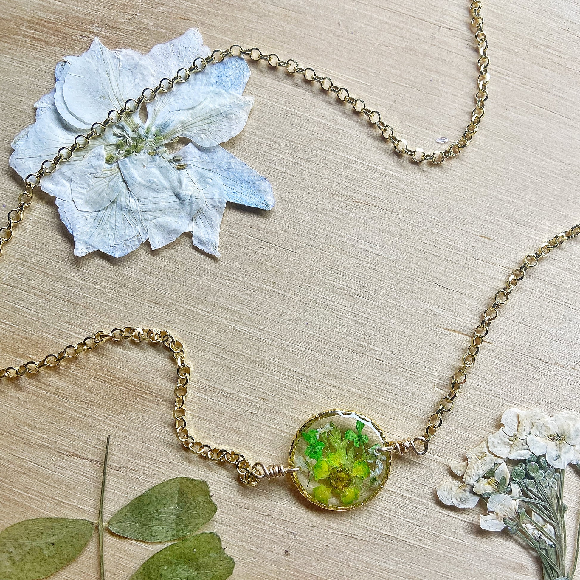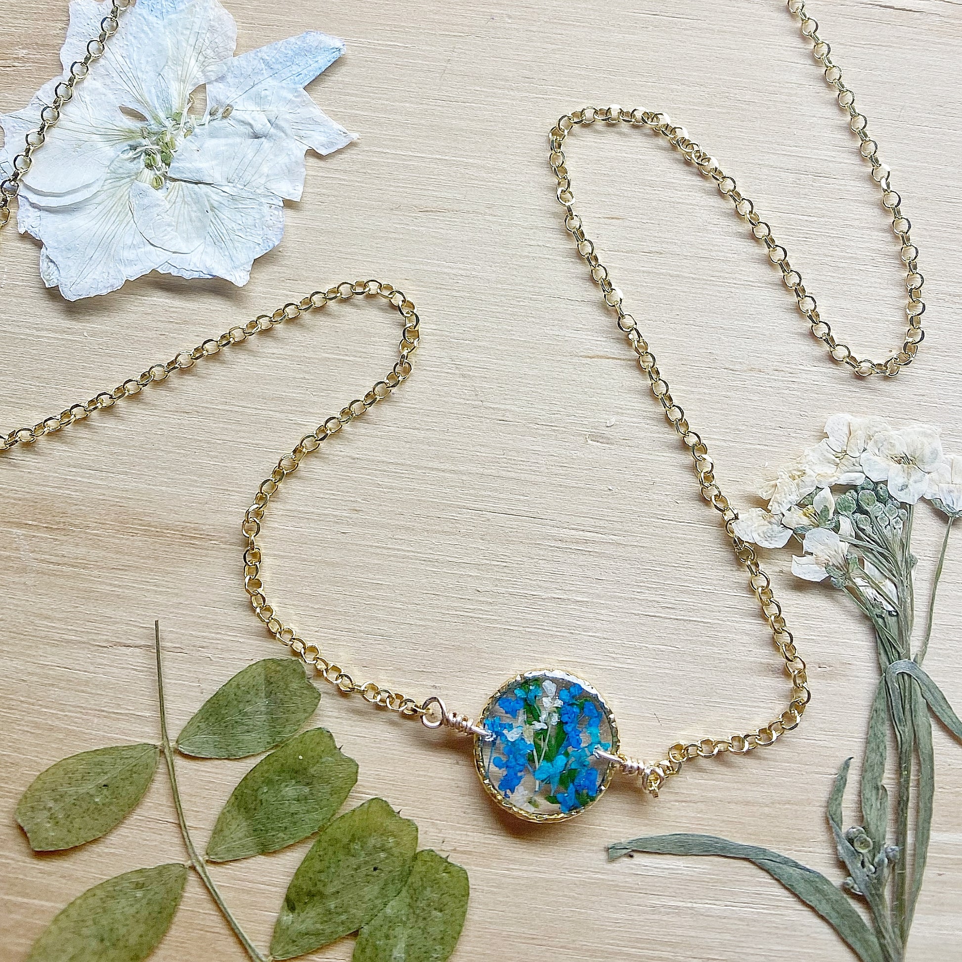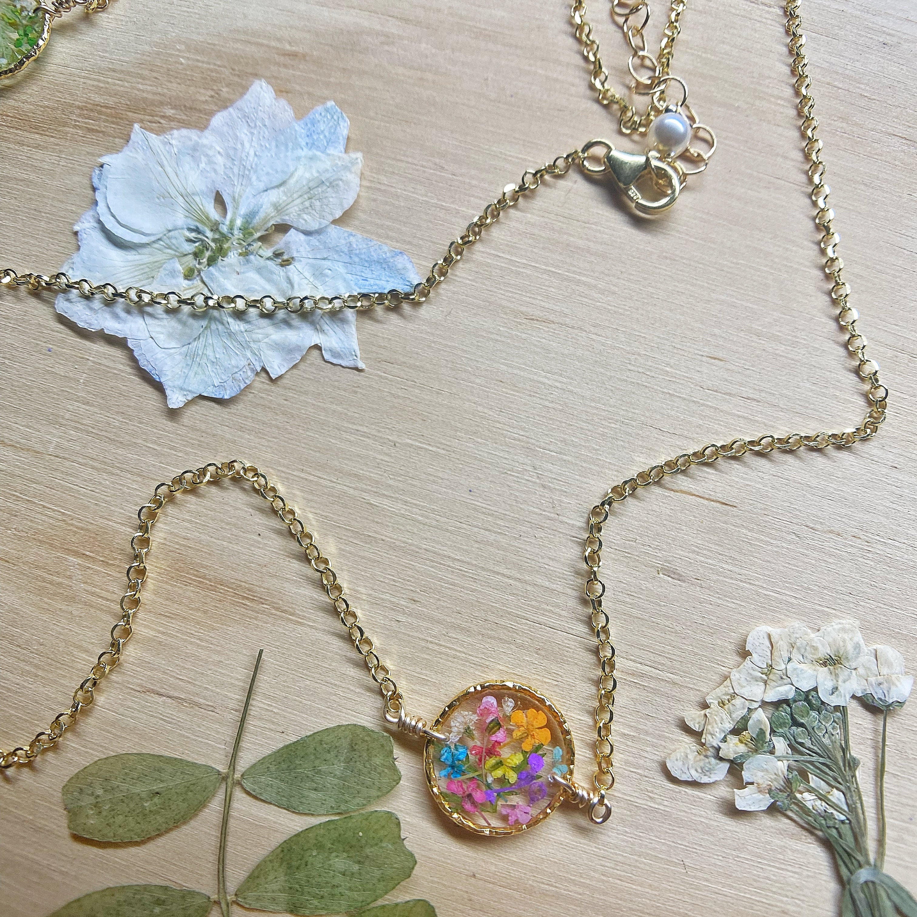 Real flowers botanical garden necklaces designed with natural flowers and green ferns encased in resin. Each necklace is sold separately. Please select your design style at checkout.