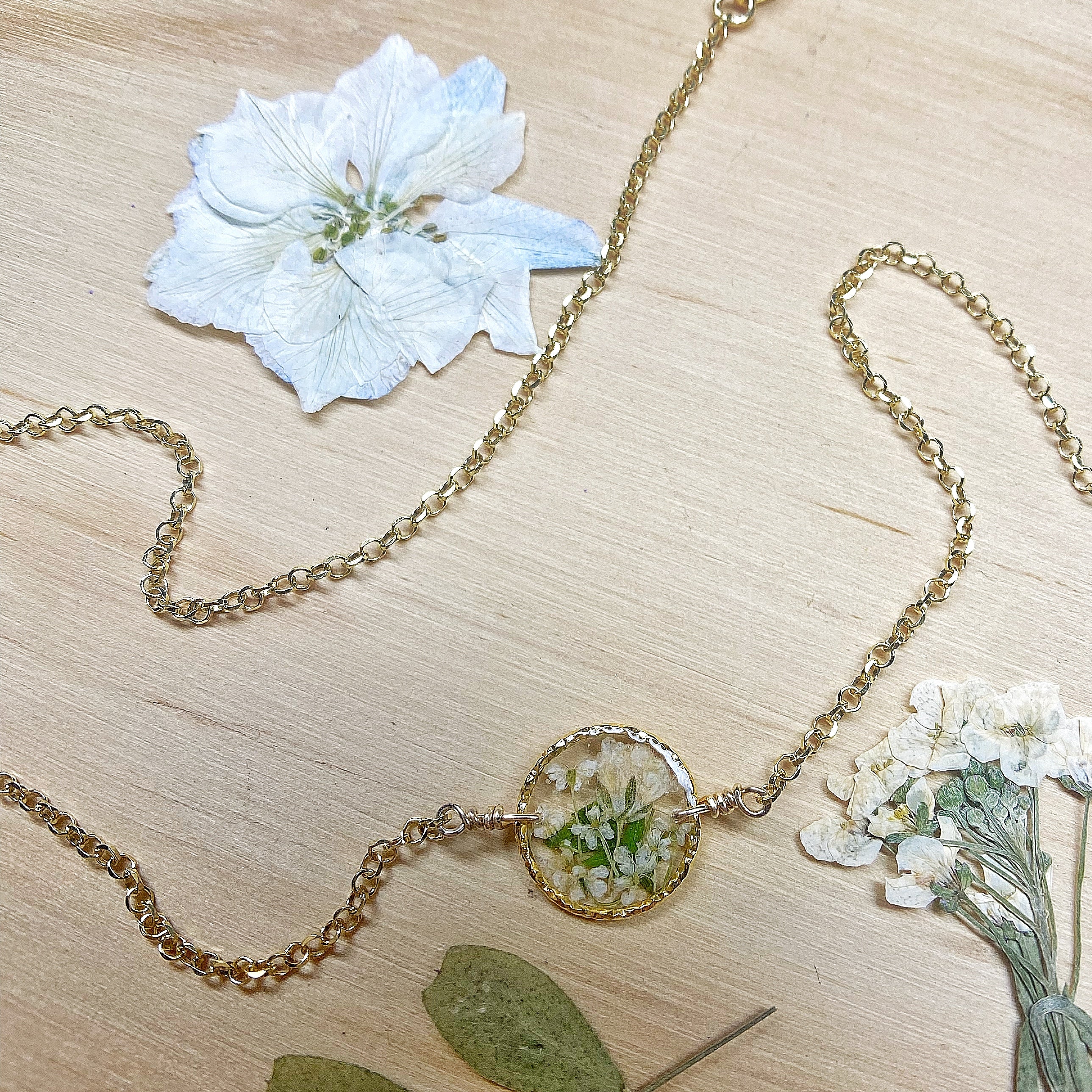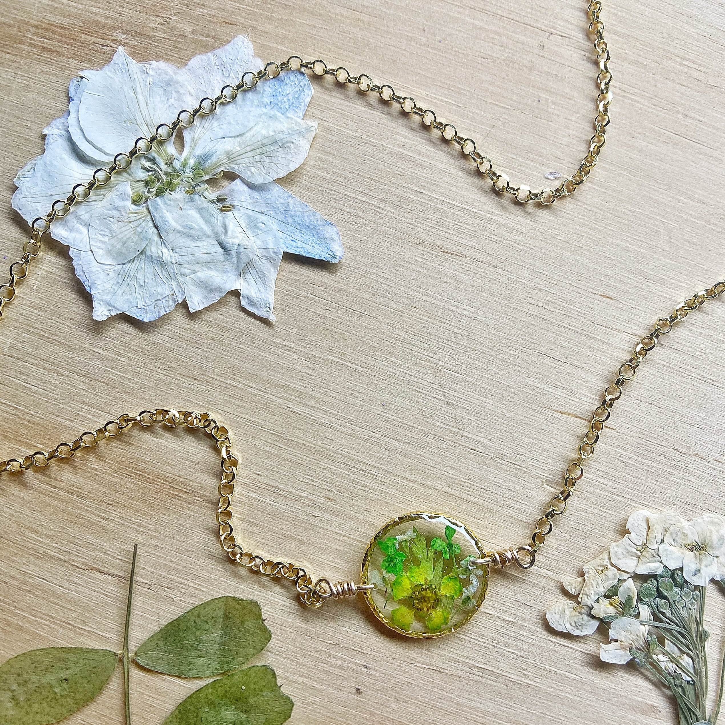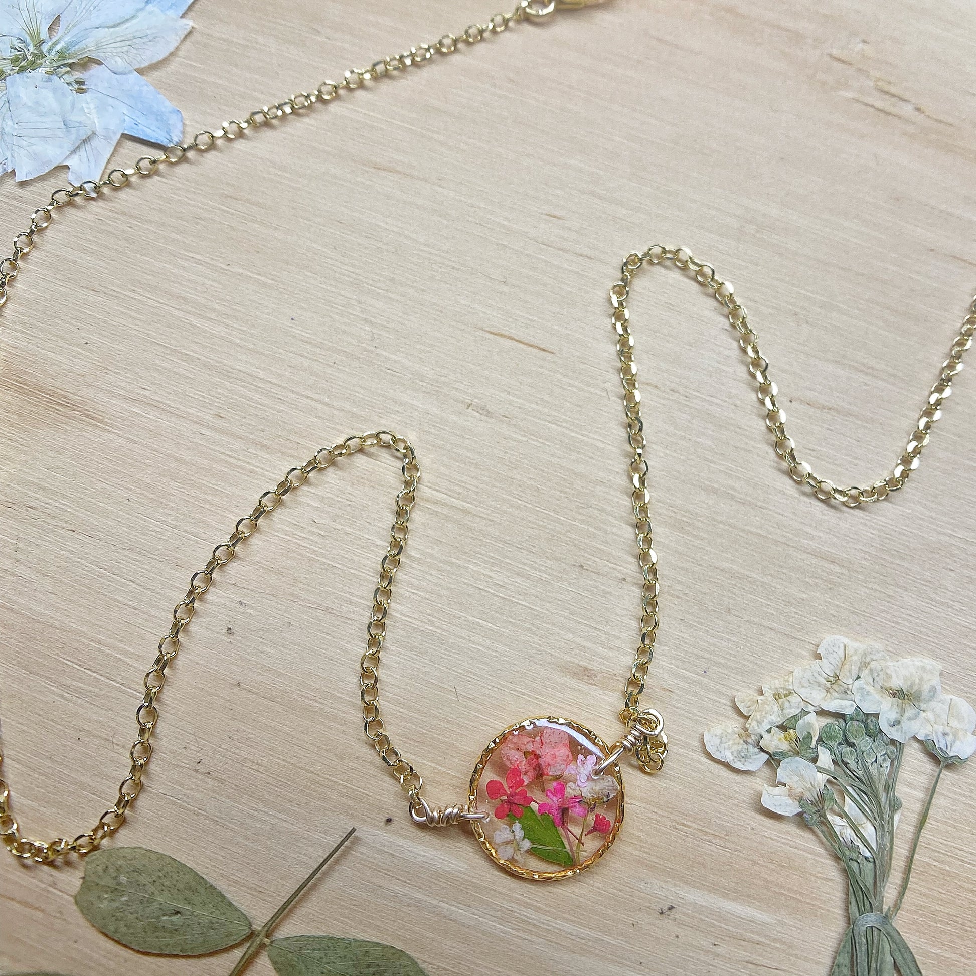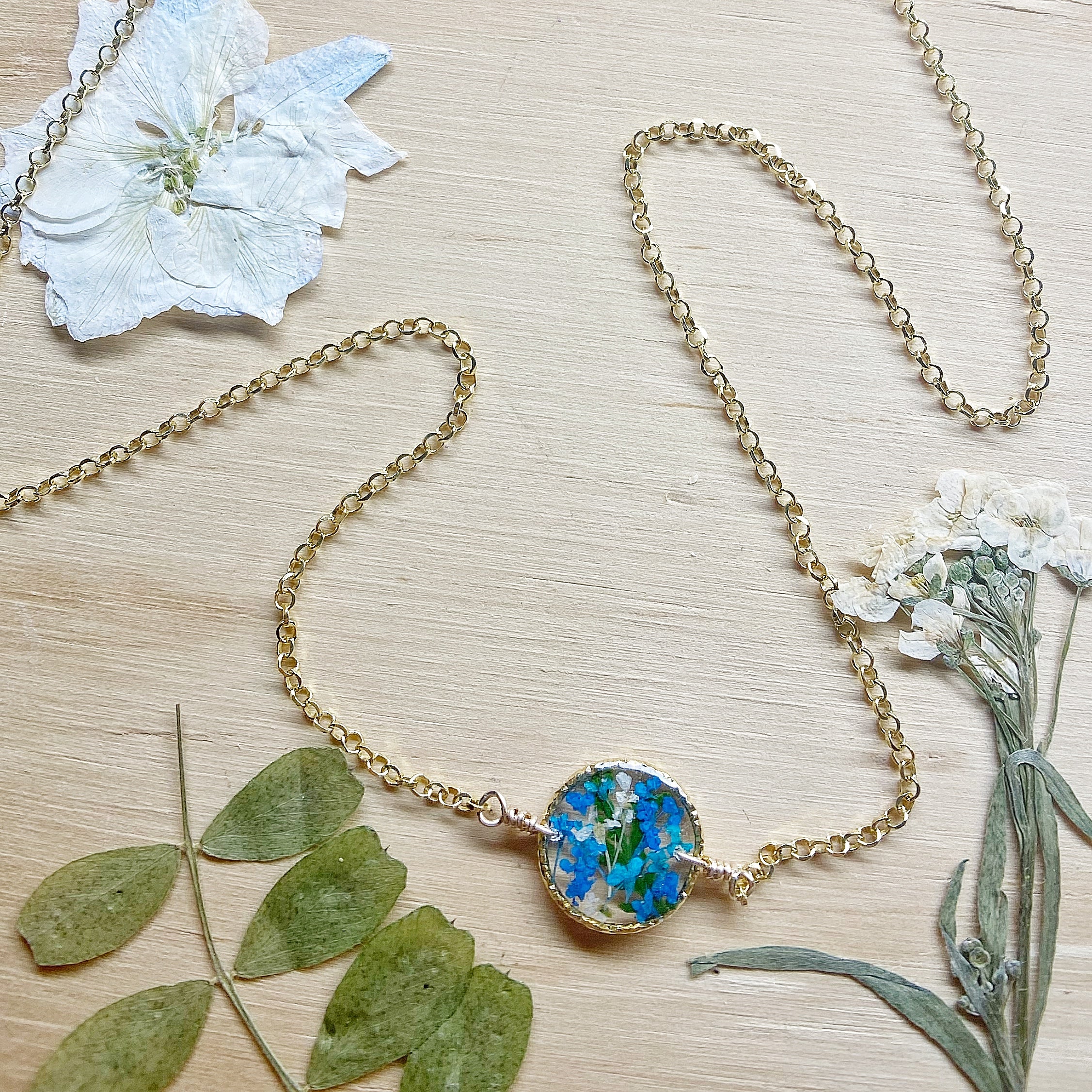 Real flowers botanical garden necklaces designed with natural flowers and green ferns encased in resin. Each necklace is sold separately. Please select your design style at checkout.