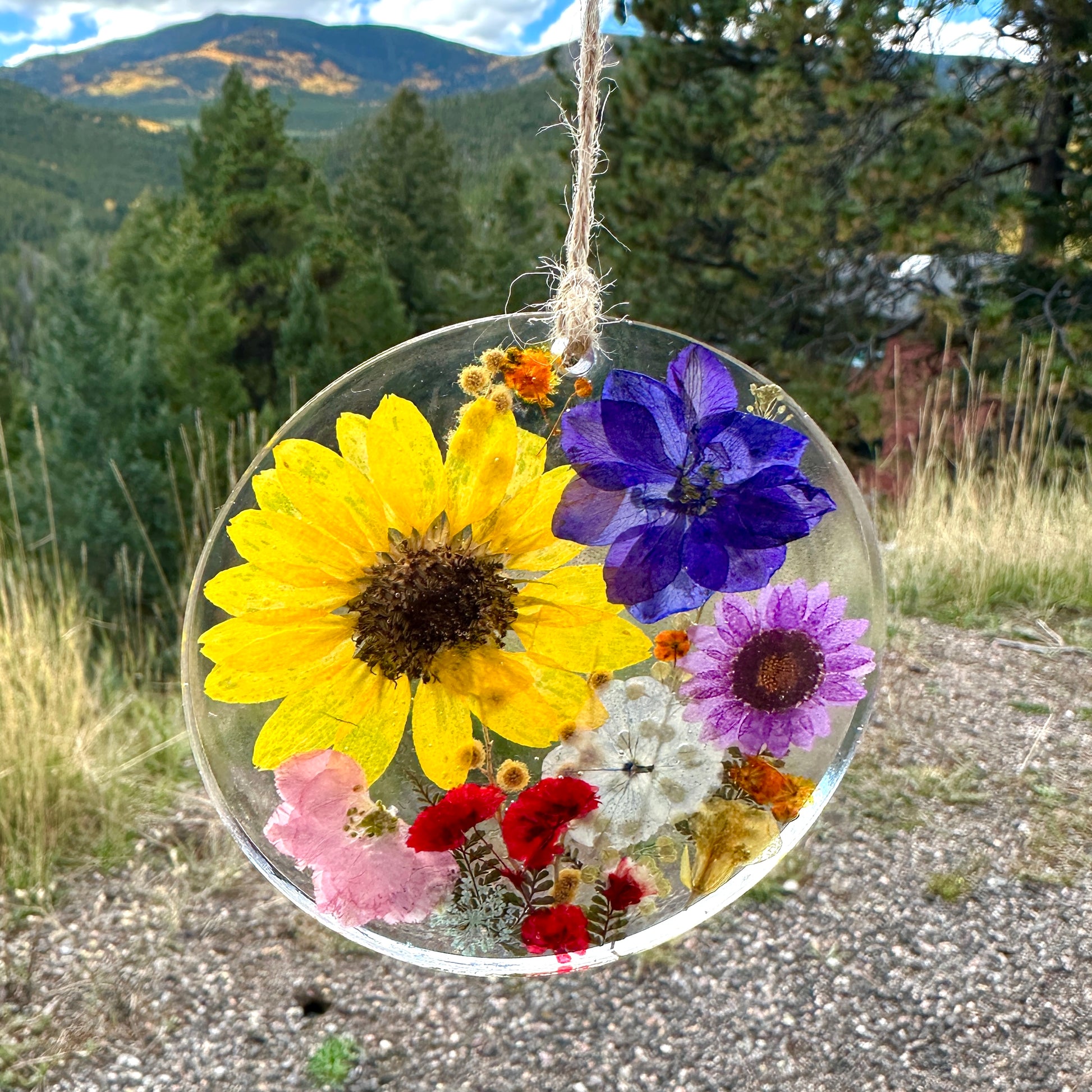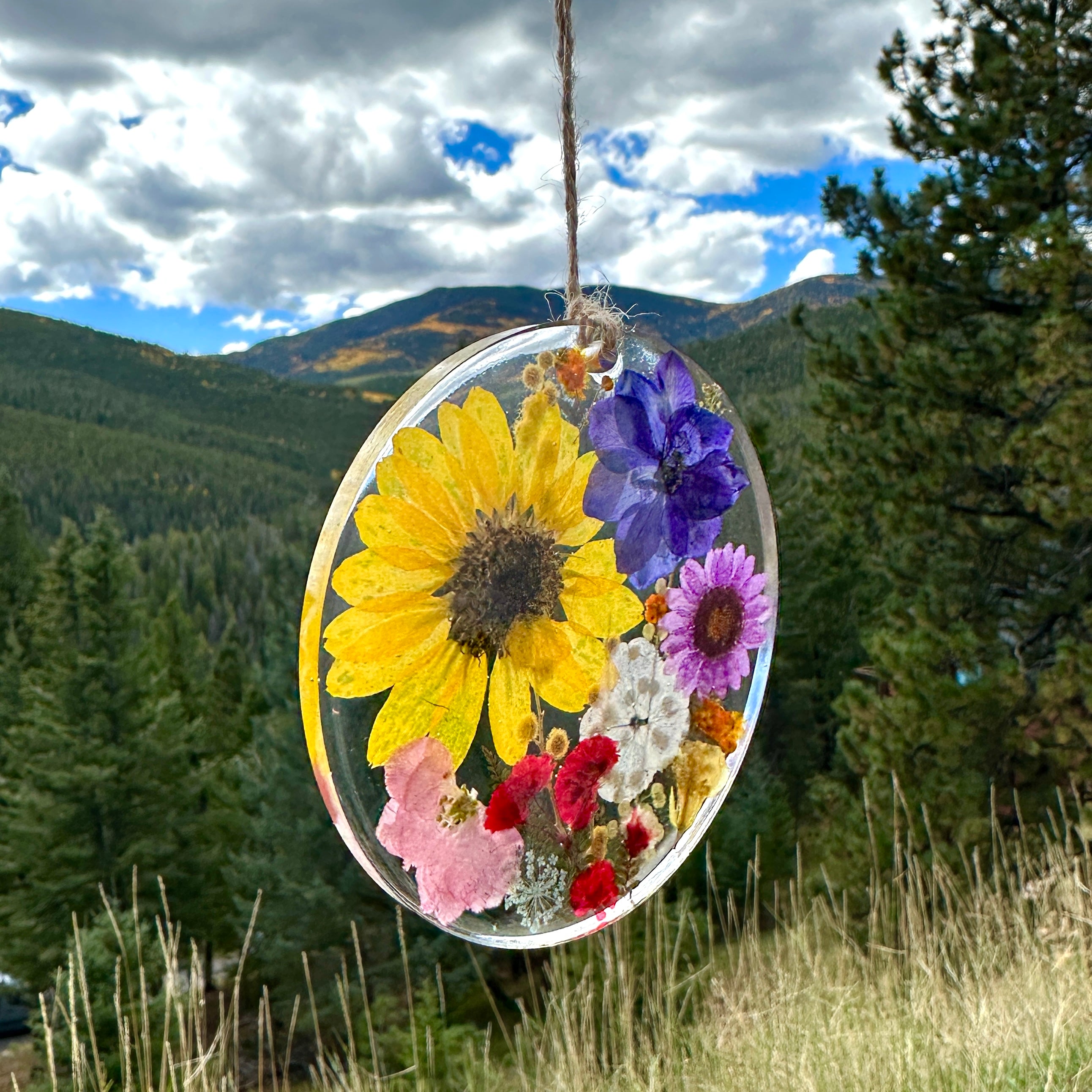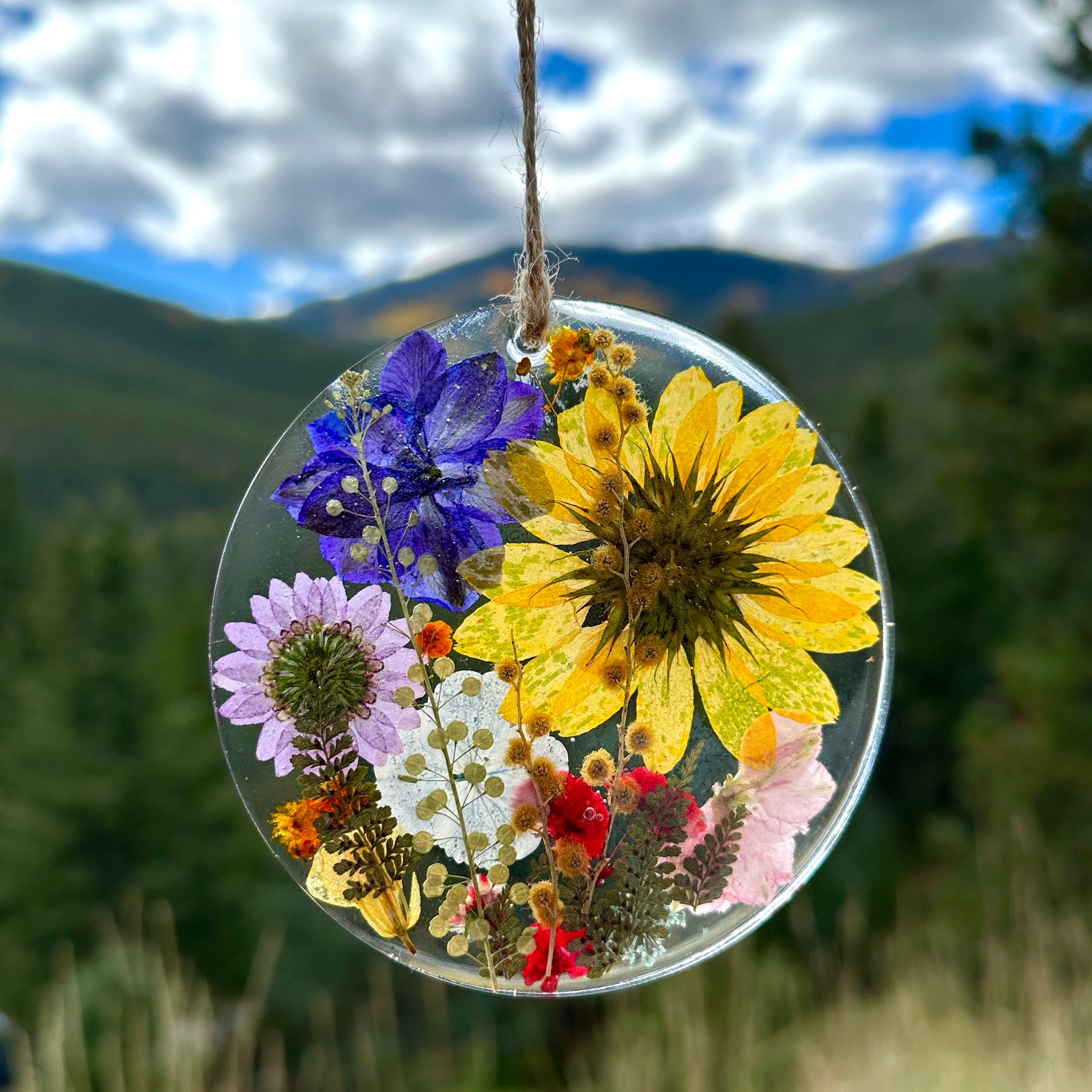 š¼Handmade botanical resin ornament designed with natural pressed flowers of sunflowers, daisies, larkspur, violet, queen anneās lace, ferns and more. Ā