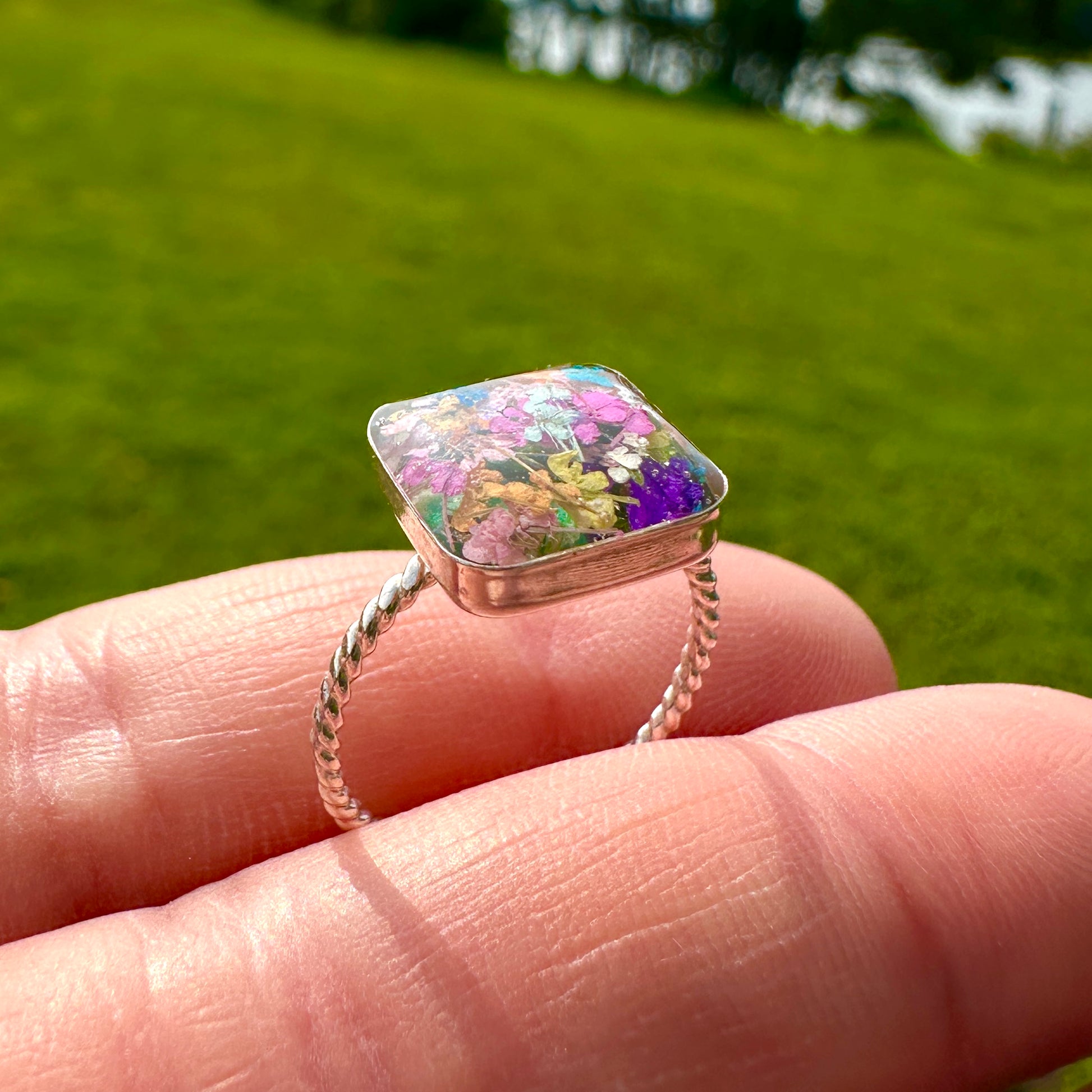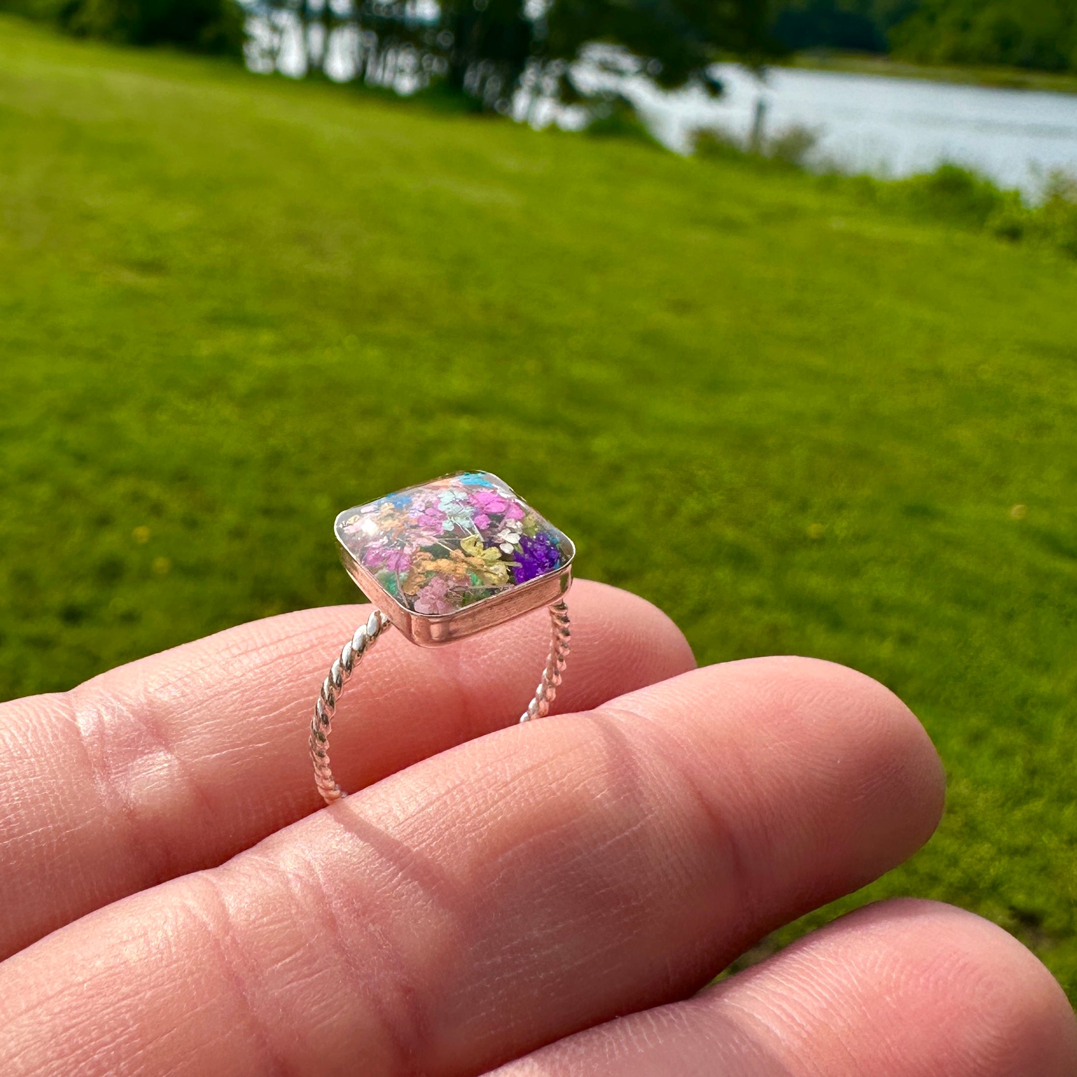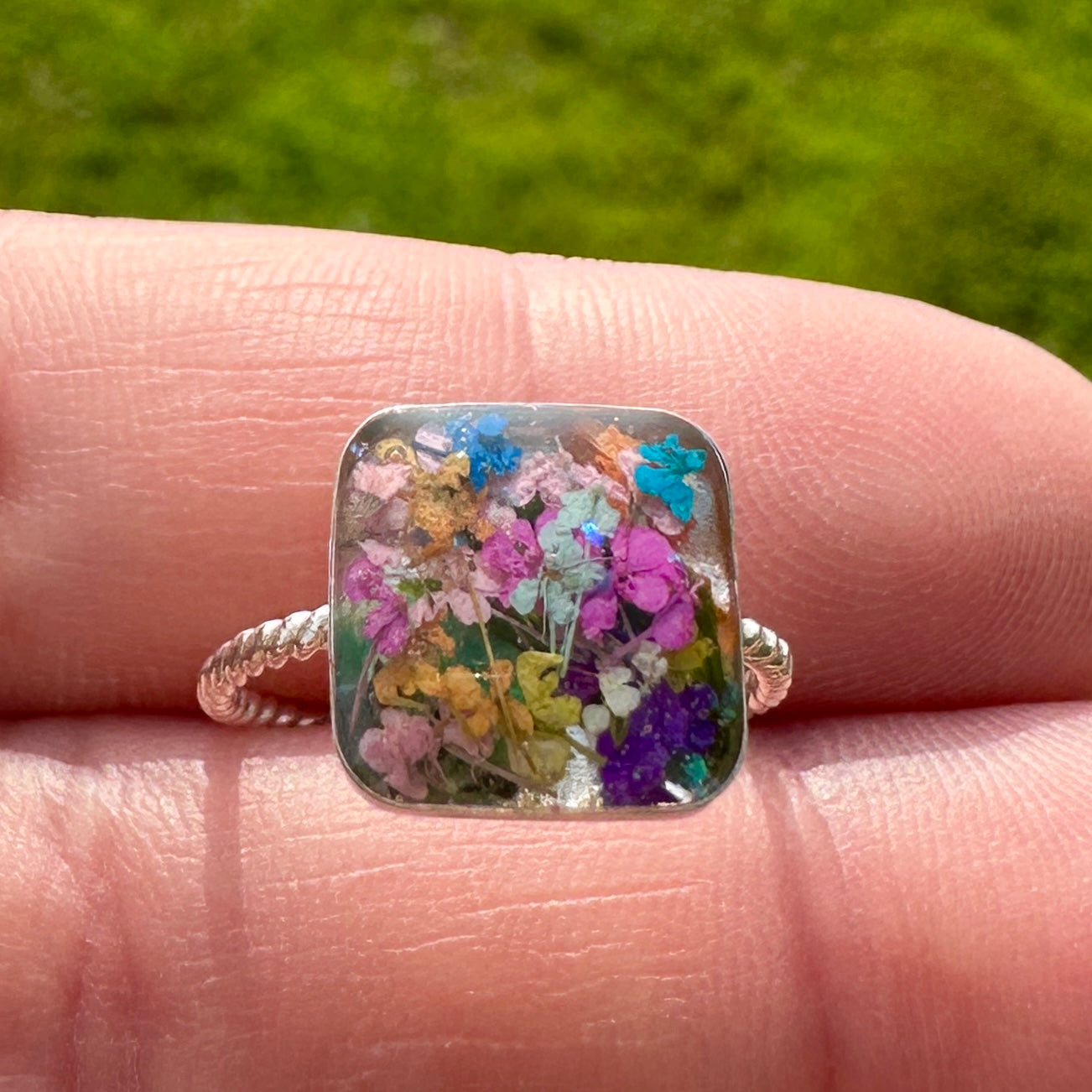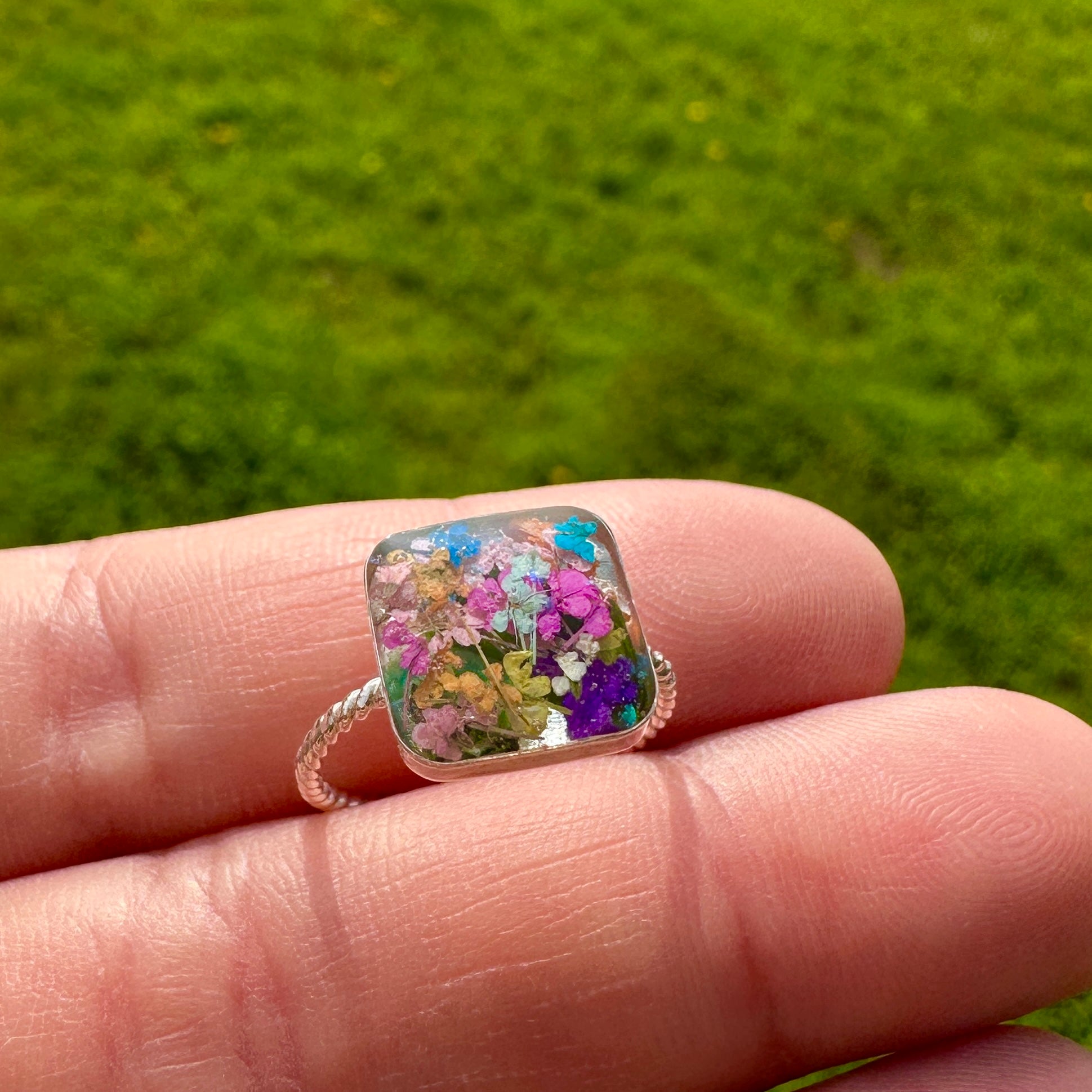 🌸One of a kind, handmade real flowers terrarium ring with a happy bouquet of natural tiny flowers, ferns and iridescent opal gemstones. This ring can layer perfectly with your everyday ring stack and add color, nature and happiness to your wardrobe🌼