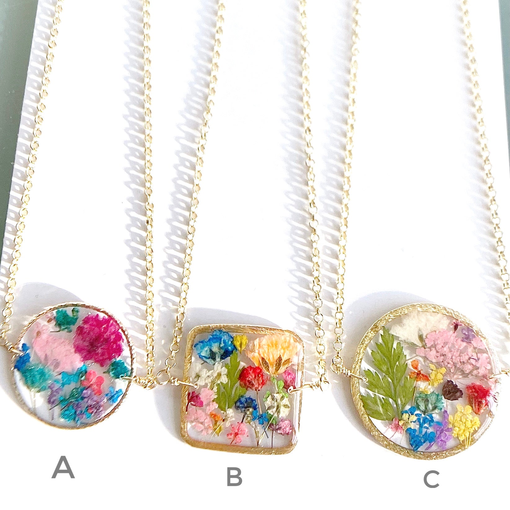 🌿 Style B - 20mm square pendant with vibrant multicolored flowers paired with 14kt gold-filled. $55