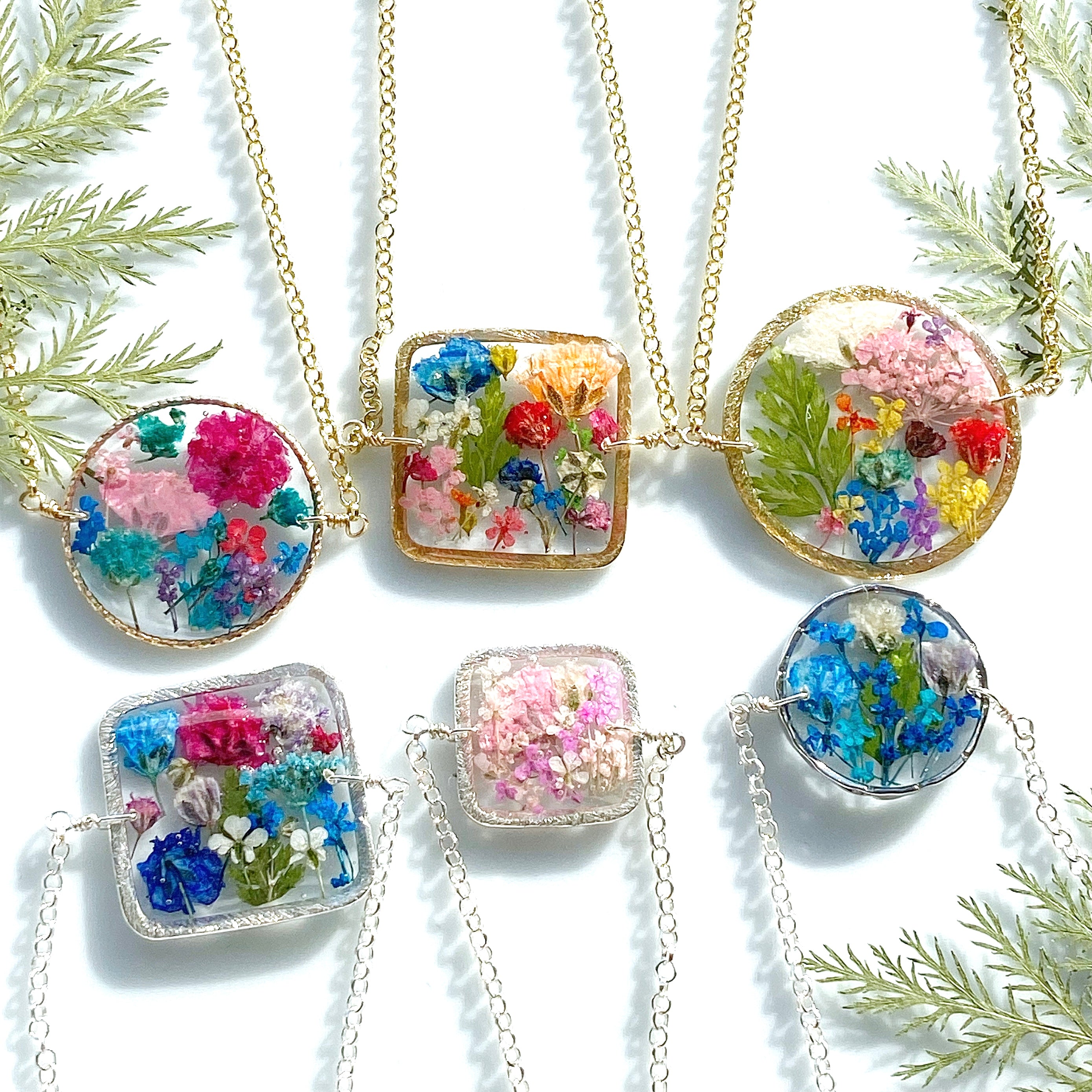 🌿 Style C - 25mm round pendant with colorful cheerful flowers and ferns paired with 14kt gold-filled. $65