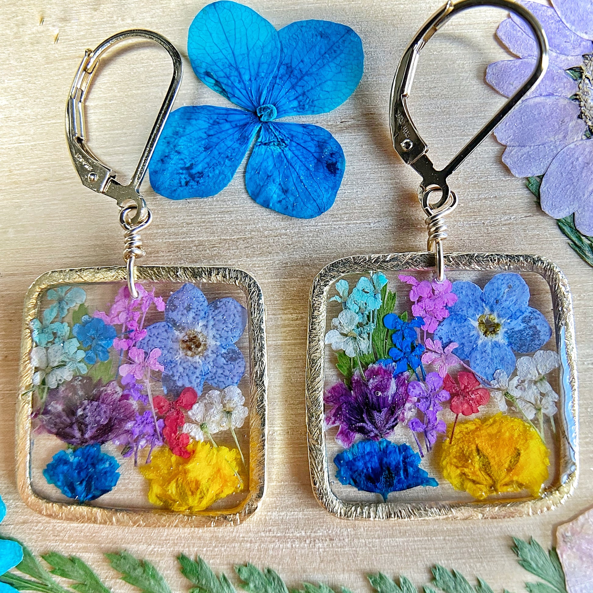 🌺🌸Colorful and joy-filled botanical garden earrings designed with natural flowers and ferns preserved in resin.