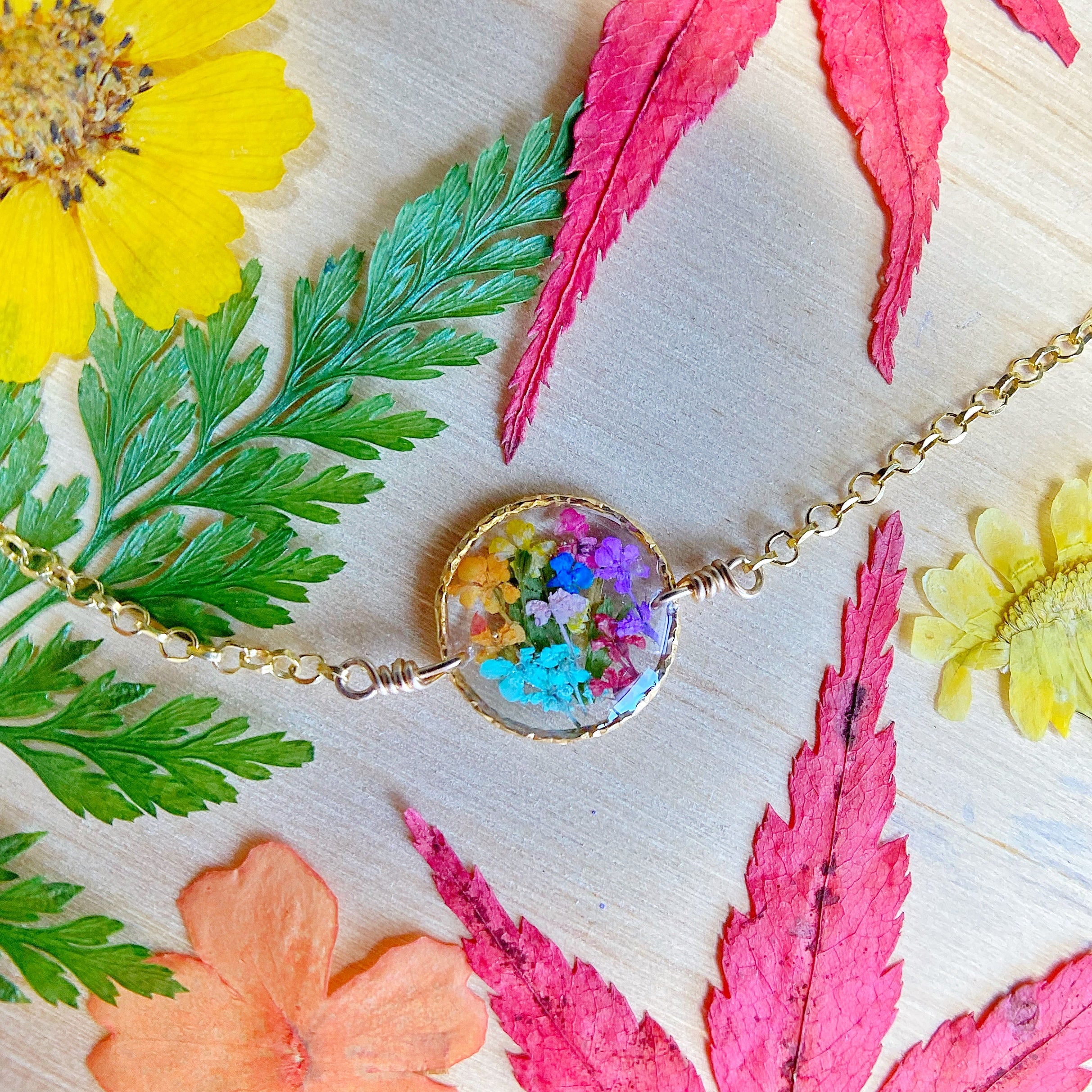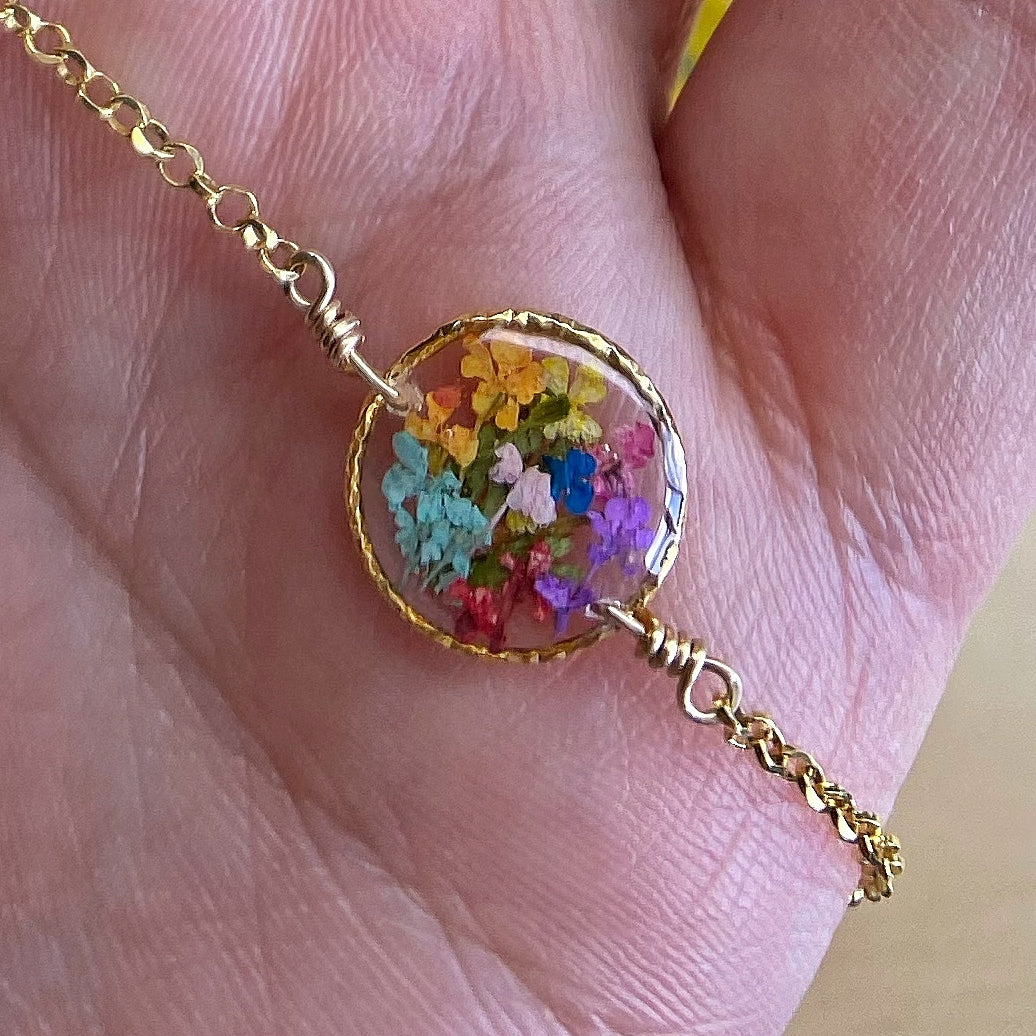 Escape to the colorful land of Murano with this one of a kind botanical garden necklace designed with real flowers preserved in resin. Β 14kt gold-filled necklace chain is included.