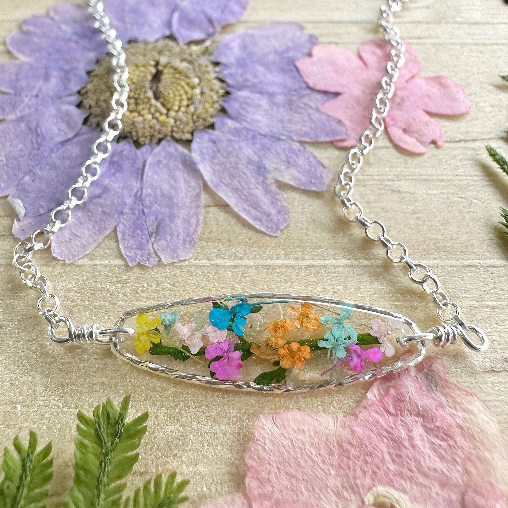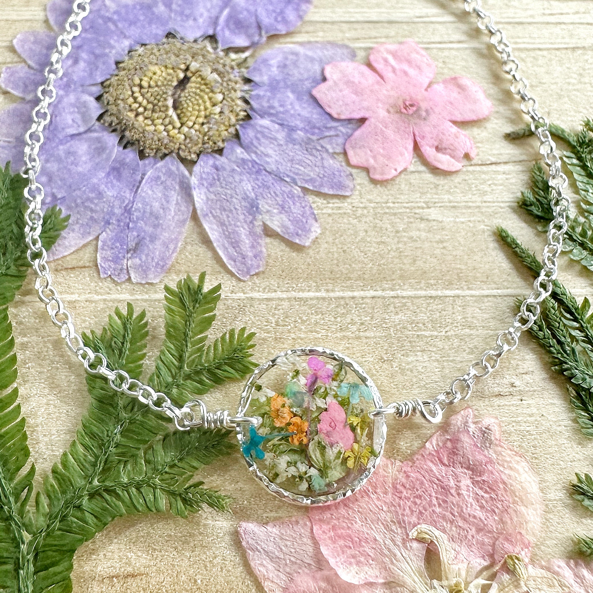 Real flowers botanical garden necklaces designed with pastel multicolored natural flowers, green ferns and a hint of iridescent opal gemstones preserved in resin. Each necklace is sold separately. Please select your design style at checkout.