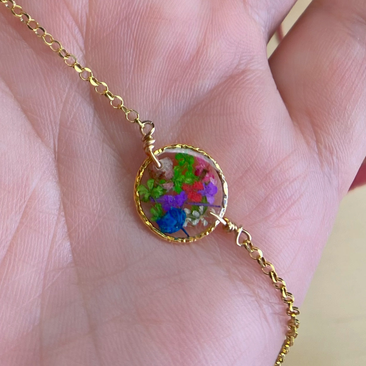 Step into the natural beauty of Positano with this one of a kind botanical garden necklace designed with real flowers preserved in resin. Β 14kt gold-filled necklace chain is included.