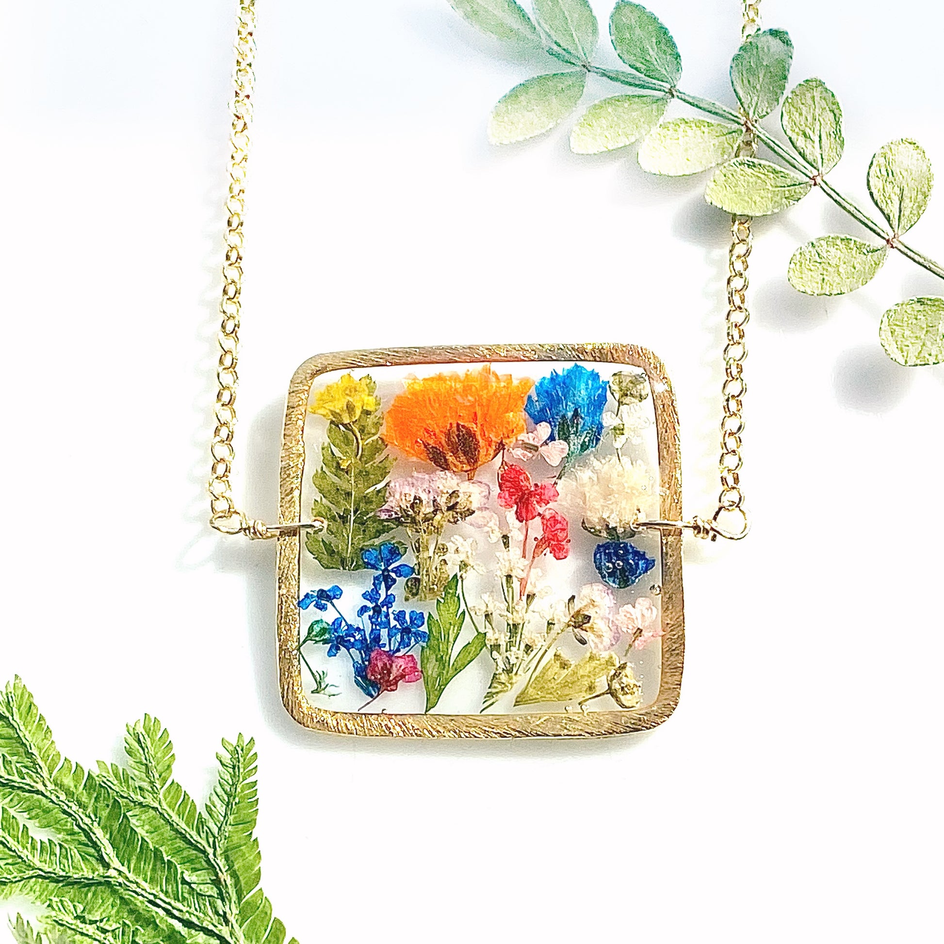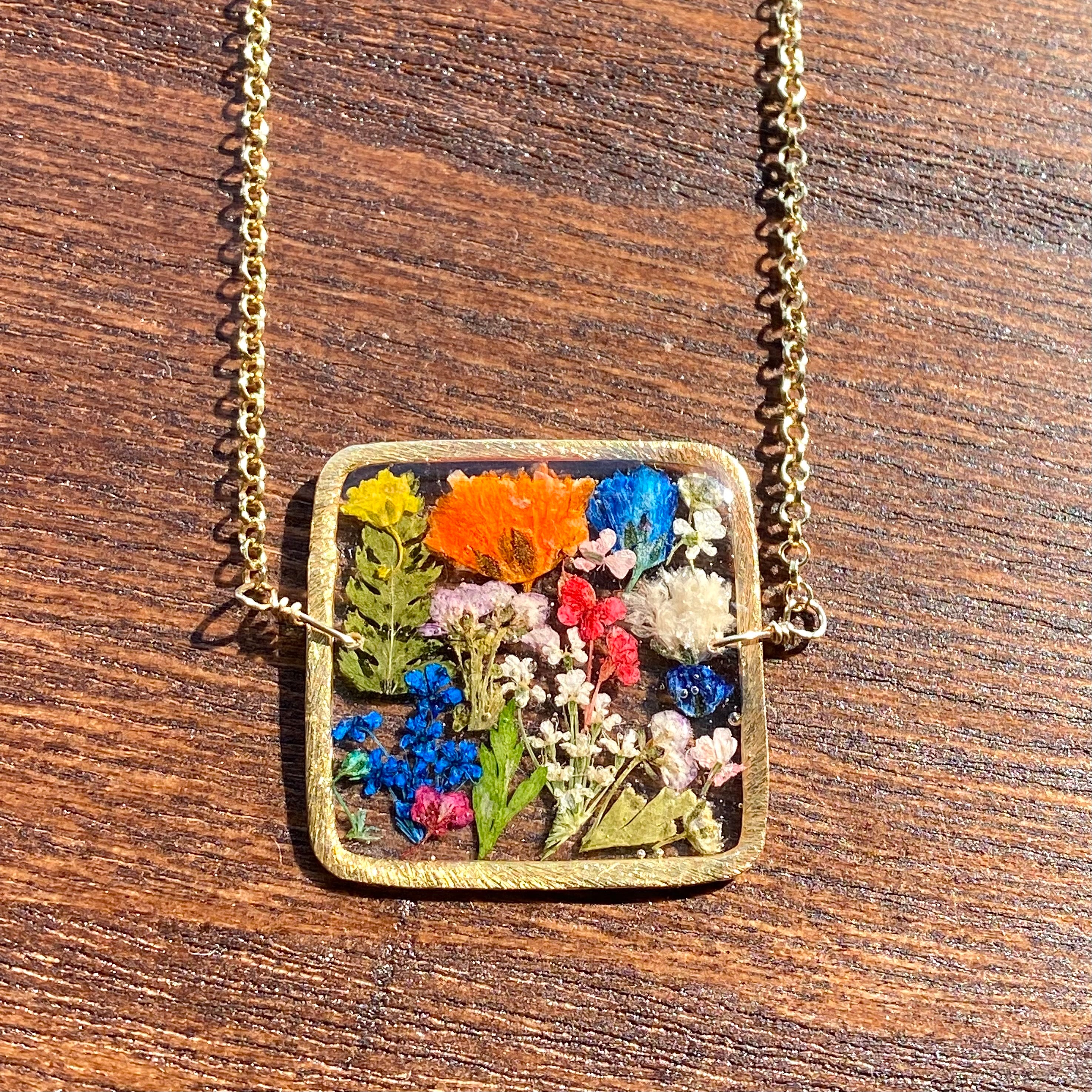 🌺One of a kind handmade necklace designed with a beautiful collage of natural real wildflowers encased in clear resin and finished with 14kt gold-filled details. 🌸