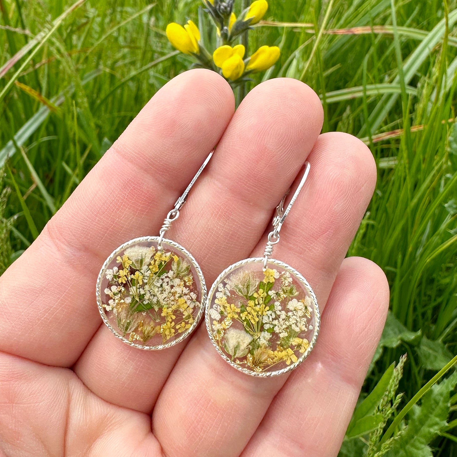 🌻Yellow and white botanical garden earrings designed with a glorious bouquet of queen anne’s lace flowers, baby’s breath flowers and natural ferns. These flowers are dried, pressed and preserved in resin.