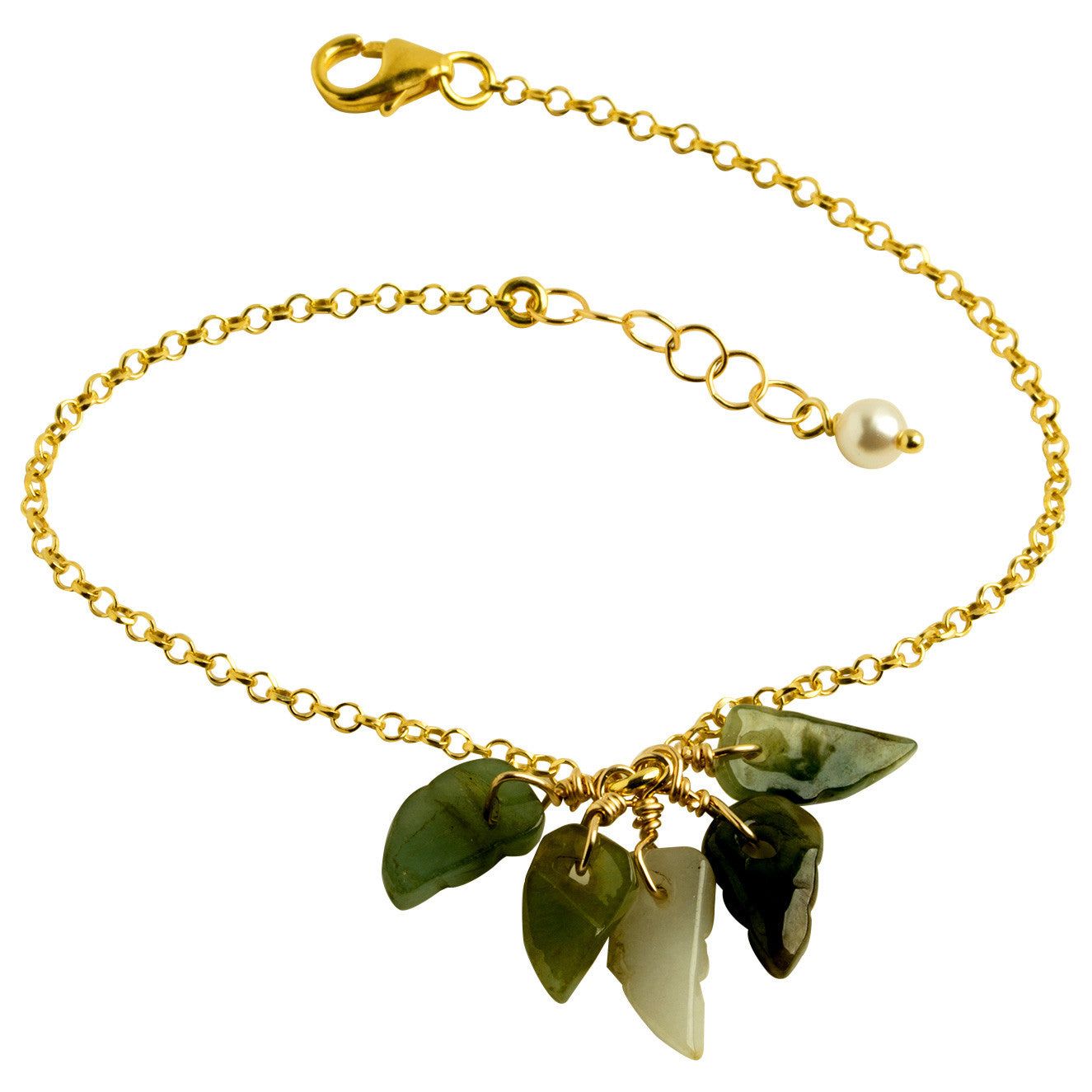 Natural Burmese jade stones shaped as leaves adorned on an adjustable 14kt gold -filled chain bracelet. Also available in sterling silver.