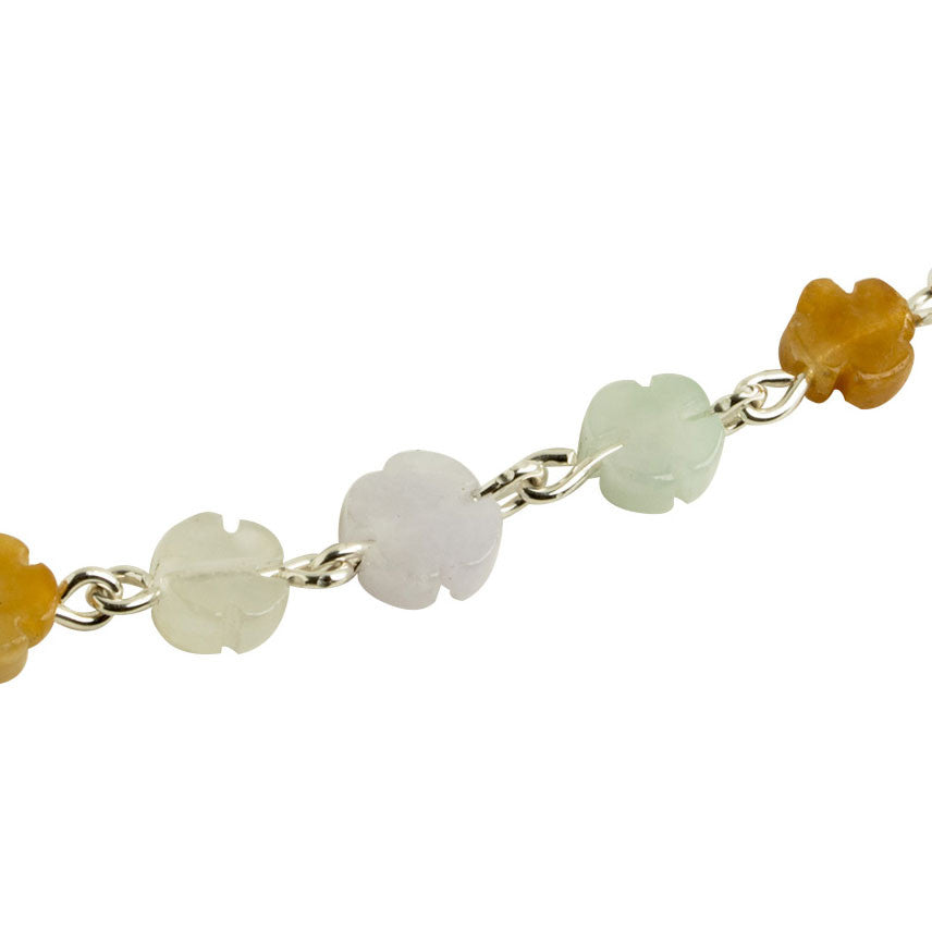 Natural Burmese jade flowers adorned on an adjustable sterling silver chain bracelet. Also available in 14kt gold-...