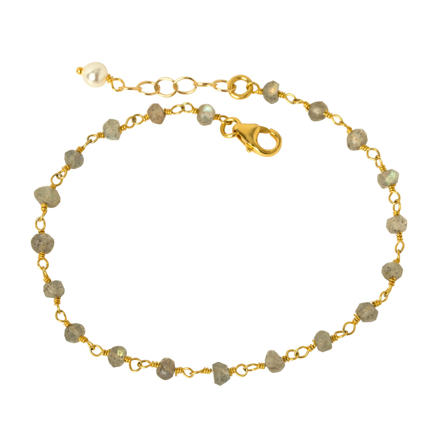 Beautiful, natural labradorite stones wire-wrapped together in this delicate, elegant bracelet. Available in 14kt gol...