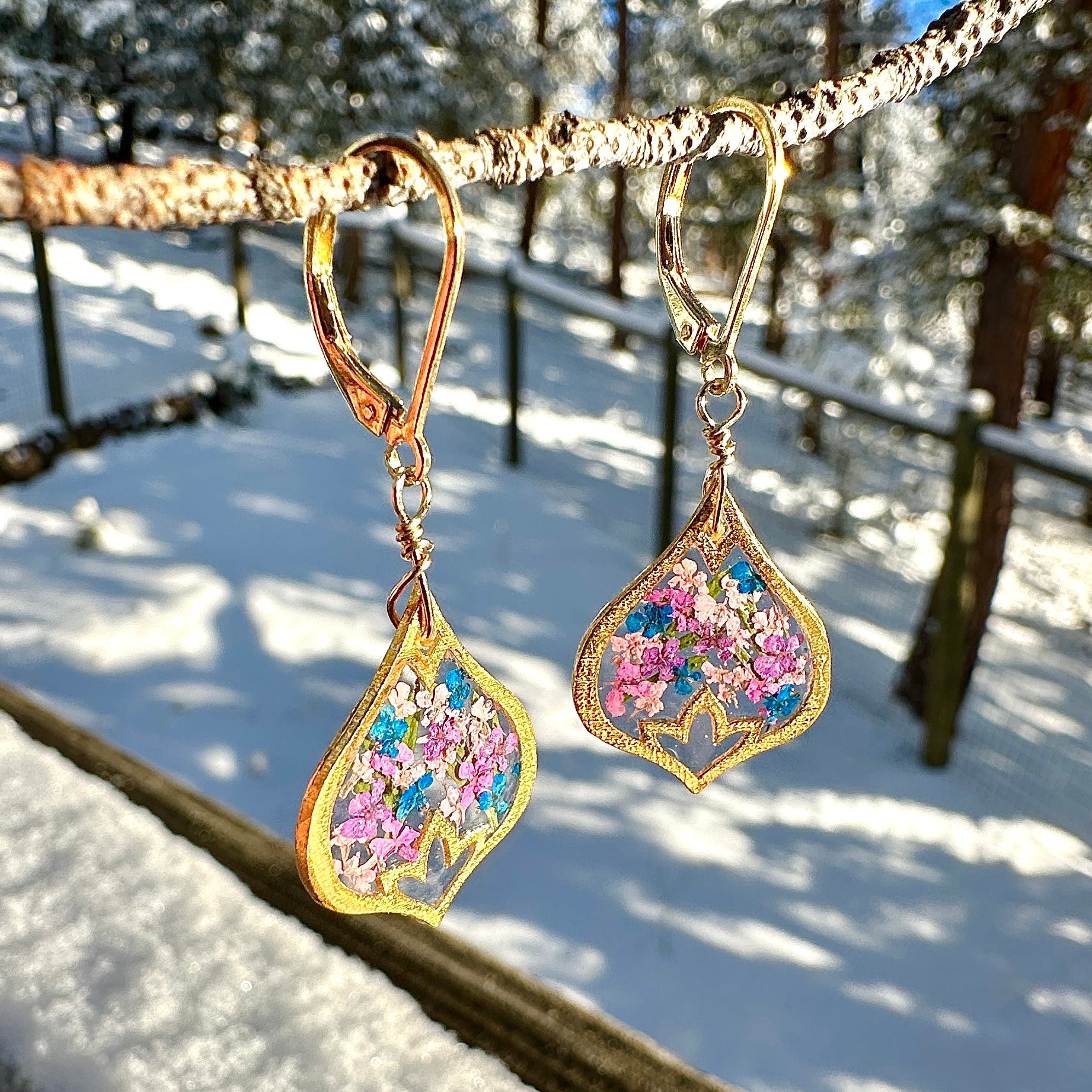 Handcrafted lotus flower earrings featuring real Queen Anne’s Lace petals in pinks and blues preserved in clear resin. Set in 14k gold-filled metal for a warm glow and long-lasting wear. A delicate blend of nature, symbolism, and everyday elegance.