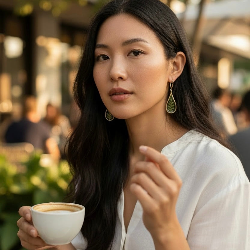 Crafted with care, each earring features a graceful fern design in vibrant green tones that catch the light and turn heads. Whether you’re dressing up for a special occasion or adding a fresh accent to your casual outfit, these earrings offer a unique, earthy charm that never goes out of style.