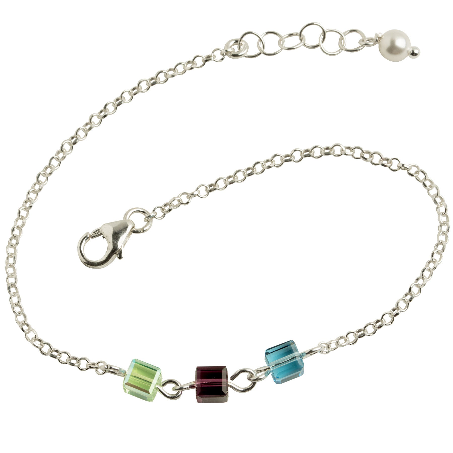 Peridot green, amethyst purple and aquamarine Swarovski crystal cube bracelet designed with sterling silver. Size is adjustable 6 1/2" - 7 1/2" inches. Also available in 14kt gold-filled.
